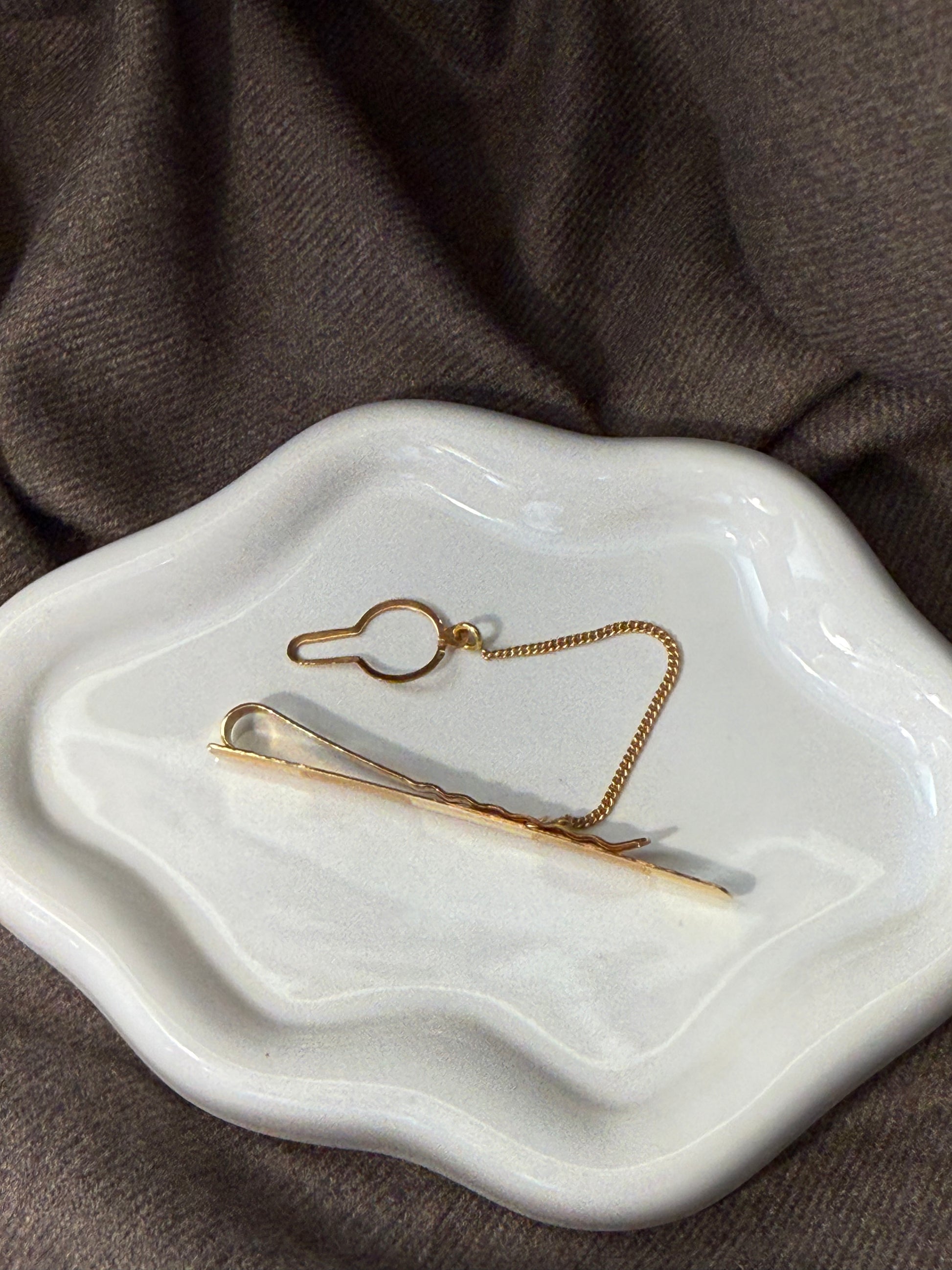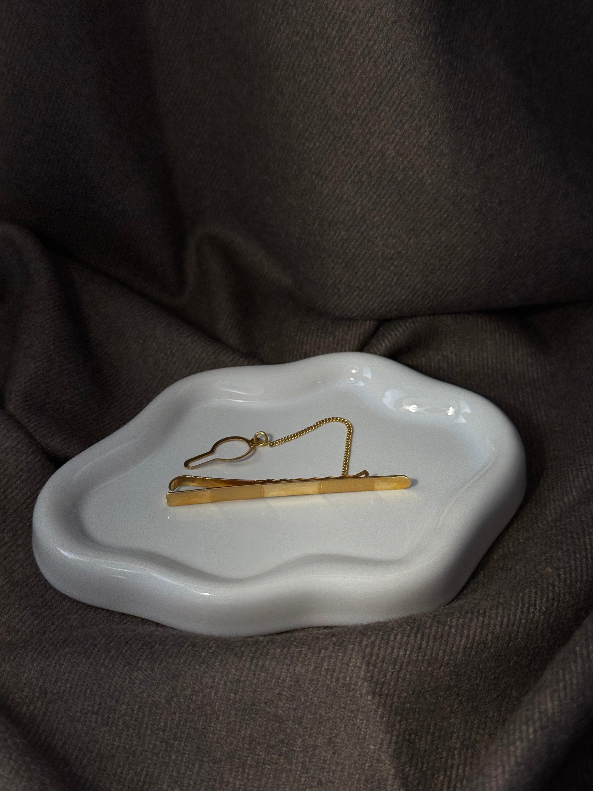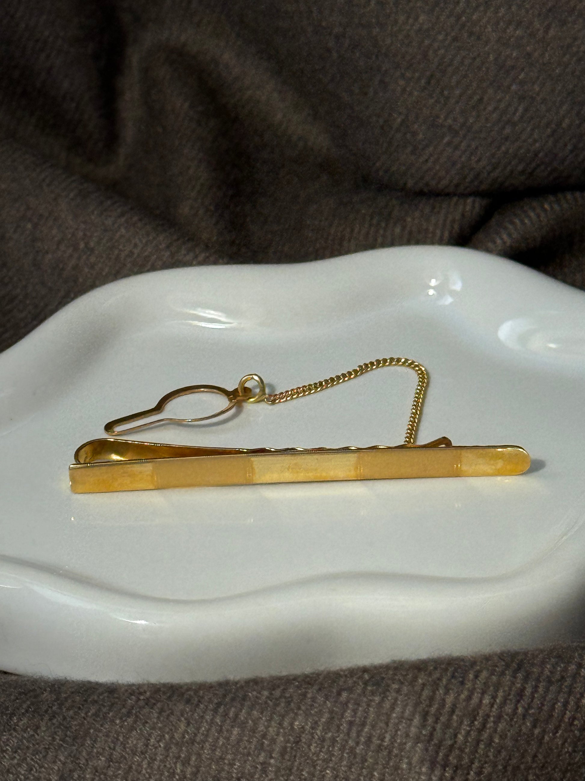 Este alfinete em ouro é um tributo à sofisticação discreta. Com linhas retas e acabamento polido, é acompanhado de uma corrente fina com presilha, reforçando o seu carácter tradicional e distinto. Ideal para quem aprecia a elegância masculina com um toque de autoridade refinada.