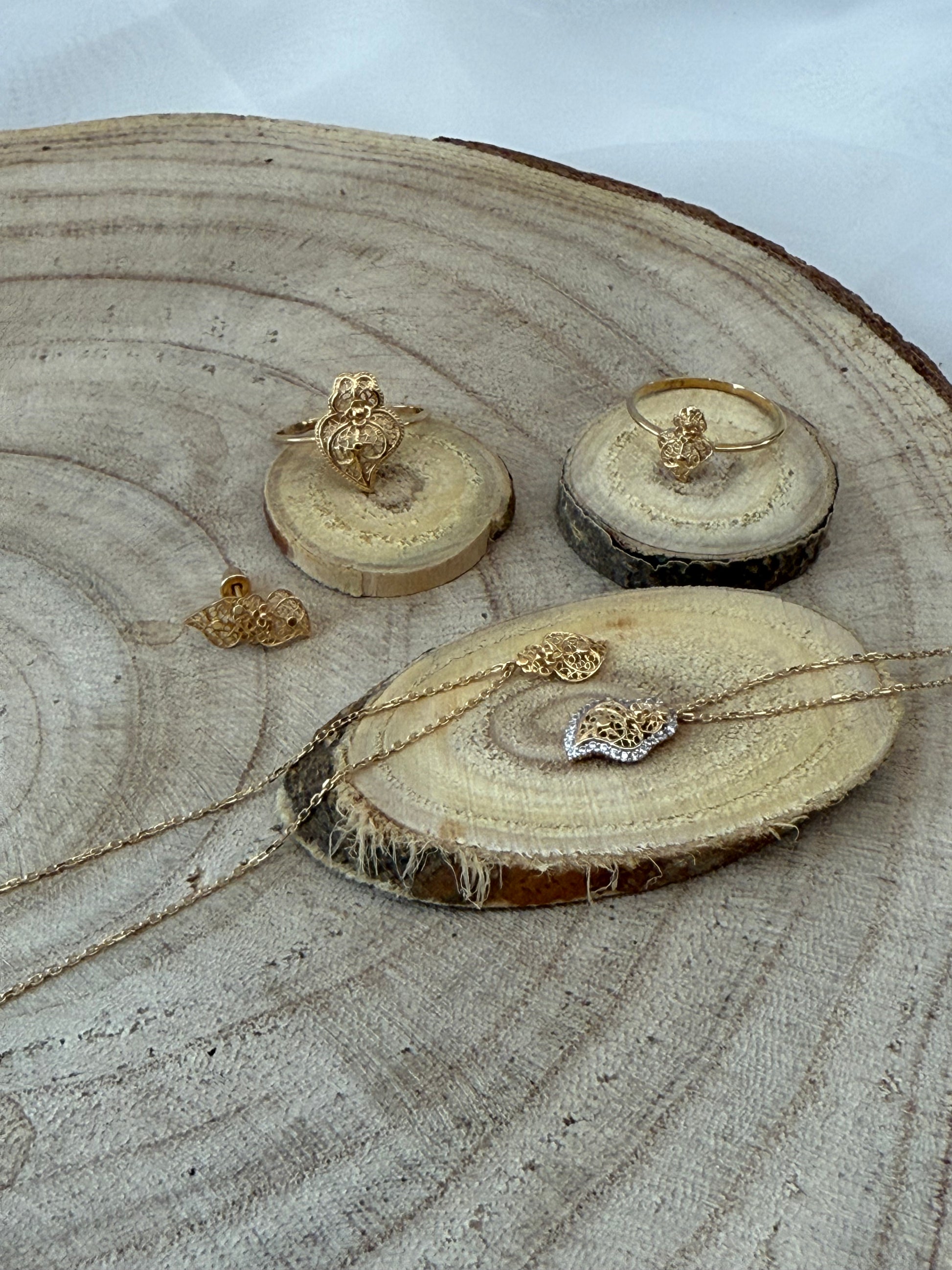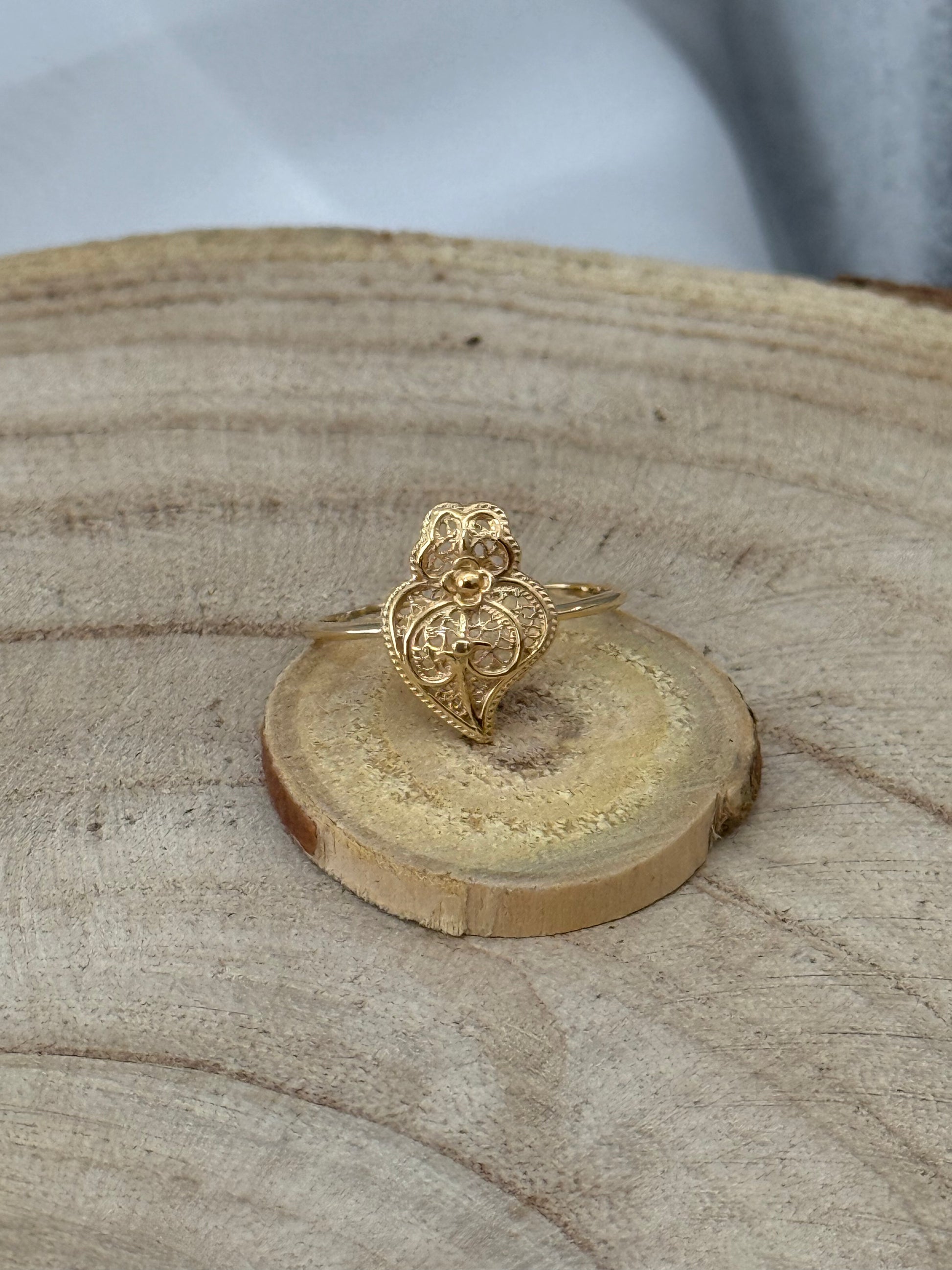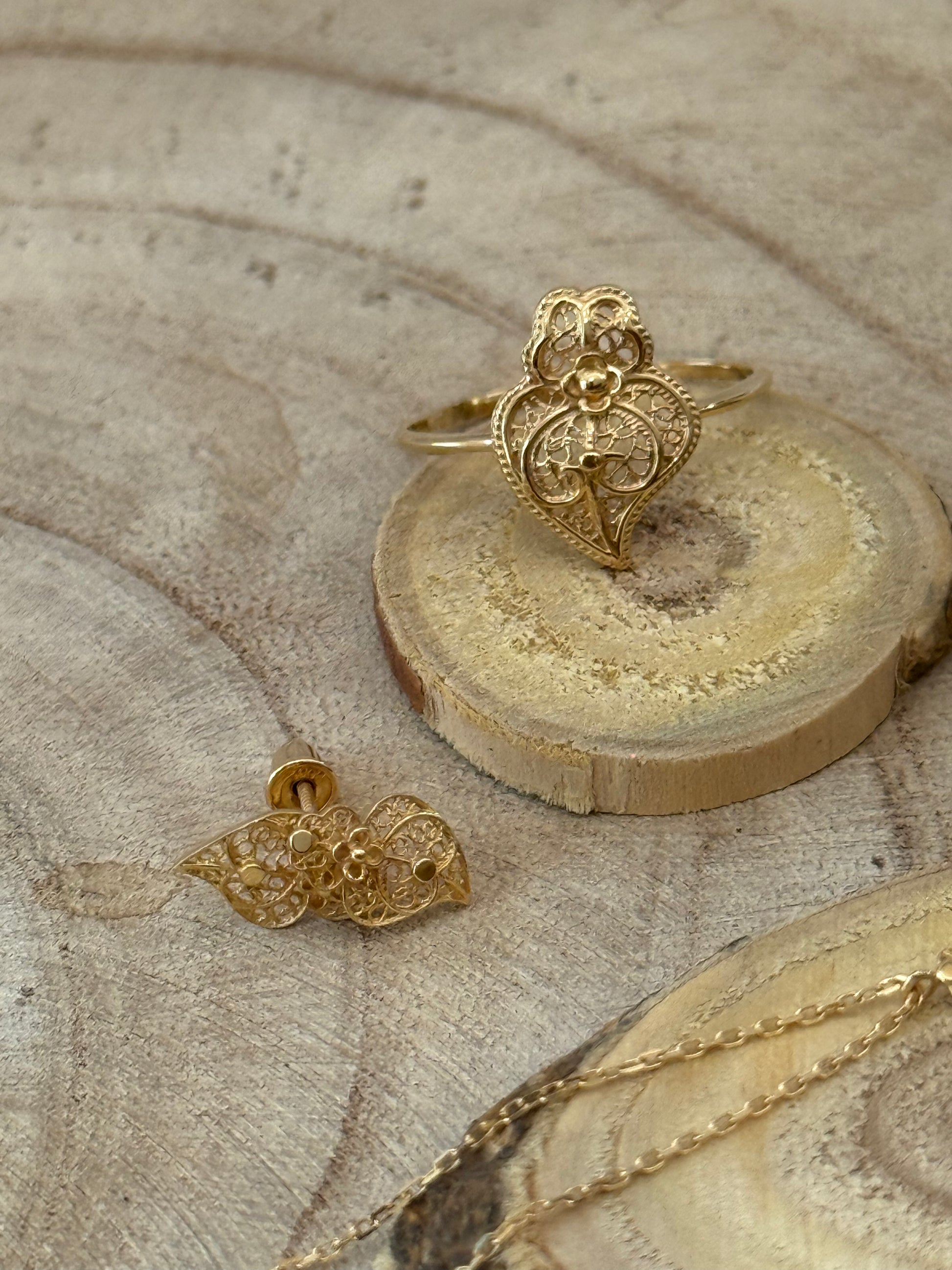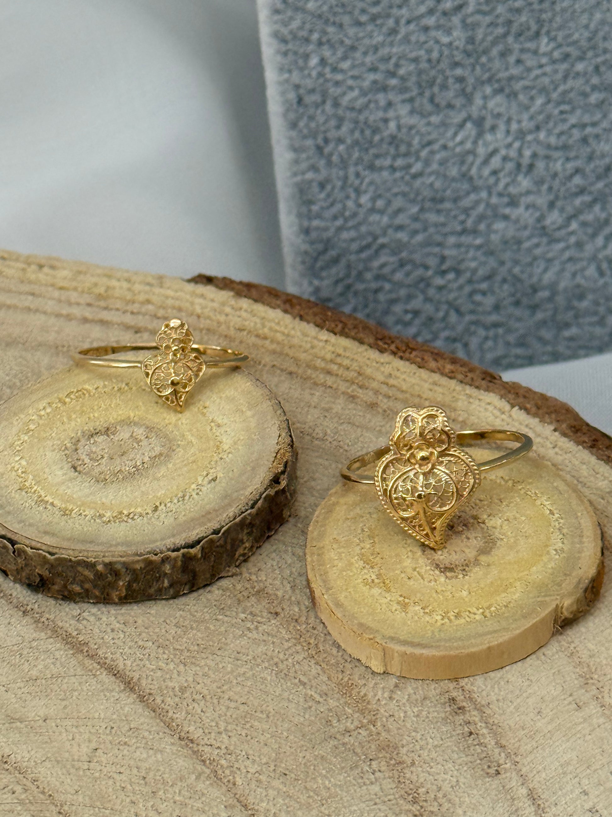 Este anel em ouro celebra a riqueza da tradição artesanal com um coração mais elaborado, de linhas mais curvas e filigrana rendilhada. Um símbolo de identidade cultural e afetiva, pensado para quem honra as suas raízes com orgulho e leveza.