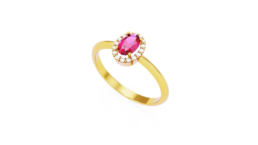 Anel em ouro 19,2kt (+-1,9gr) ou 9kt, com zircónia oval central cor rubi (6x4mm) rodeada por 16 zircónias brancas de 1,10mm. Uma joia vibrante e intemporal, perfeita para iluminar ocasiões especiais ou completar o conjunto Rubia com colar e brincos.