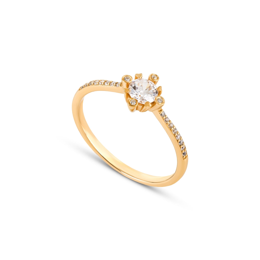 Anel em ouro 19,2kt (+-1,71gr) ou 9,2kt, com zircónia central de 4,25mm em destaque e 20 zircónias de 0,90mm cravadas ao longo do aro. Uma joia sofisticada que combina delicadeza e brilho intenso, perfeita para eternizar promessas e celebrar o amor em toda a sua força.