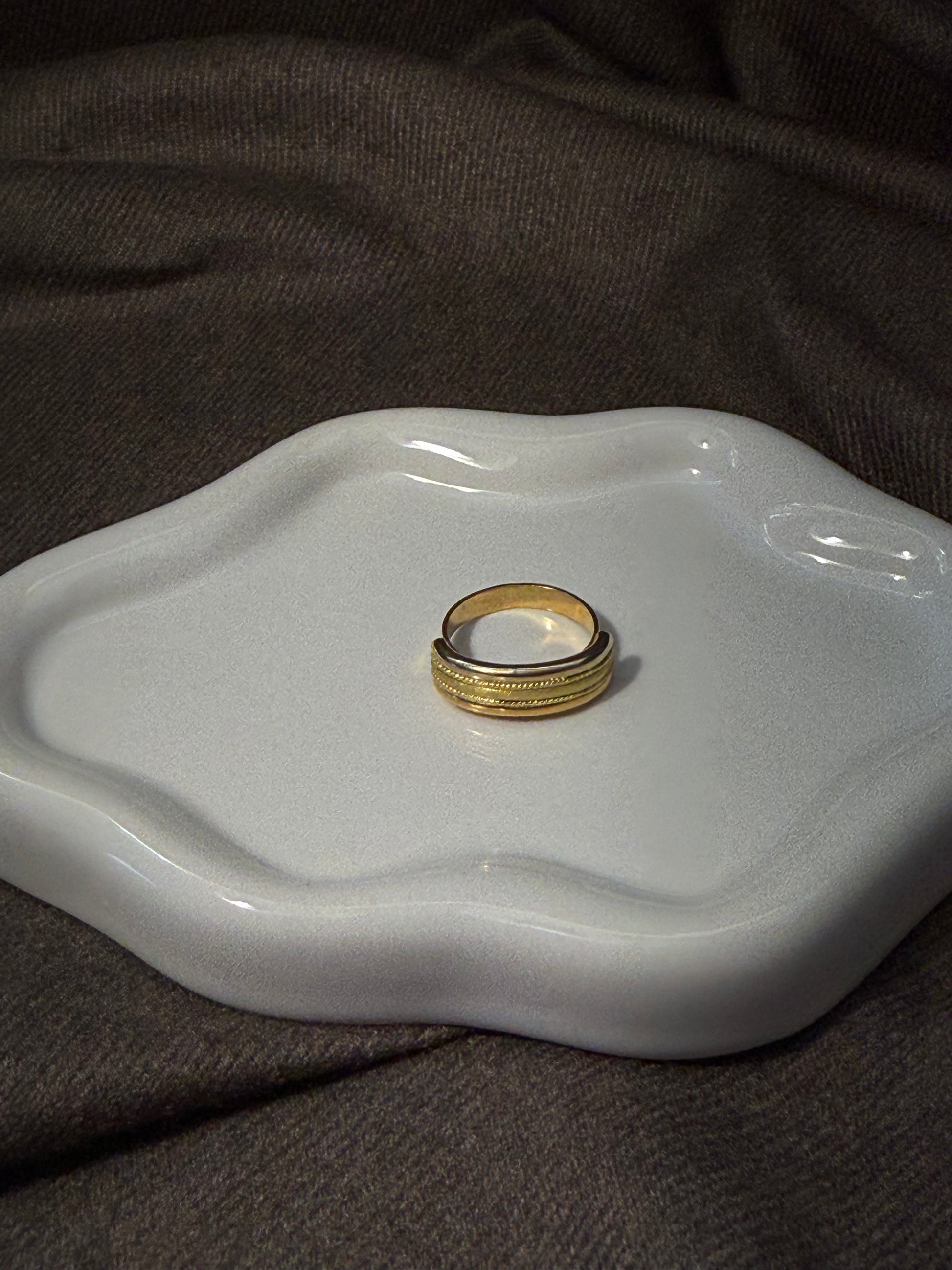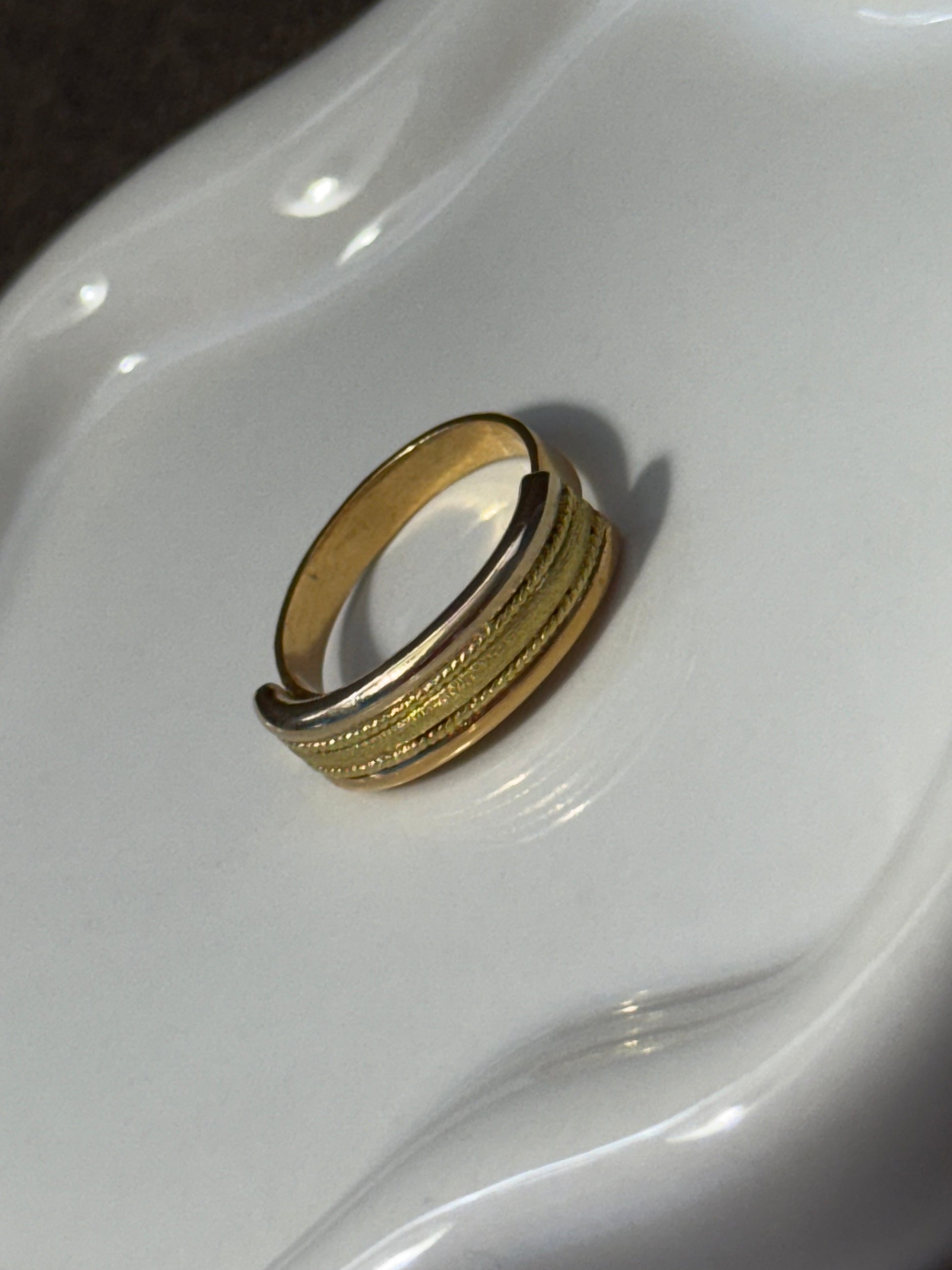 Este anel em ouro destaca-se pelo contraste entre acabamentos e pelas linhas entrançadas, que criam um ritmo visual sóbrio mas marcante. Uma peça de presença discreta, ideal para quem aprecia tradição com um toque contemporâneo.