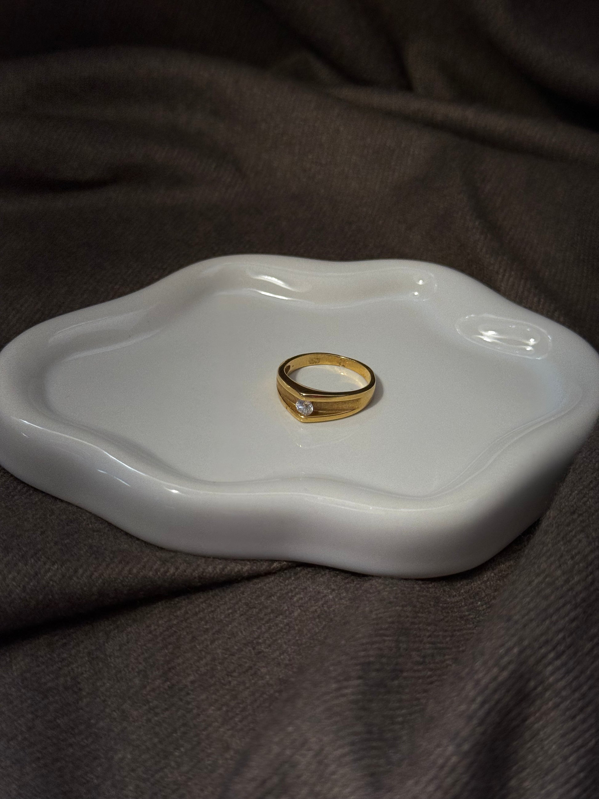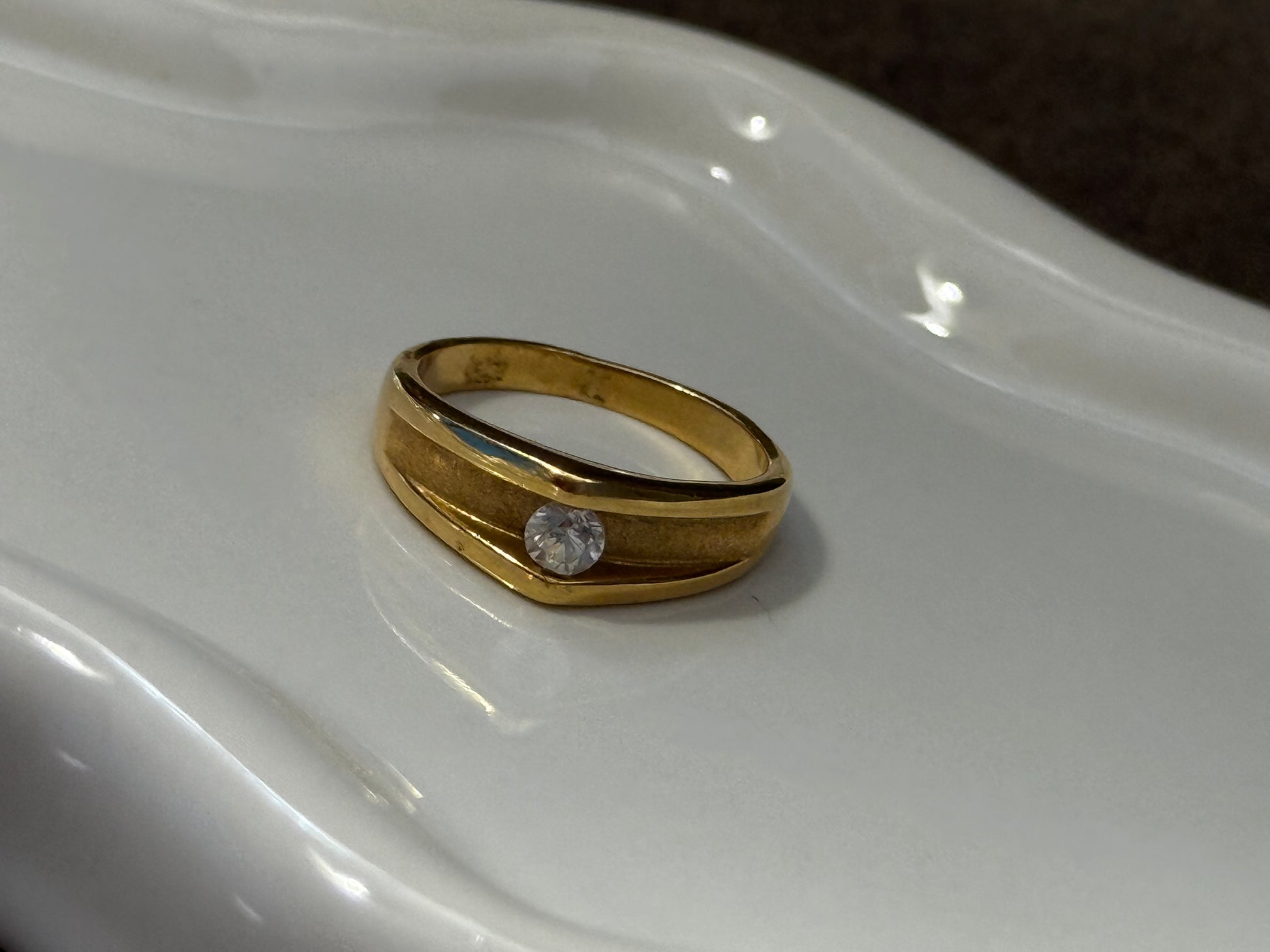 Com um design limpo e bem definido, este anel em ouro destaca-se pela linha central recuada e pela pedra redonda cravada com precisão. Uma peça sólida e versátil, ideal para quem aprecia elegância sem excessos.