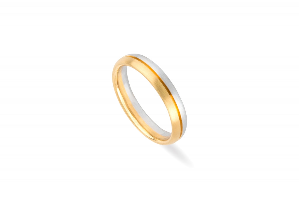 Aliança disponível em ouro 19,2kt (+-4,8gr), ouro 9kt ou prata, com 4mm de largura e 1,5mm de altura. O contraste entre o ouro amarelo e o tom branco cria um equilíbrio subtil e elegante, tornando esta peça uma expressão perfeita de complementaridade e união eterna.