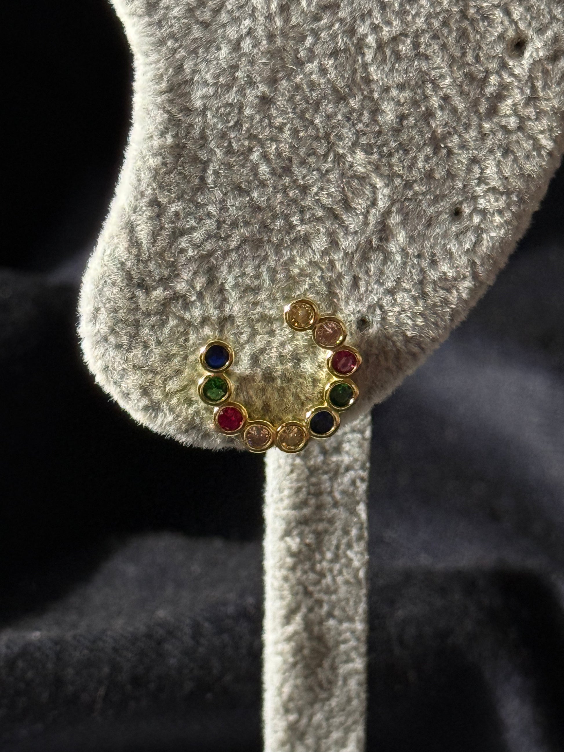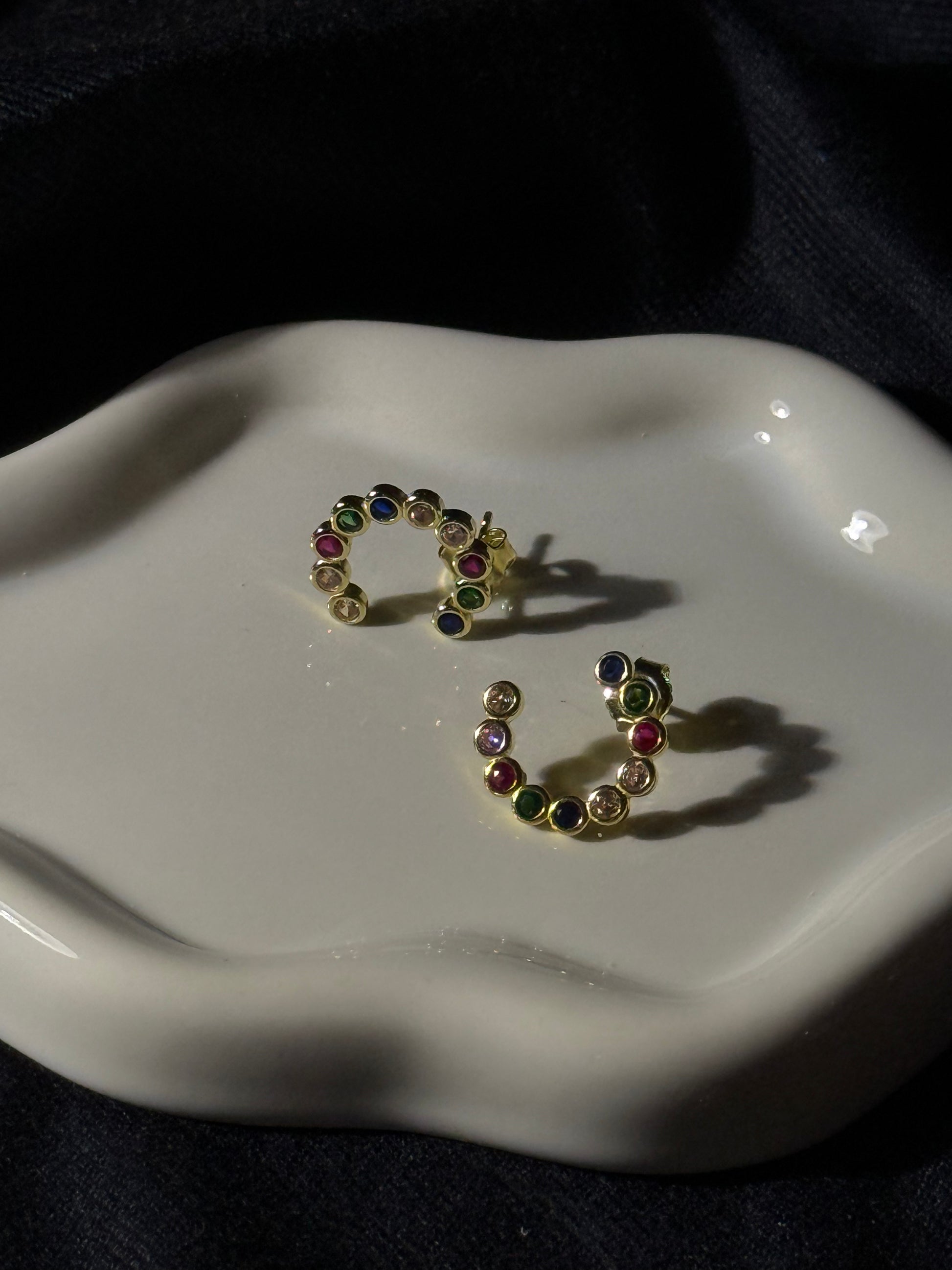 Os brincos Allegra celebram a leveza e o encanto em prata dourada. O design semicircular acolhe um conjunto de zircónias coloridas, criando um equilíbrio entre ousadia e elegância, ideal para quem gosta de marcar presença com graça.