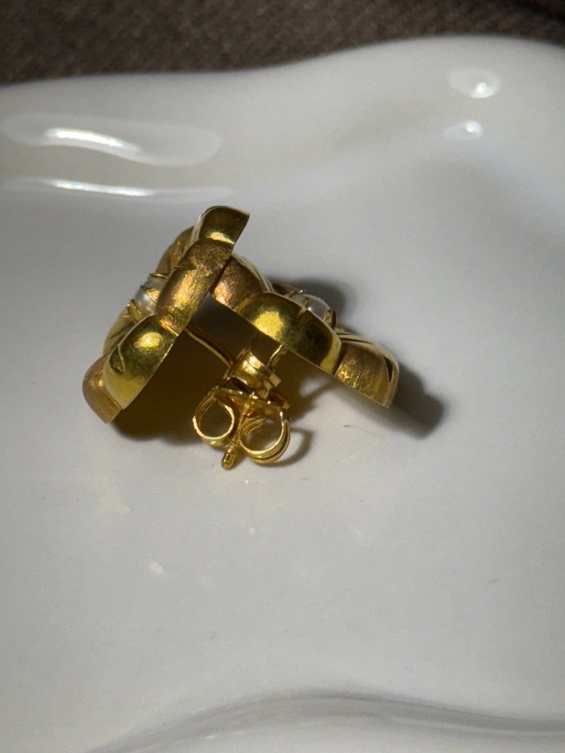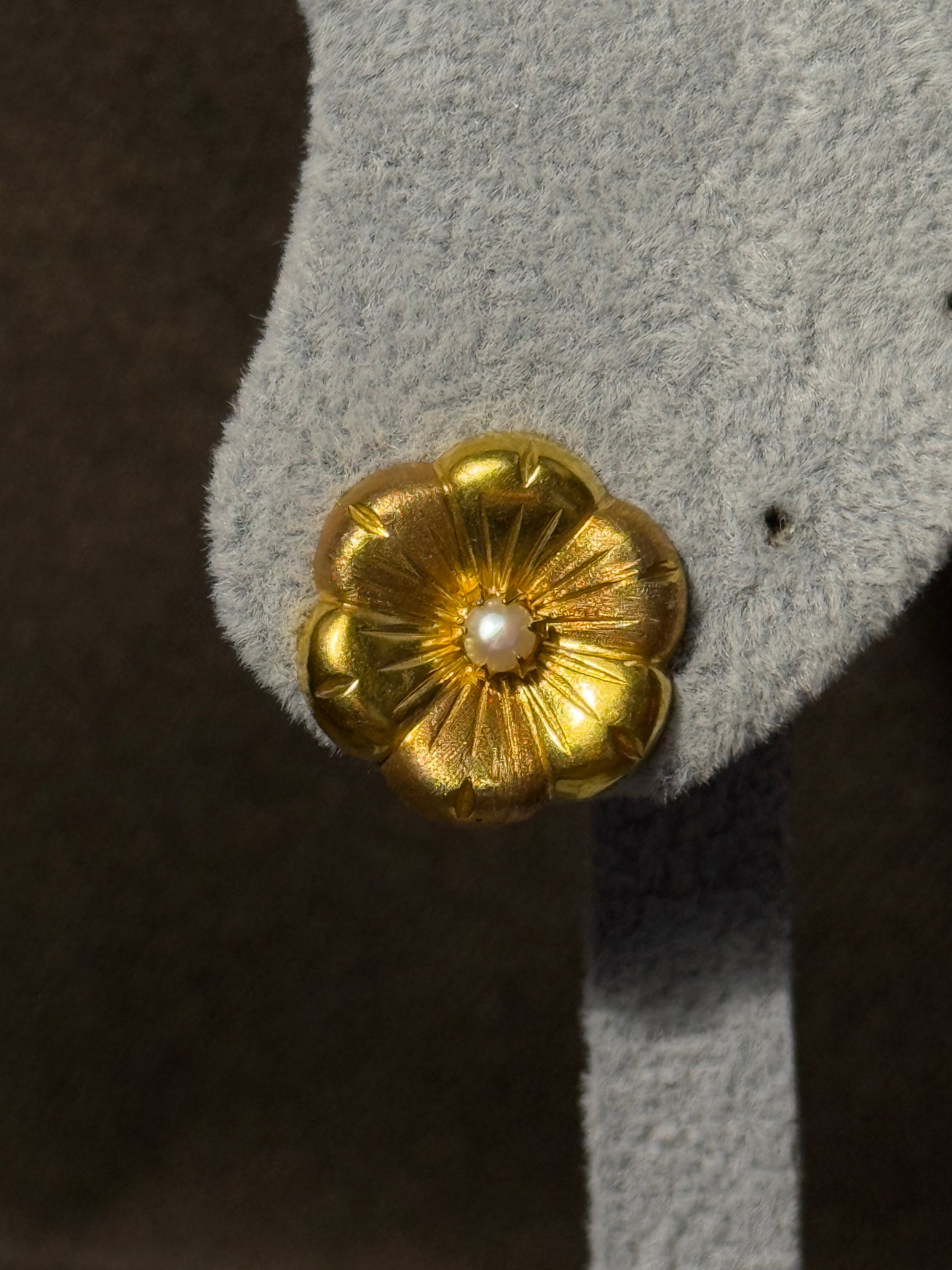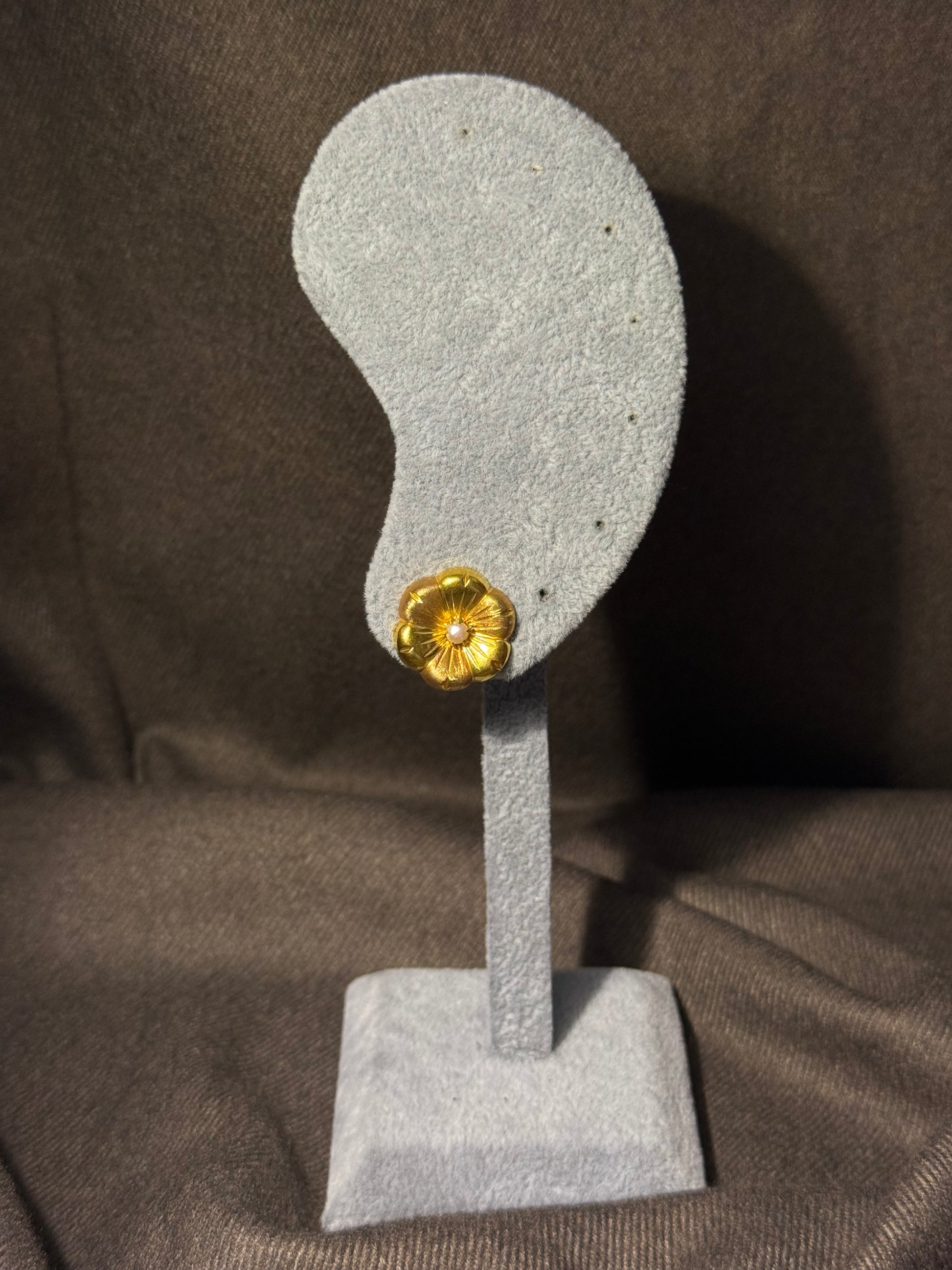 Um par de flores talhadas em ouro, com textura rica e pérolas no coração. Um modelo com volume, romantismo e brilho suave, pensado para iluminar com presença.