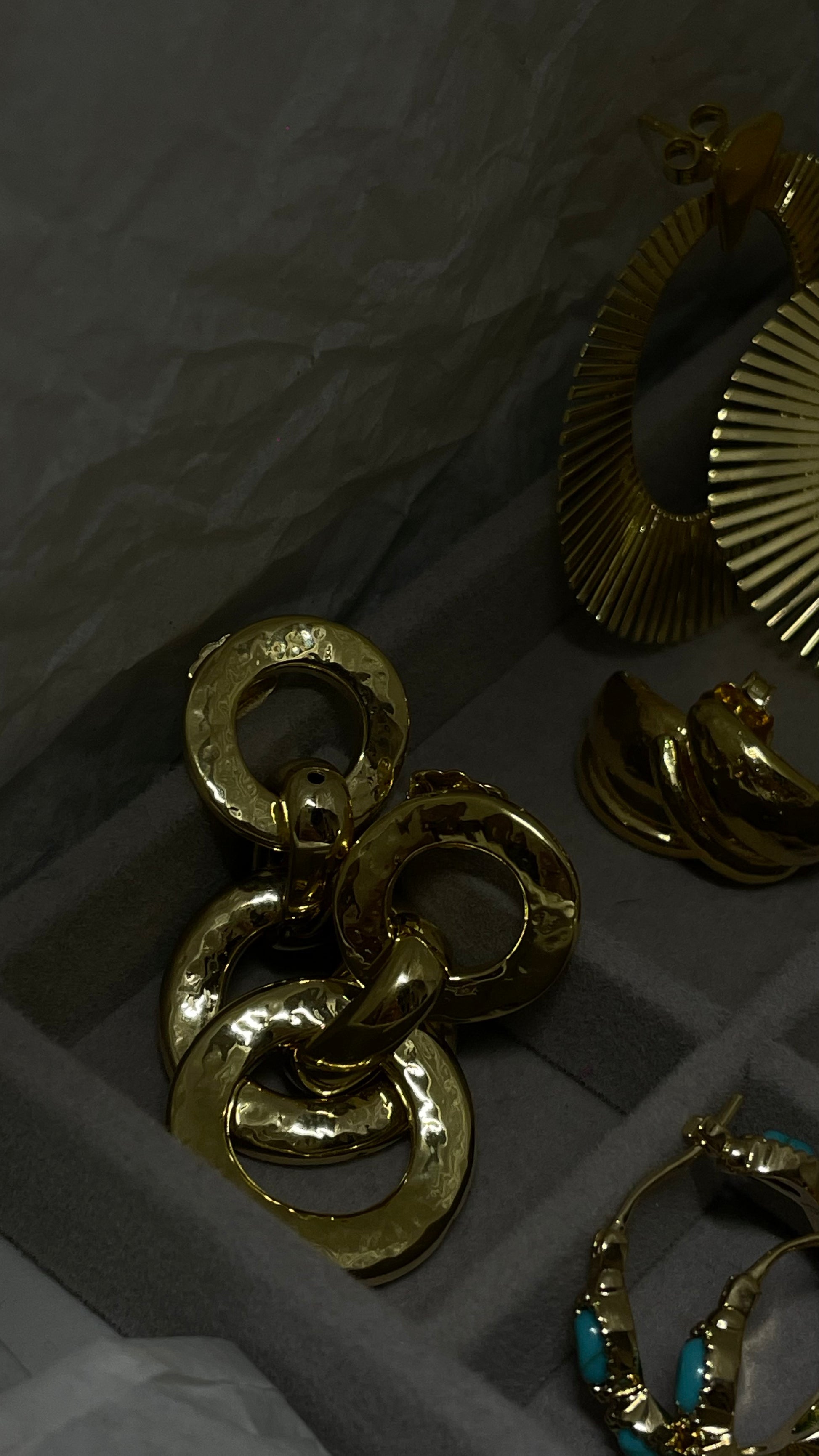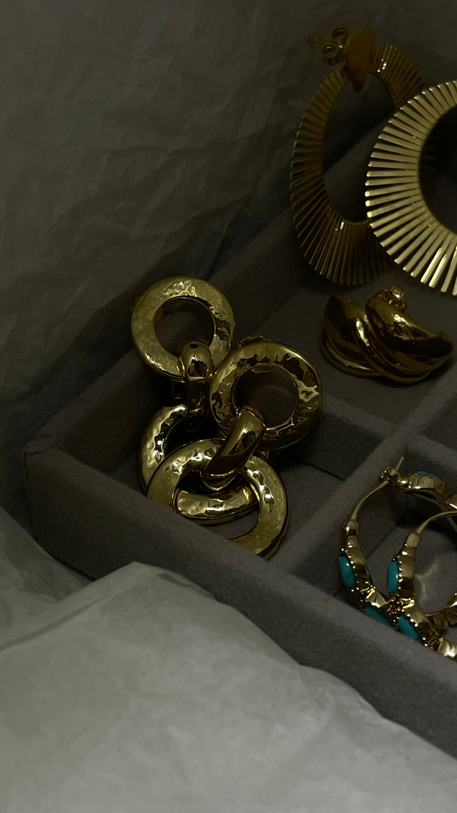 Parte do conjunto Fortaleza, estes brincos em bronze banhado a ouro seguem o mesmo desenho ancestral dos elos marcantes da coleção. Cada círculo martelado evoca solidez e união, traduzindo-se numa peça ousada e elegante, perfeita para quem procura uma presença imponente sem perder a intemporalidade.