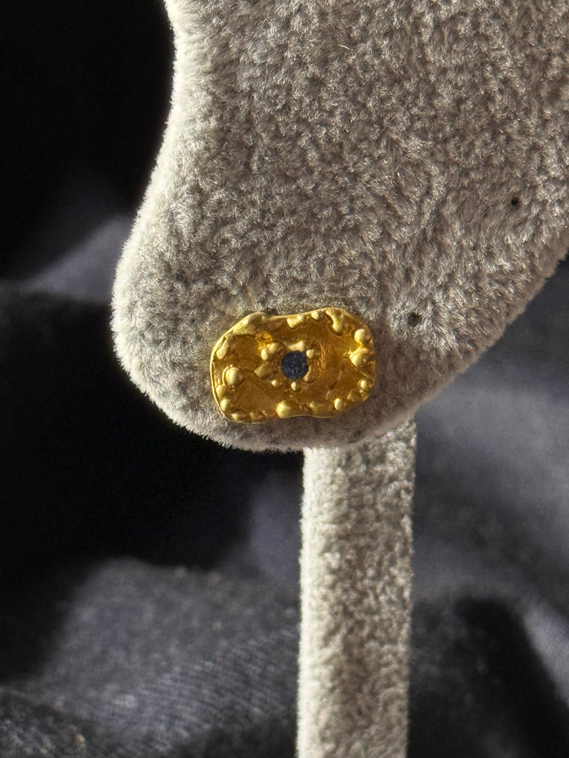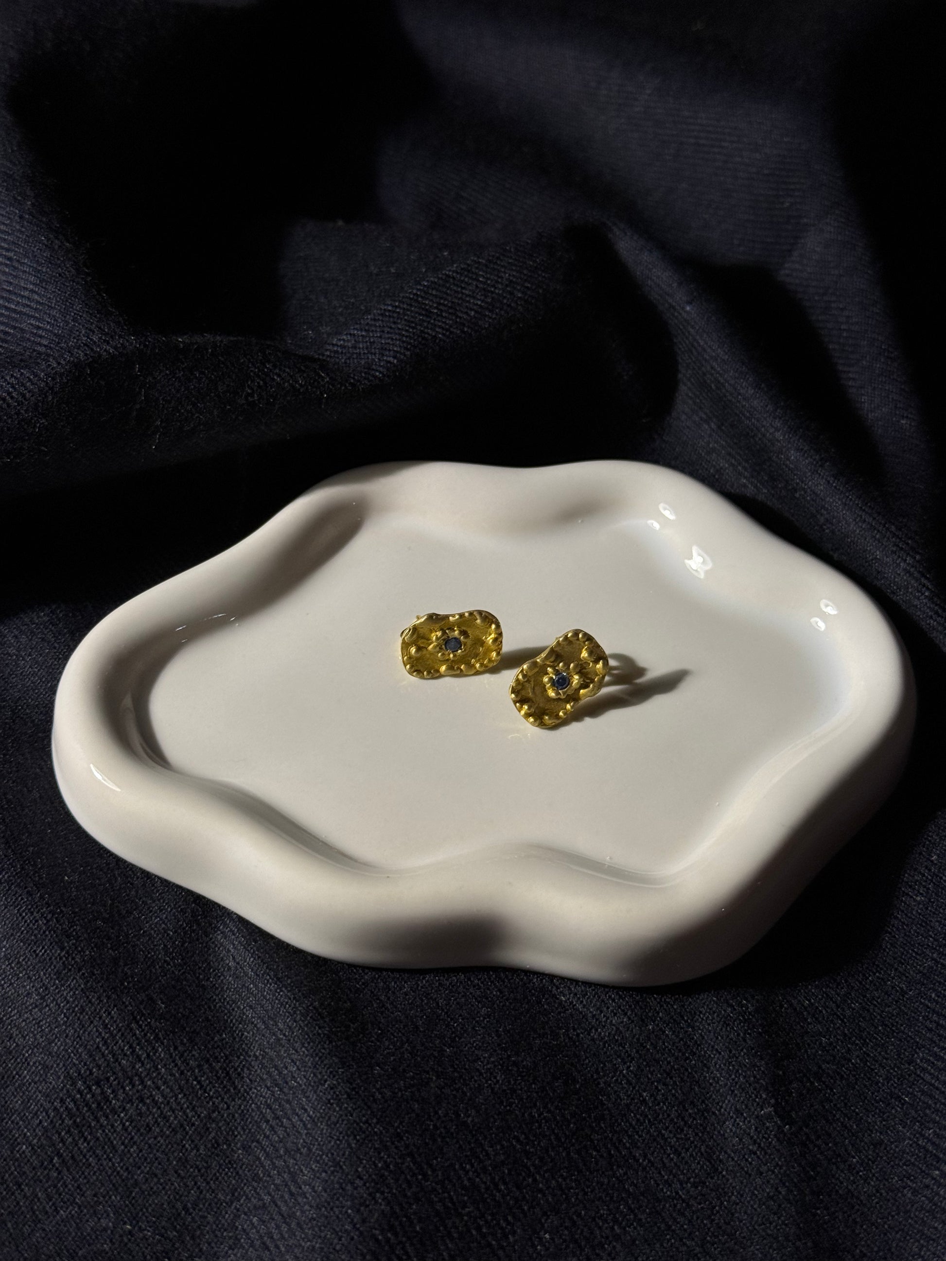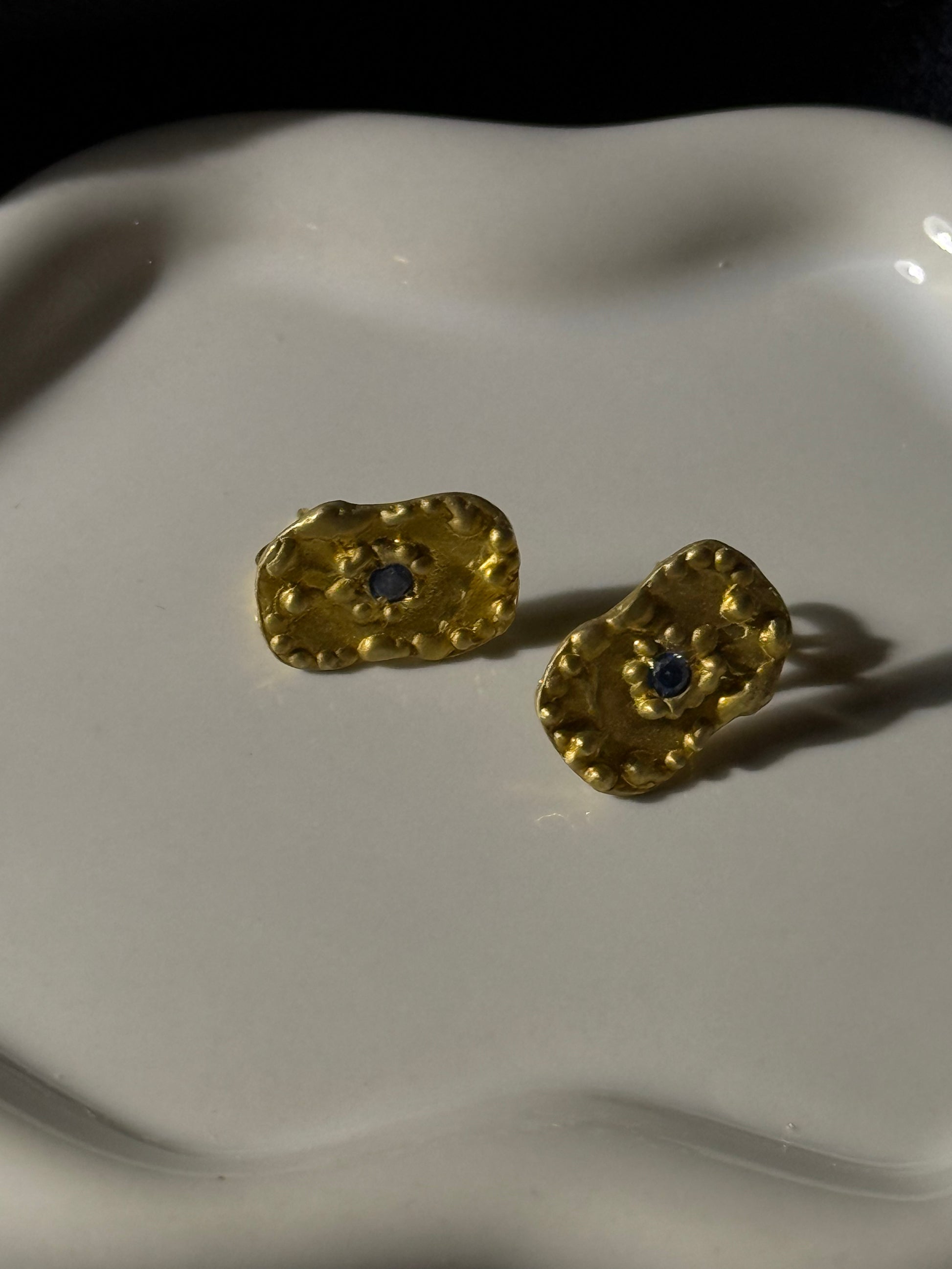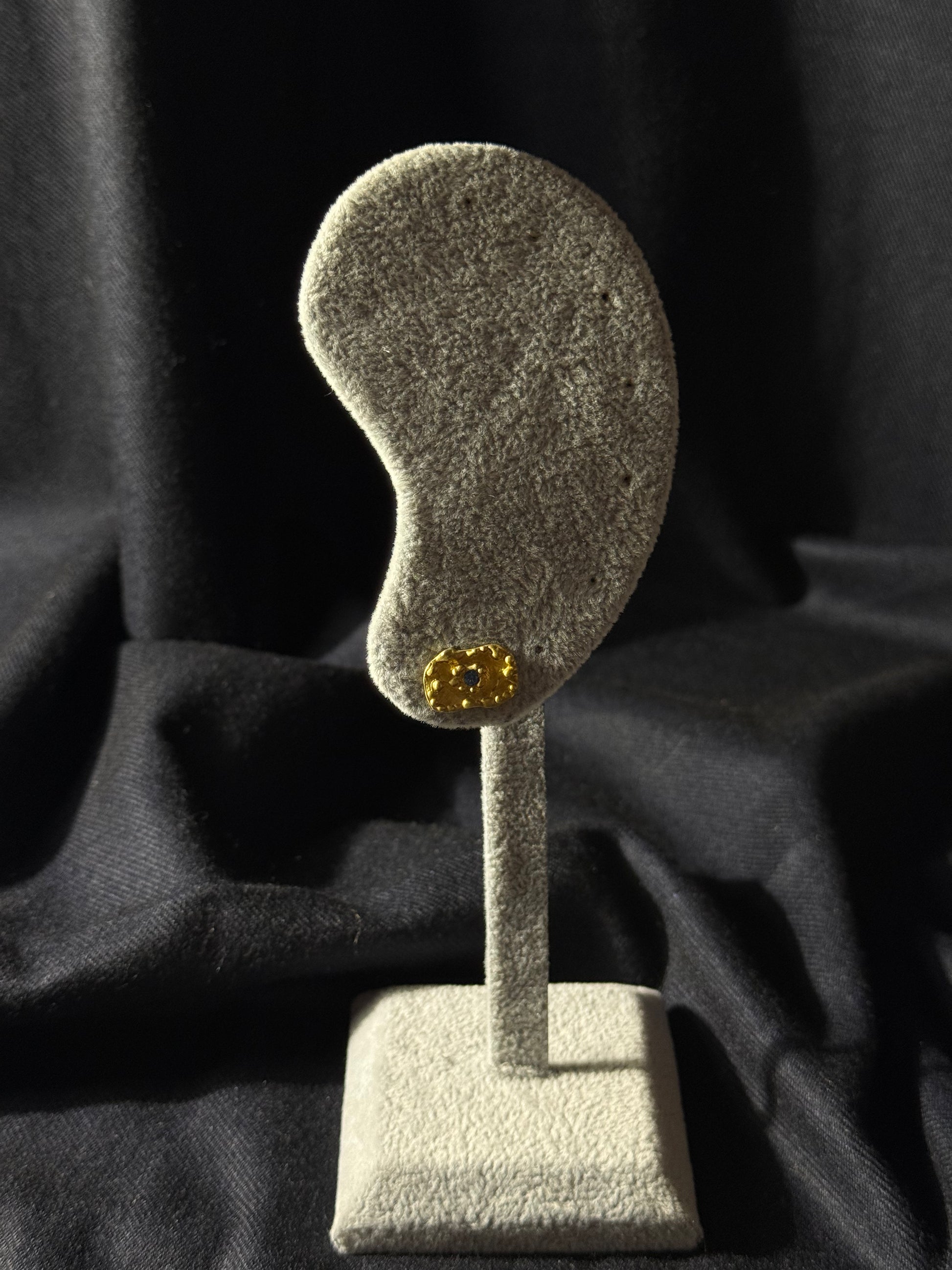 Os brincos Gaïa são a extensão perfeita do colar e pulseira homónimos. Evocam a força da natureza e o brilho da terra, com formas orgânicas em prata dourada e uma pedra central azul profunda. Um design escultural que capta a beleza da imperfeição, pensado para mulheres que apreciam peças com carácter.