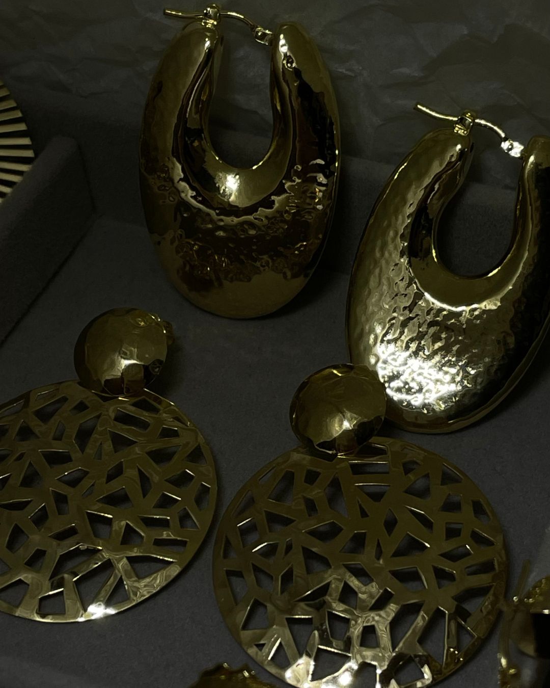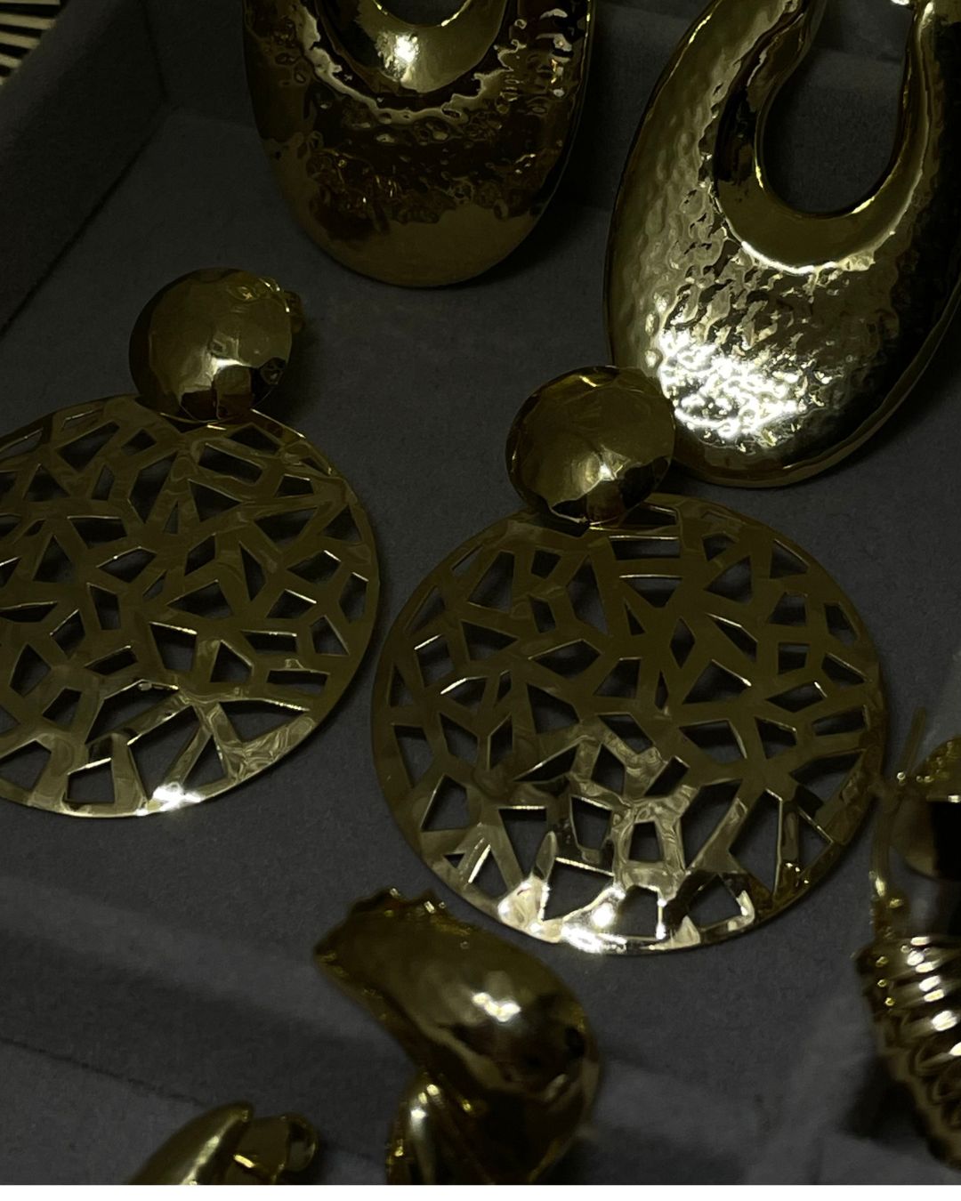 Trabalhados em bronze banhado a ouro, estes brincos evocam o mistério dos mosaicos e a riqueza ornamental das civilizações passadas. De presença marcante e elegante, são uma celebração da sofisticação intemporal.
