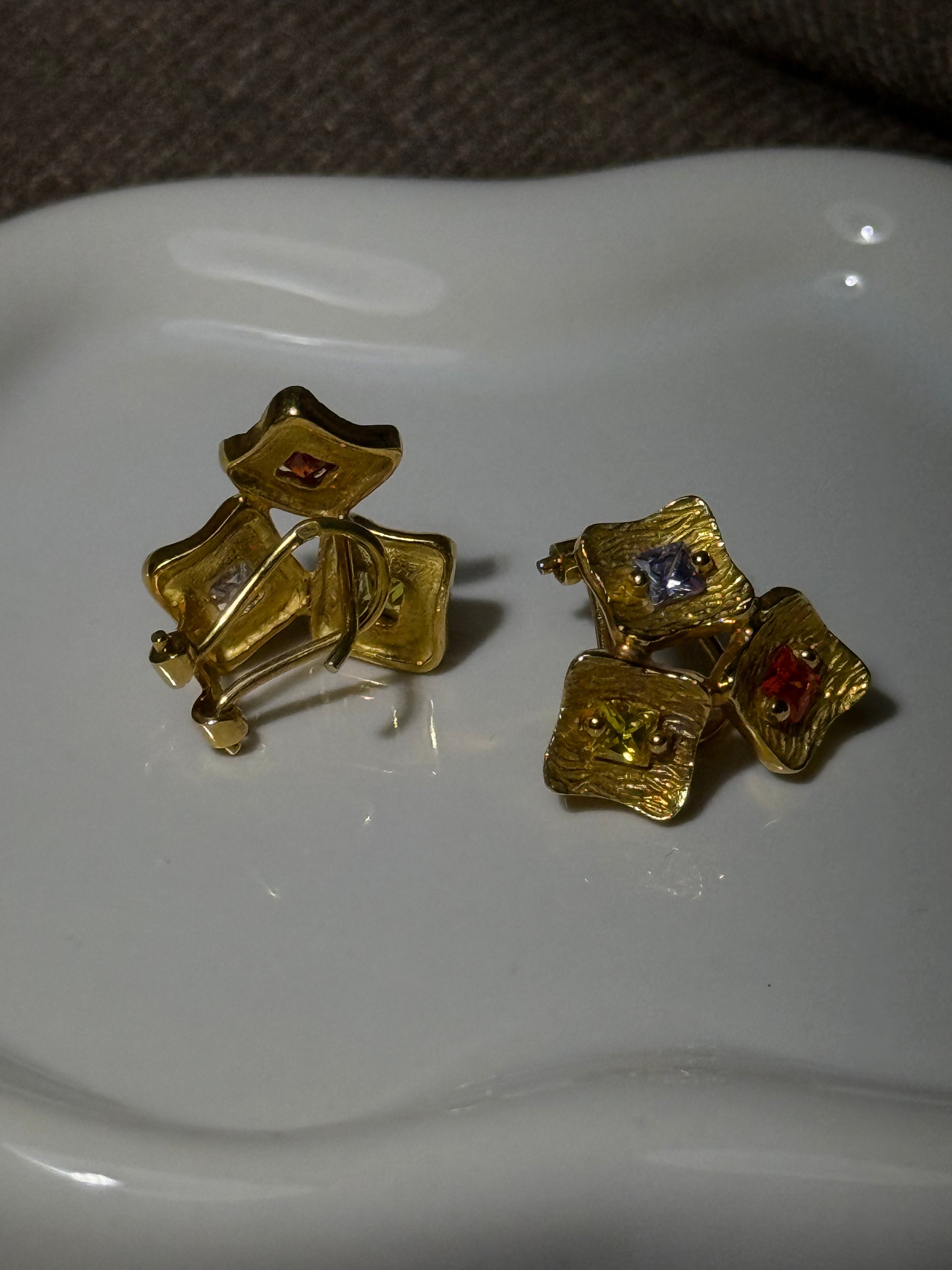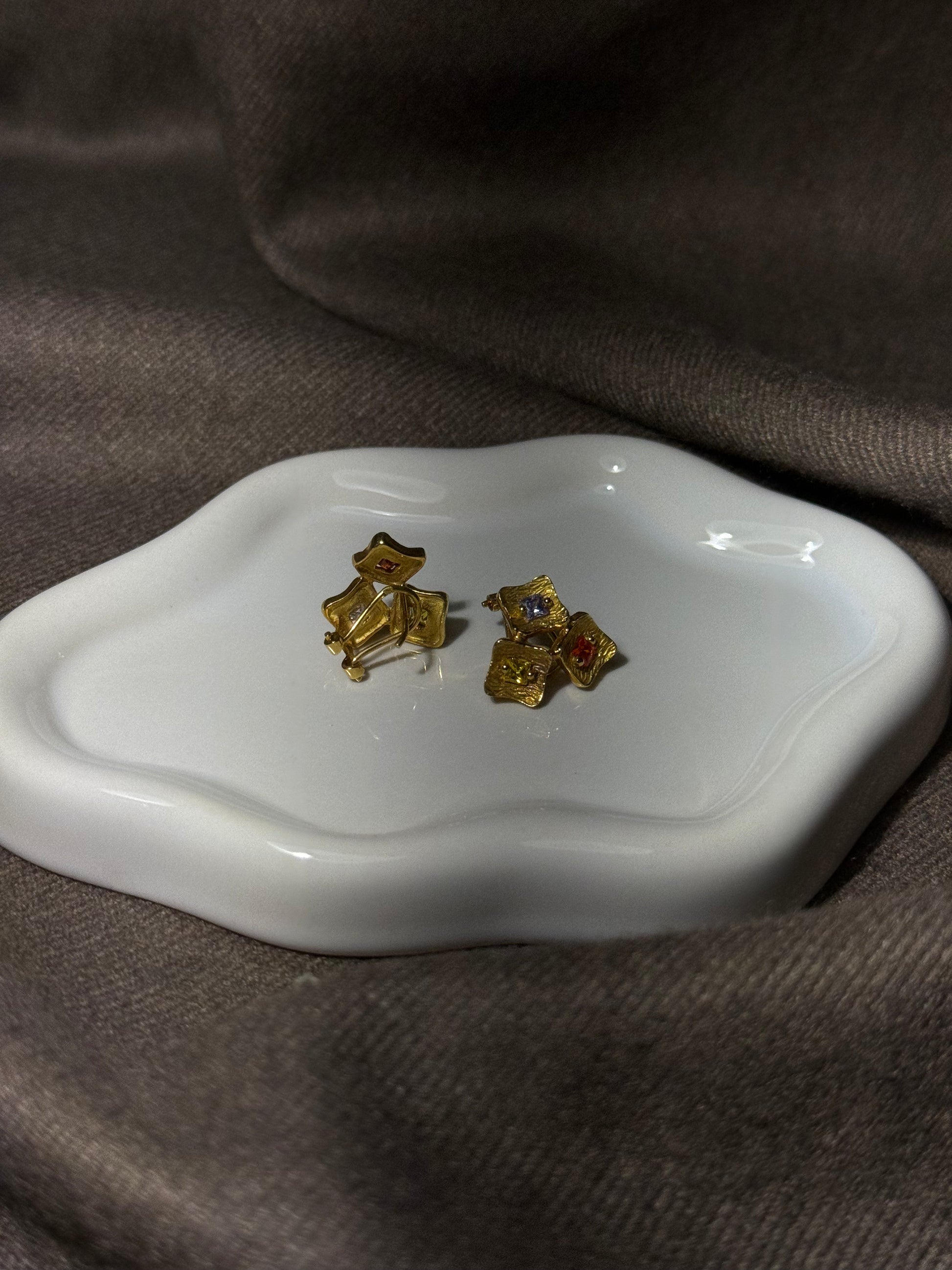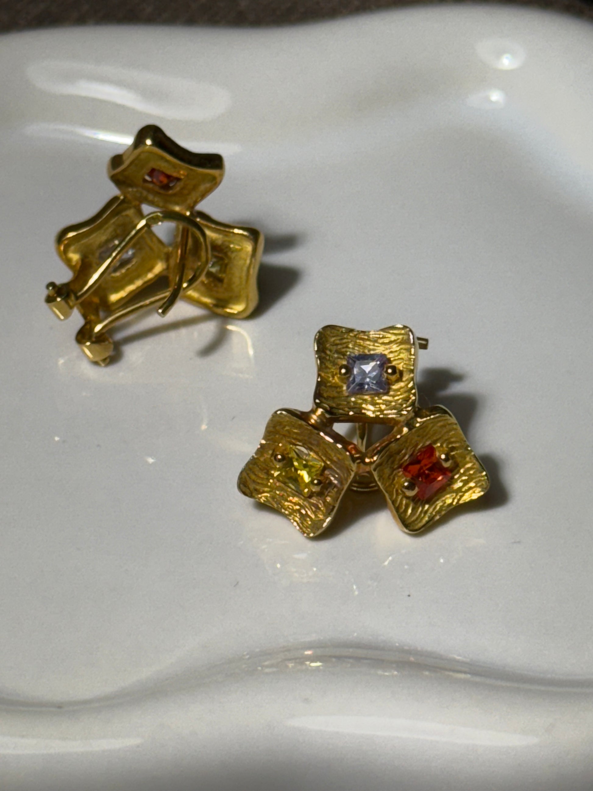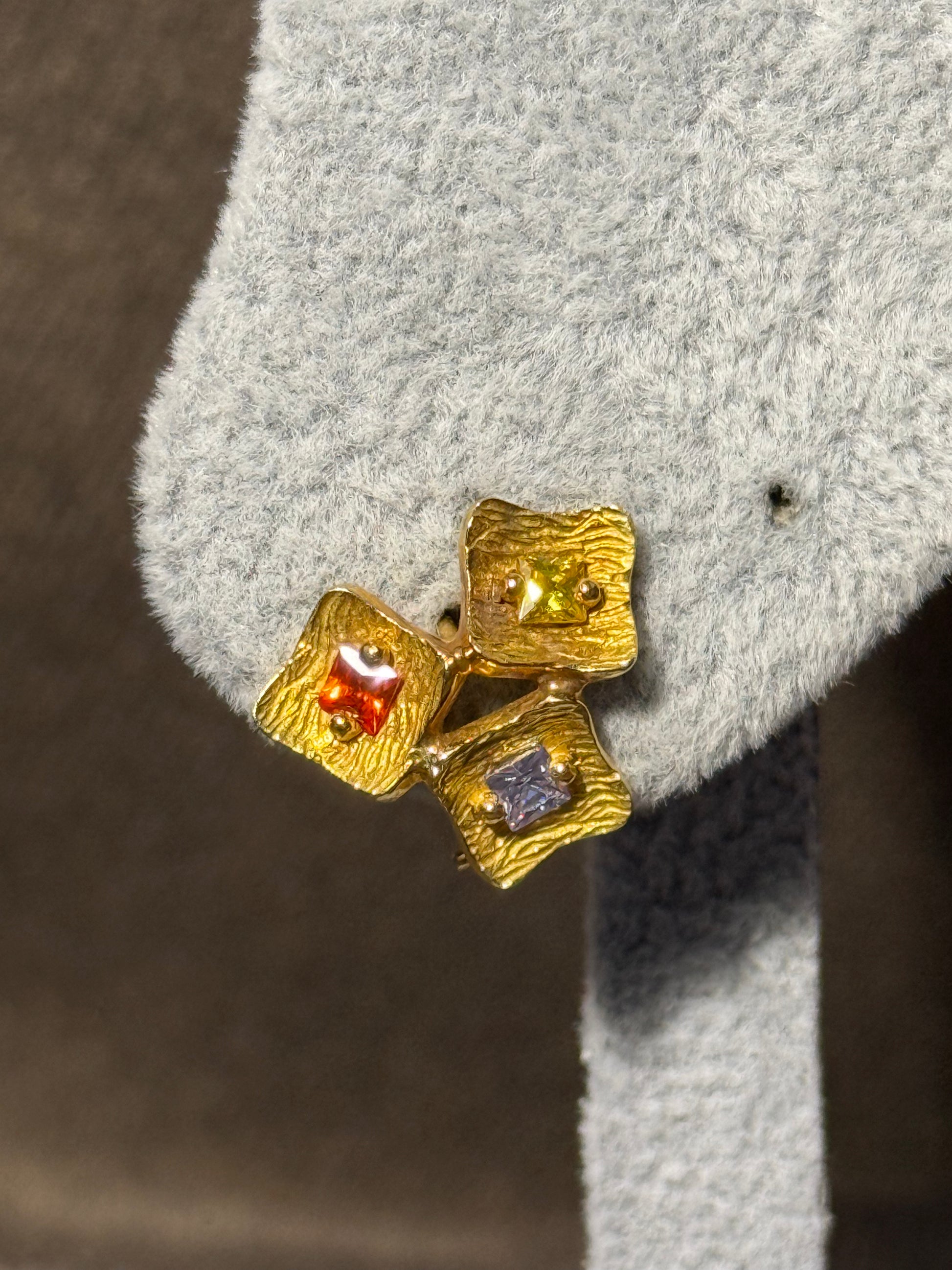Três formas em ouro texturado sustentam pedras coloridas que captam a luz com alegria e precisão. Uma peça com movimento e energia, pensada para iluminar o rosto com sofisticação descomplicada.