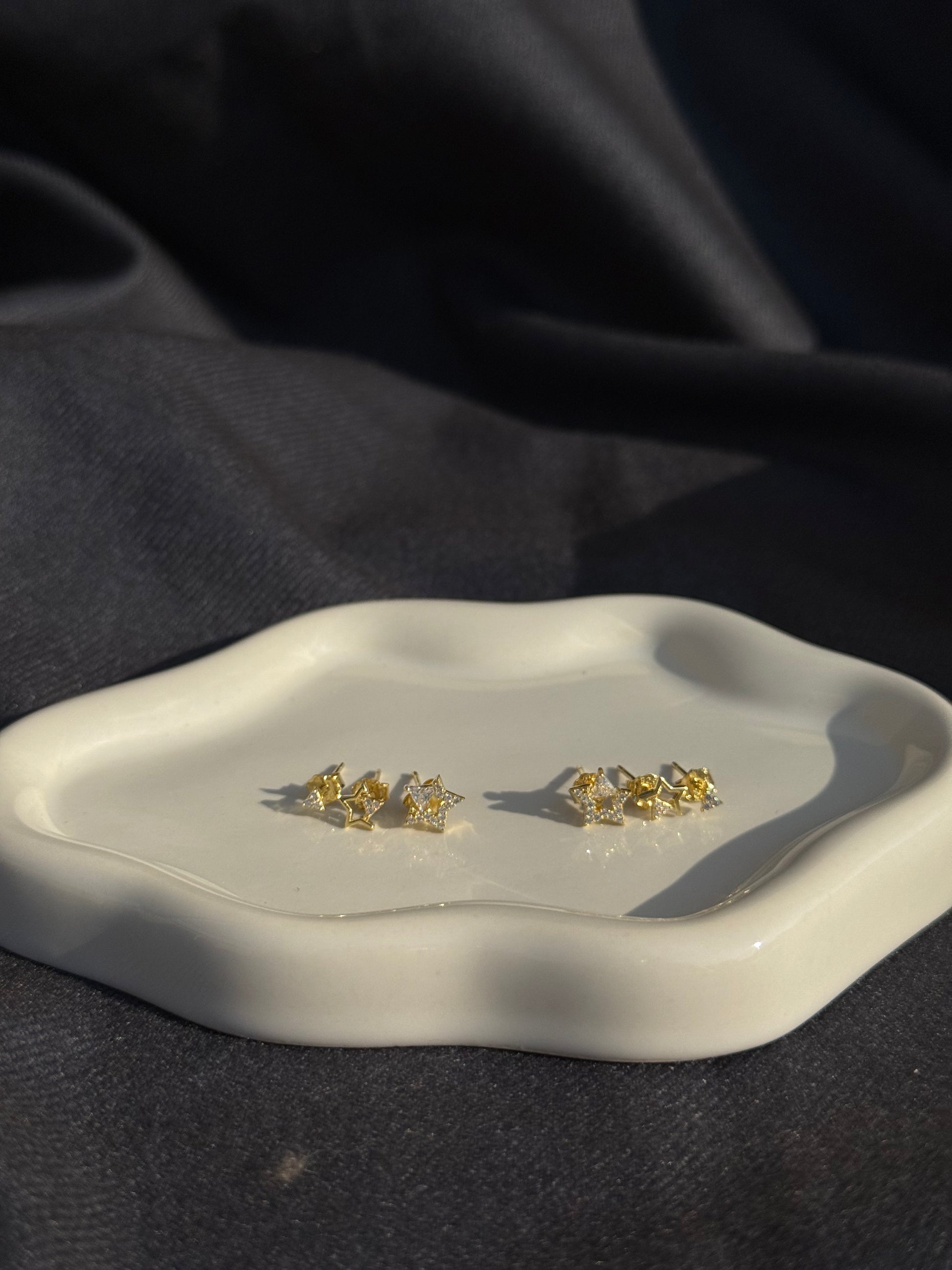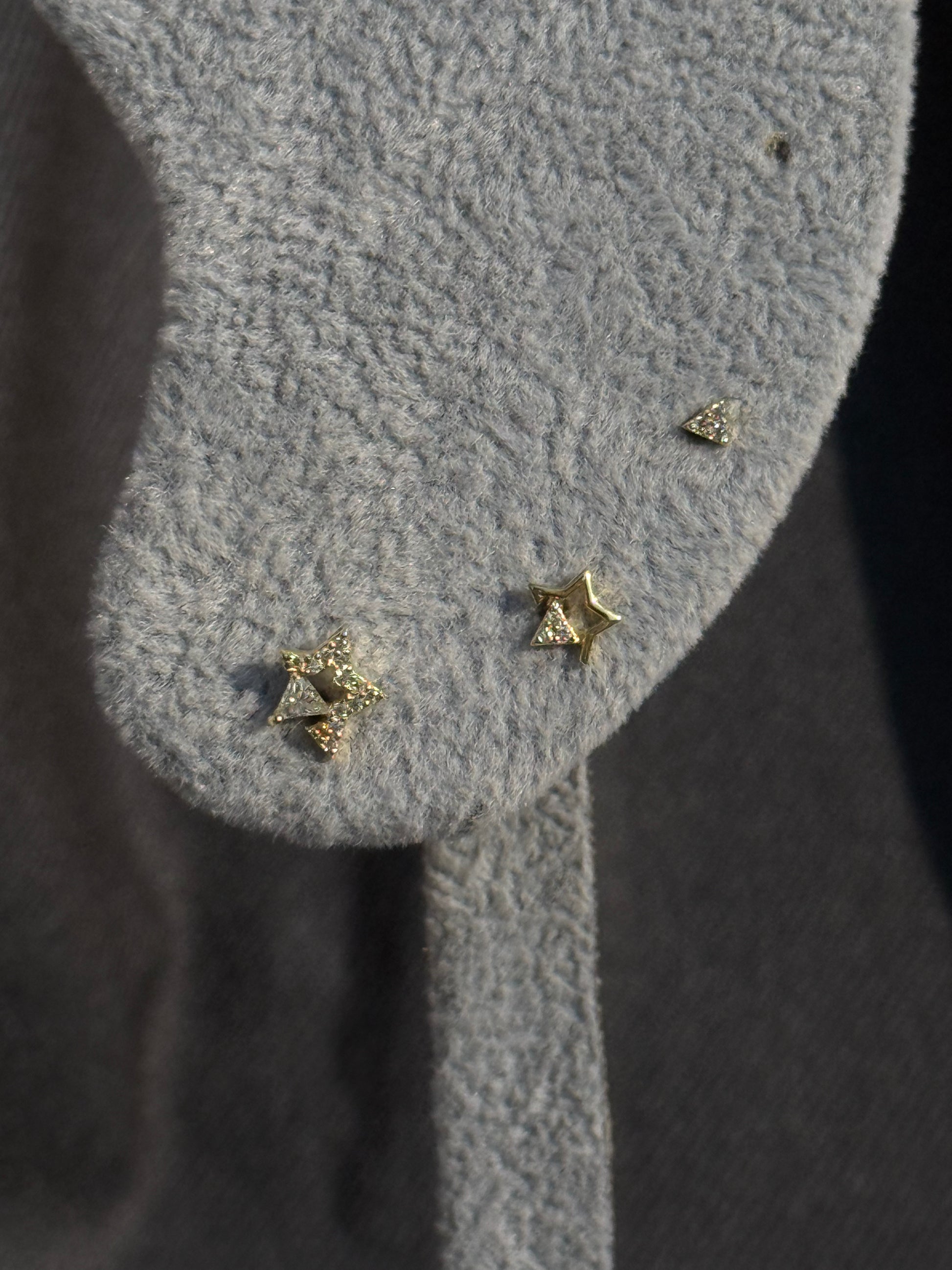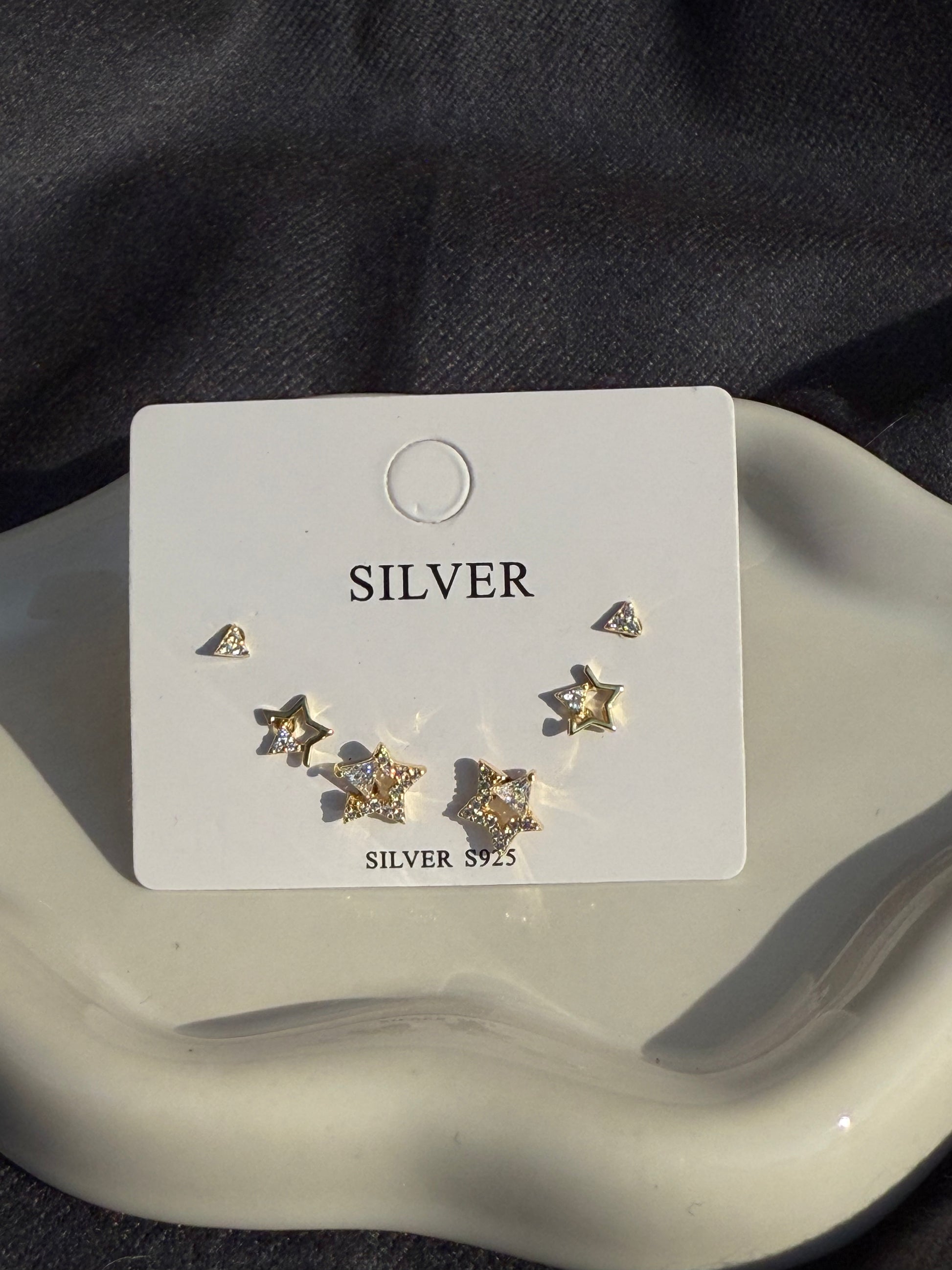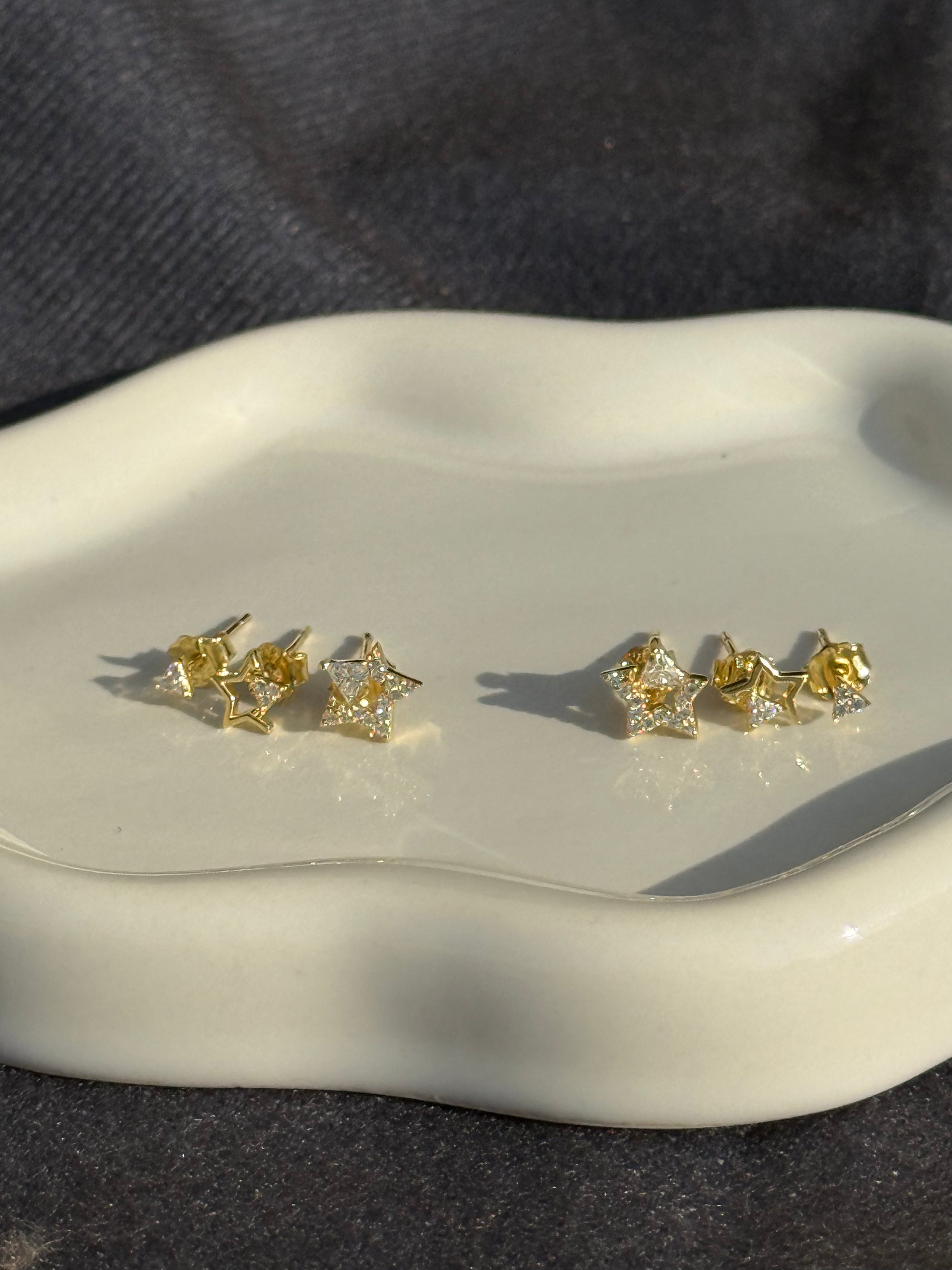 Este conjunto apresenta três pares de brincos em prata dourada: estrela cravejada, estrela vazada e triângulo delicado com zircónias. Criados para se complementarem, podem ser usados em múltiplos furos ou individualmente, permitindo combinações versáteis que mantêm sempre a sofisticação. Uma escolha intemporal para quem aprecia o brilho dourado em versões minimalistas e luxuosas.