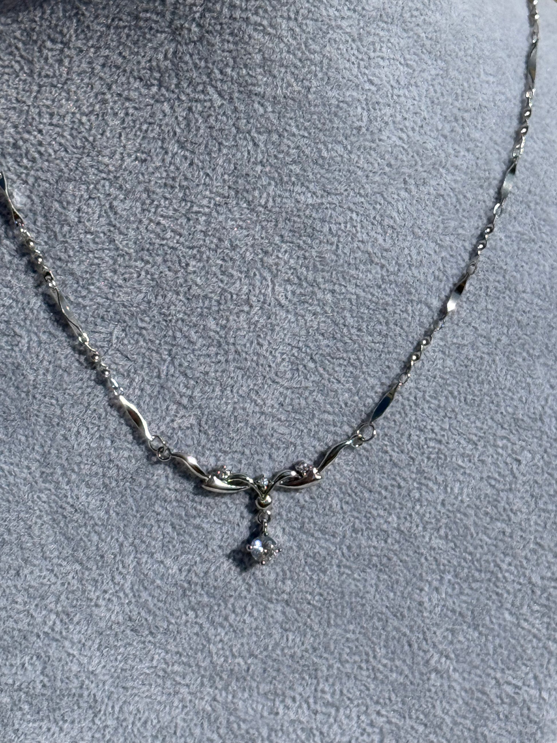 Com formas leves e brilho pontual, este colar em prata é uma interpretação contemporânea da joalharia nupcial. O motivo central evoca um gesto orgânico e feminino, pensado para iluminar o colo no dia mais especial com subtileza e intenção.