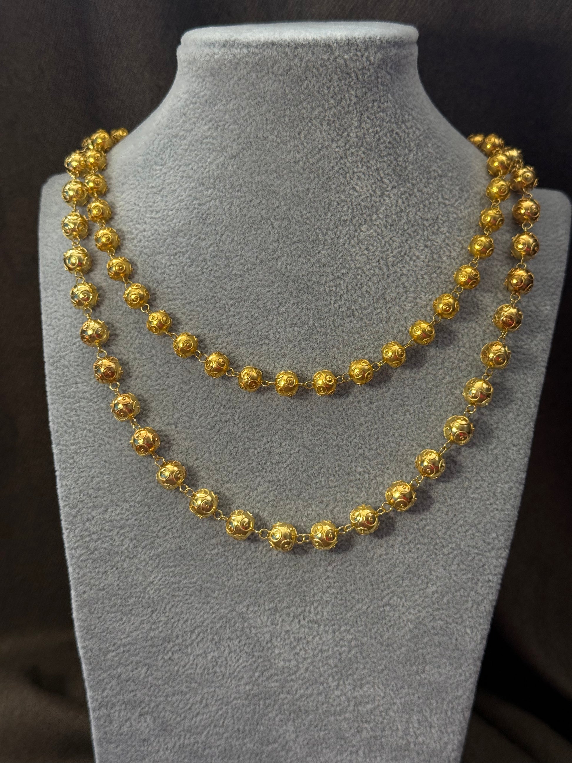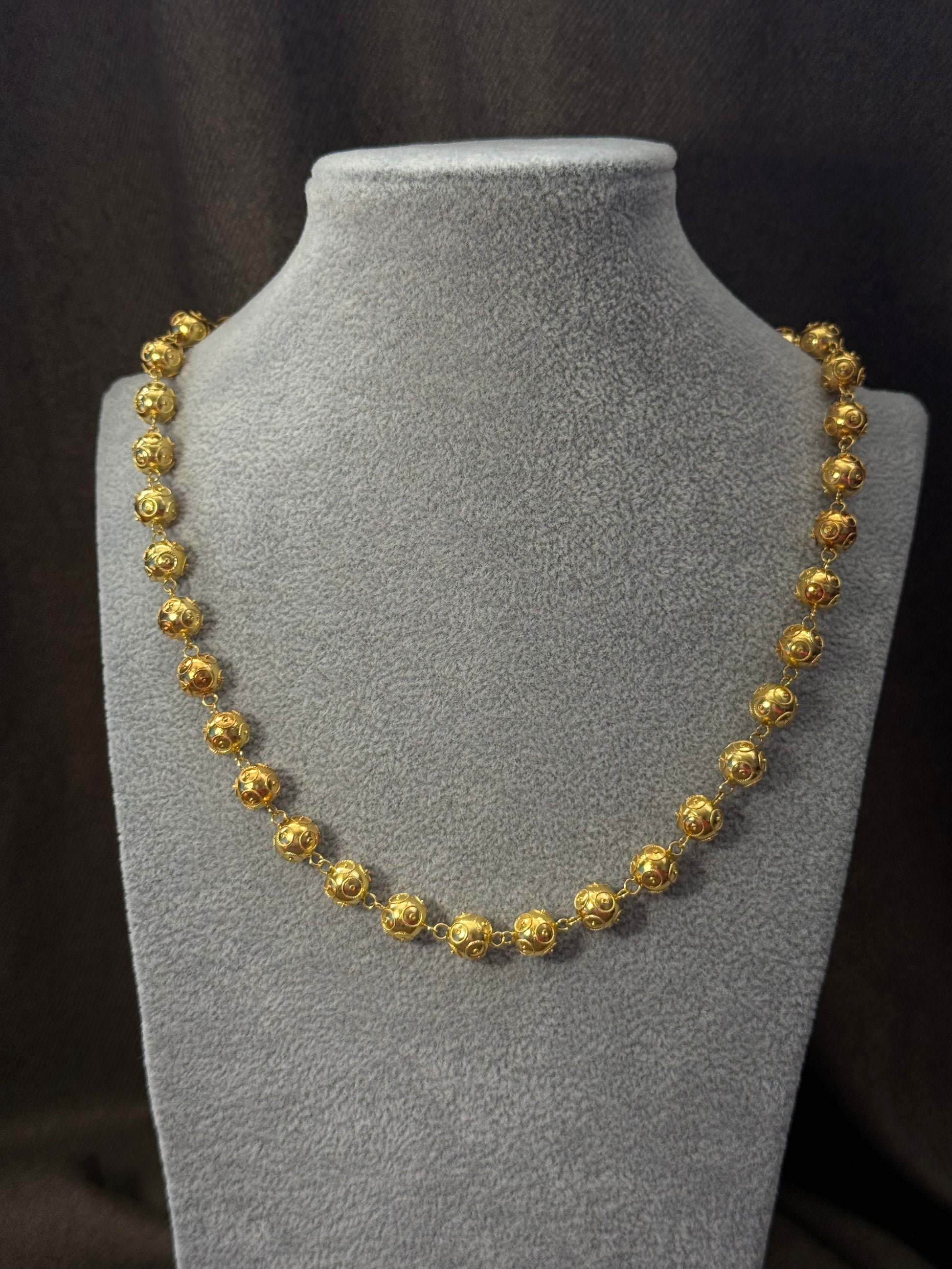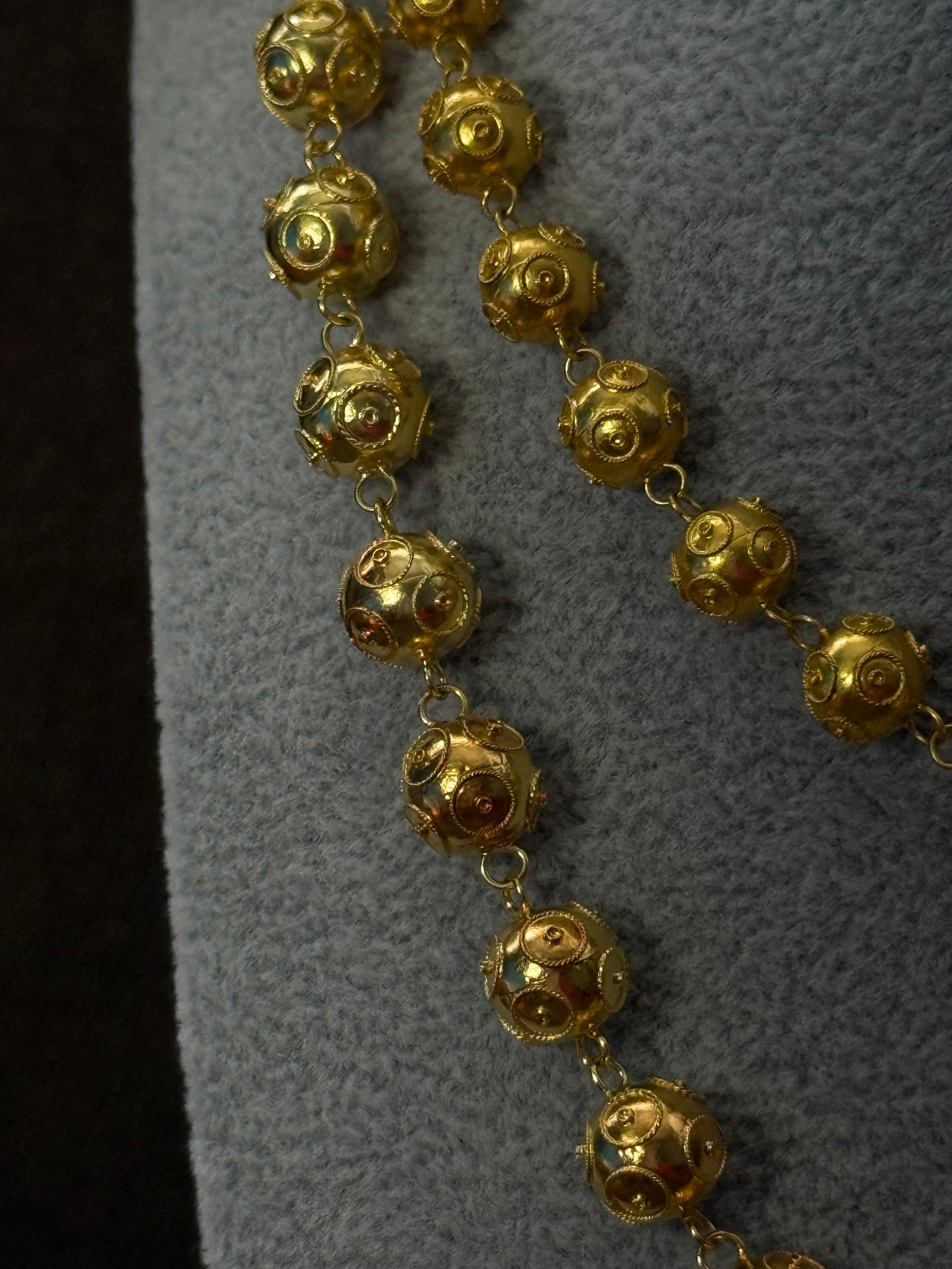 Colar em ouro amarelo com contas de Viana 8mm trabalhadas 46cm, que se sucedem com ritmo firme e simétrico. Uma peça que ecoa tradição, mas com proporções monumentais, feita para ser vista, sentida e celebrada. Se procura opções semelhantes, pesquise pelo Colar D'Alia I.