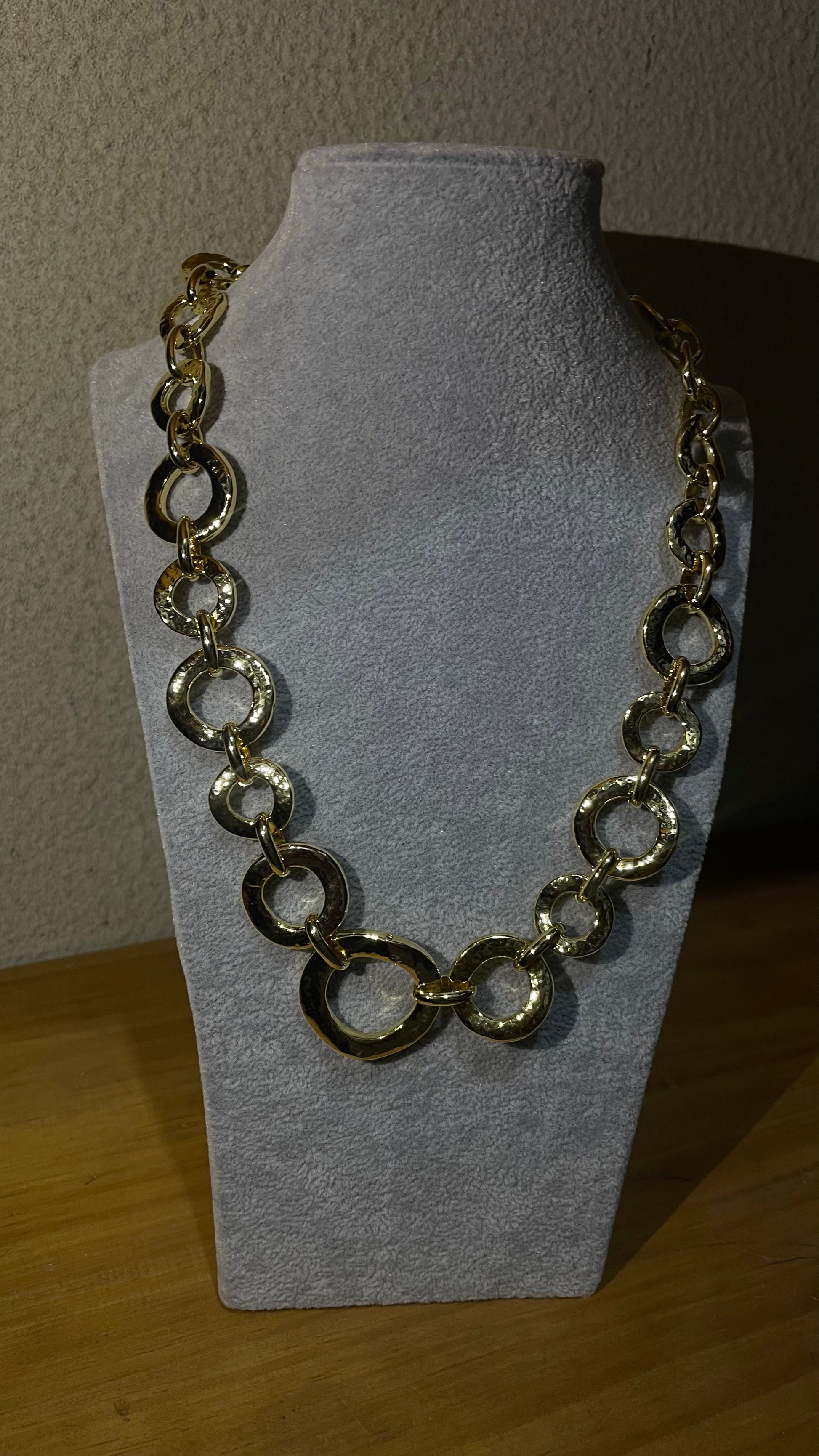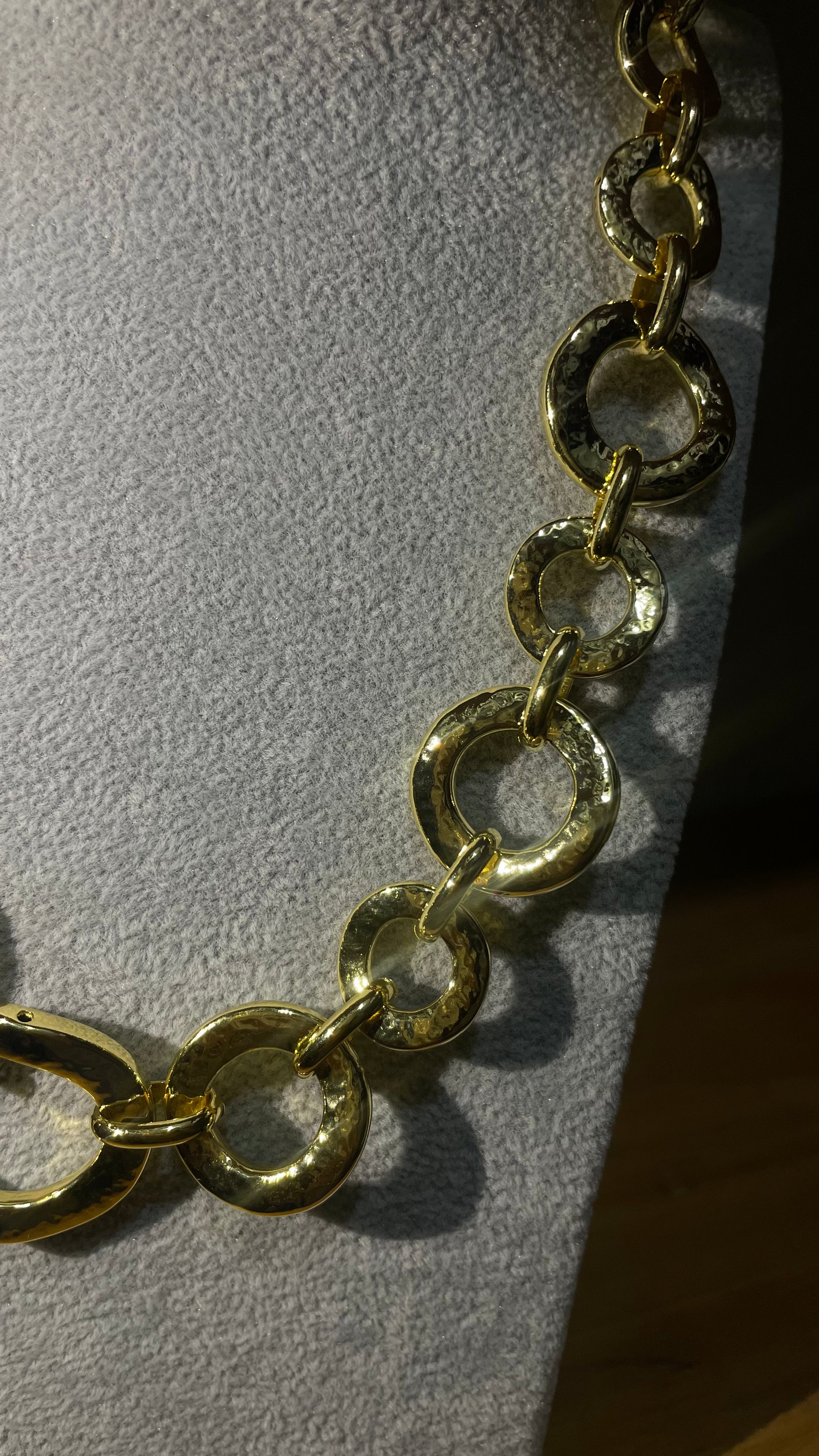 Inspirado nas formas ancestrais da joalharia etrusca, este colar em bronze banhado a ouro celebra a força interior de quem o usa. Os elos trabalhados evocam a solidez e a união, resultando numa peça de presença marcante, mas equilibrada pela simplicidade elegante do seu desenho.