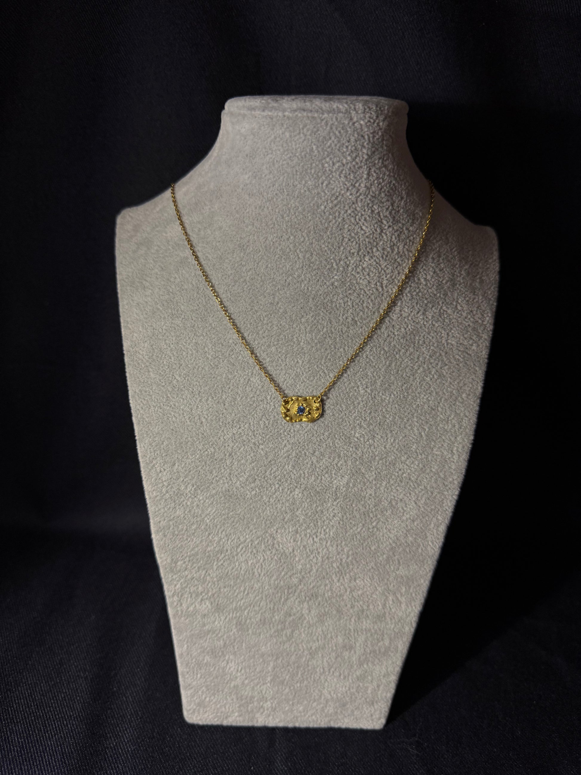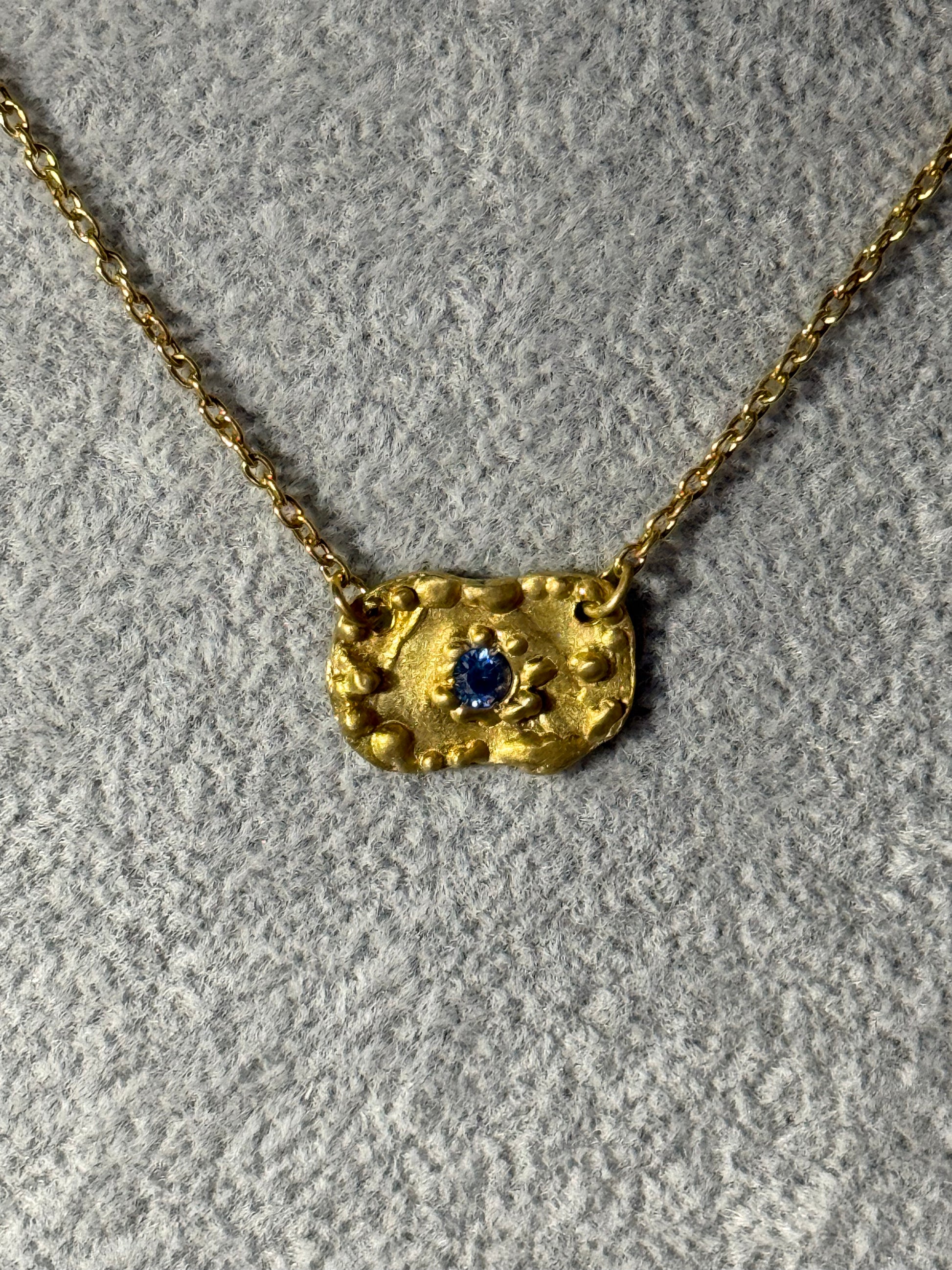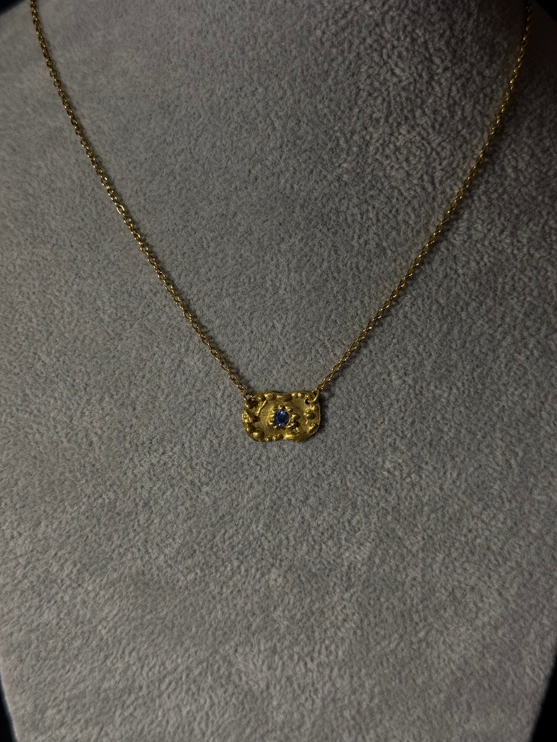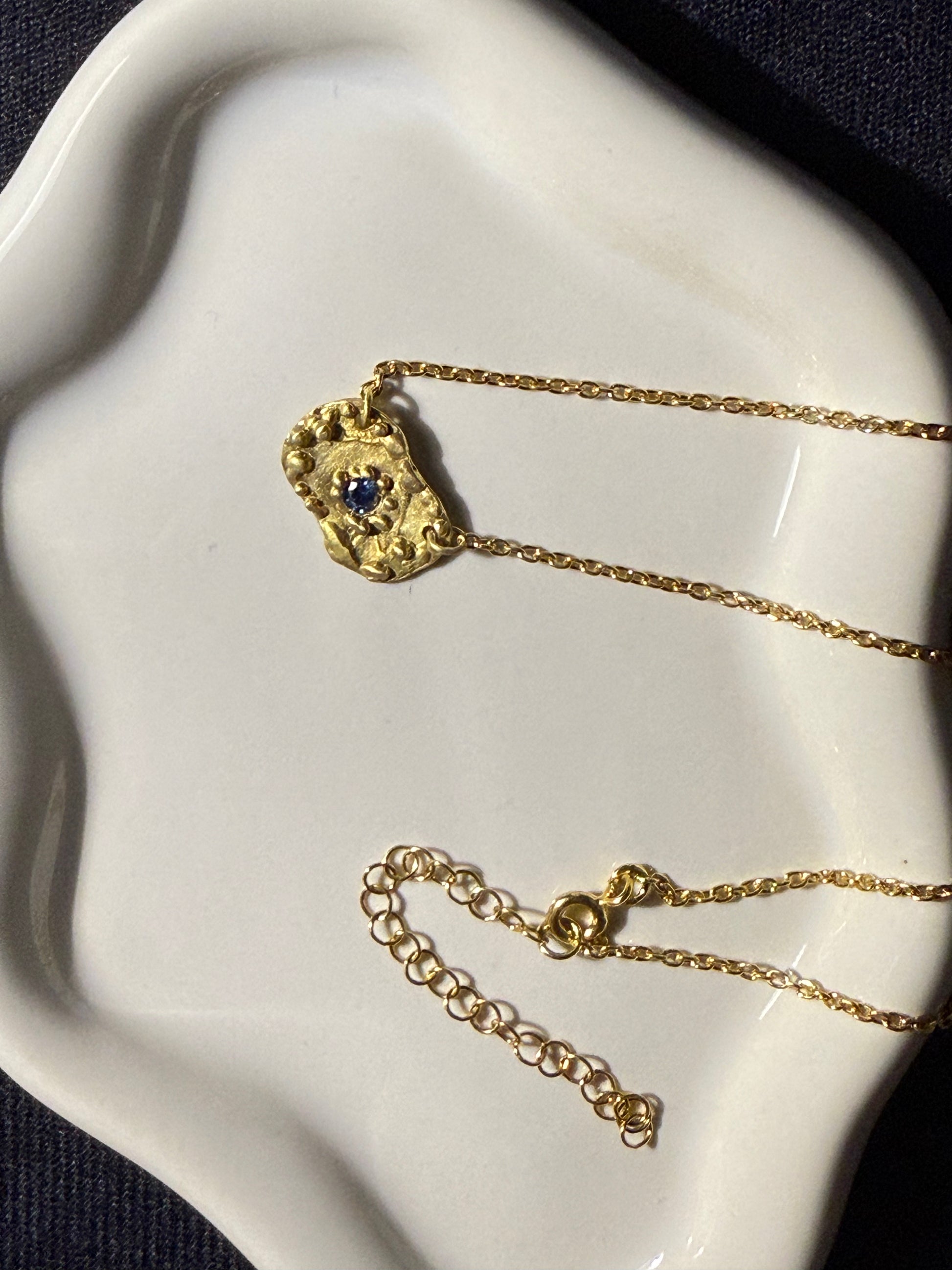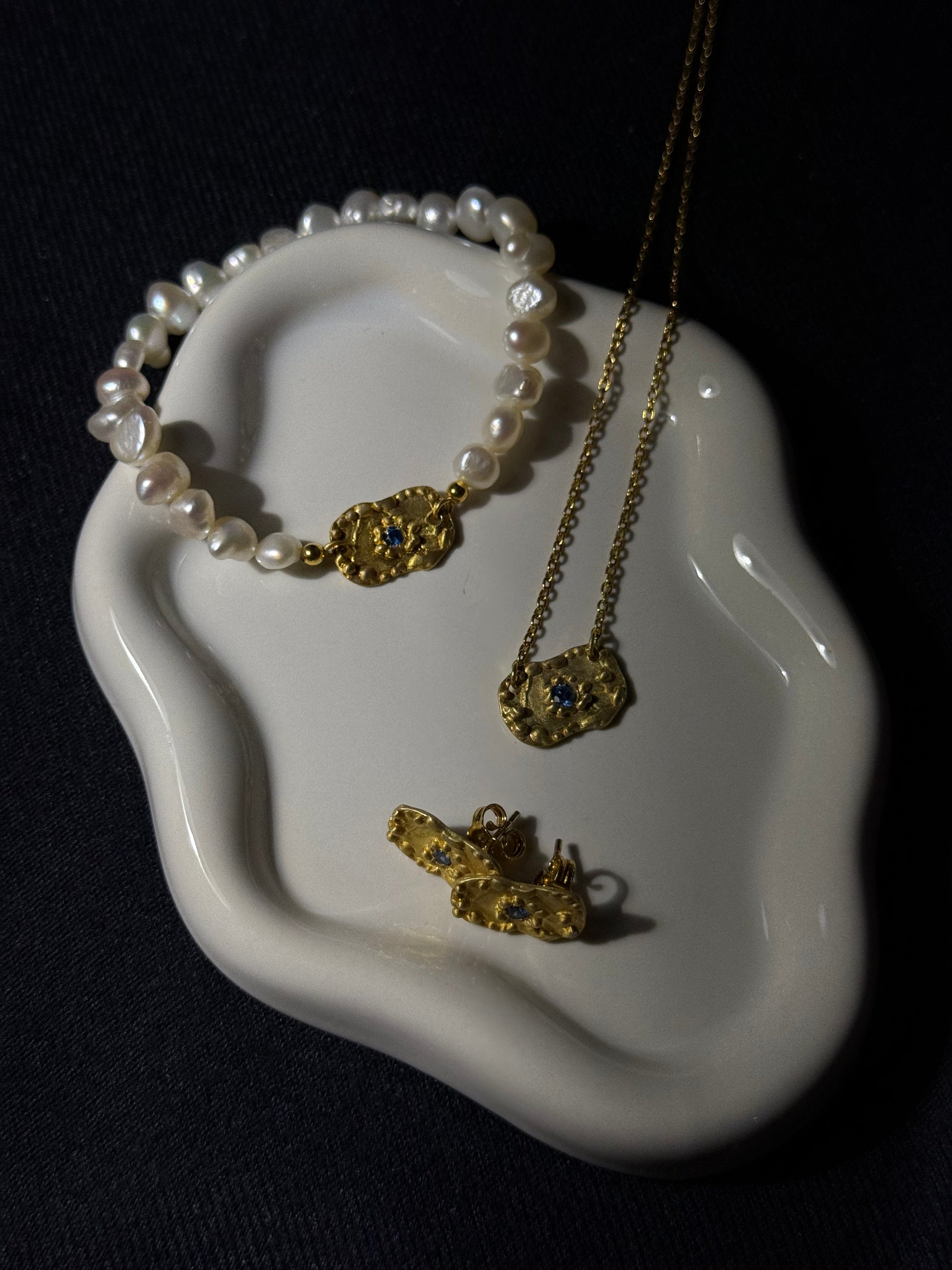 O colar Gaïa Azul é a extensão perfeita dos brincos e pulseira homónimos - um tributo à natureza em forma de joia. A textura orgânica da medalha em prata dourada evoca a força crua dos elementos, enquanto a zircónia azul ao centro relembra a profundidade dos mares e do céu. Um design de presença serena, pensado para quem carrega a beleza do mundo com leveza e intenção.