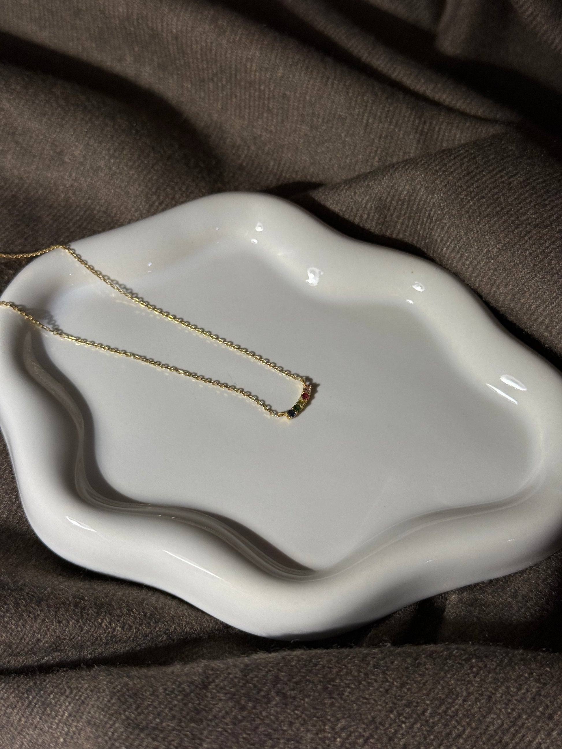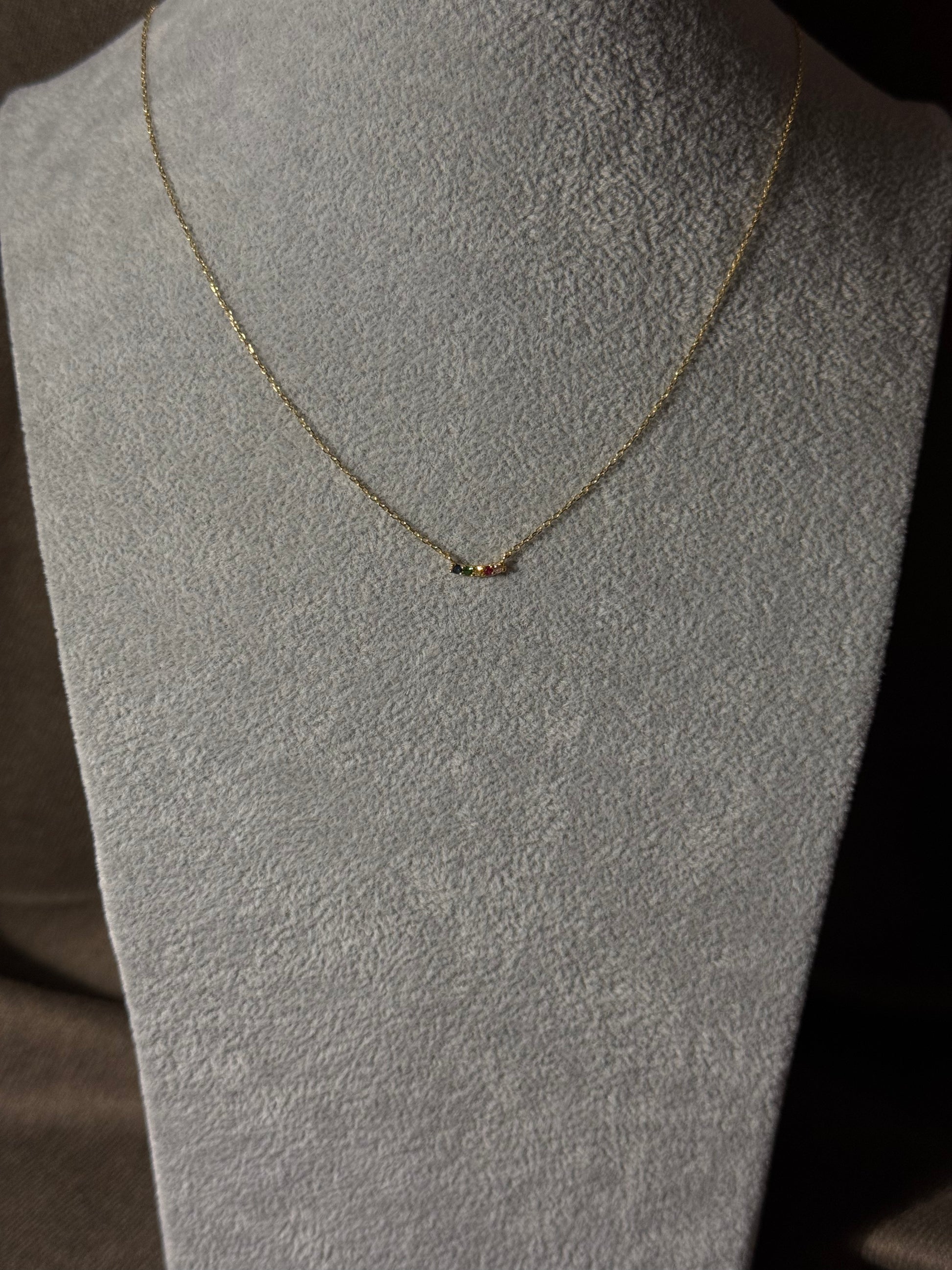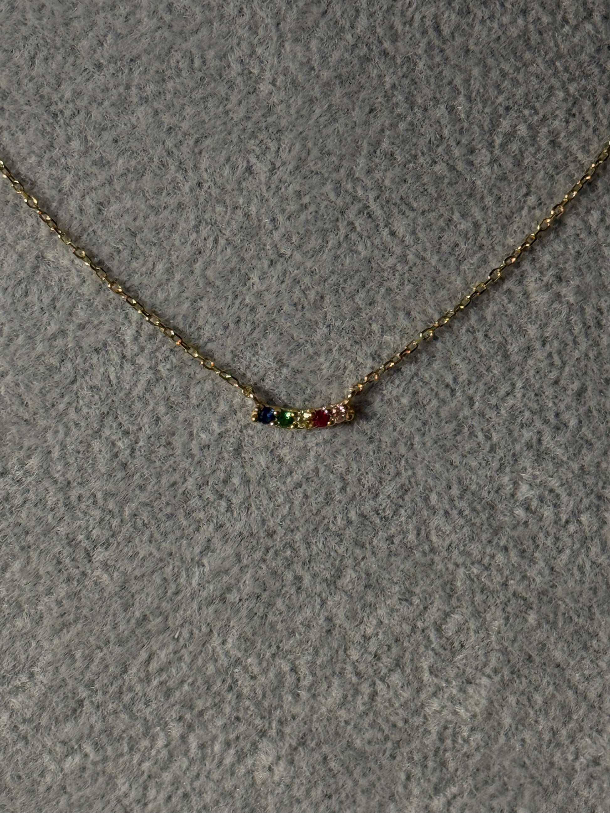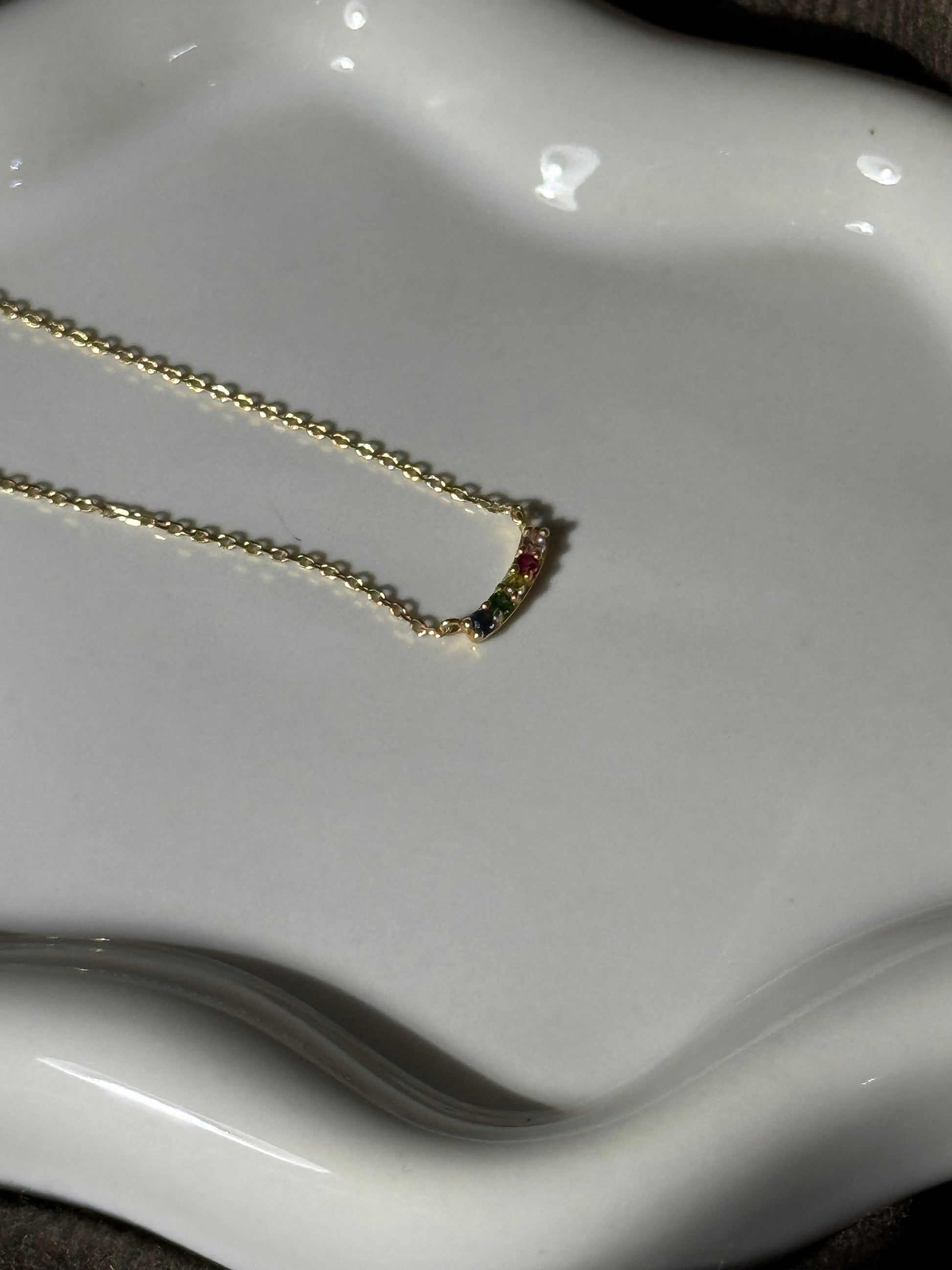 Este fio em ouro exibe um arco de pequenas pedras coloridas cravadas com precisão. Uma peça leve, pensada para quem aprecia os detalhes e gosta de usar o ouro com naturalidade e alegria.