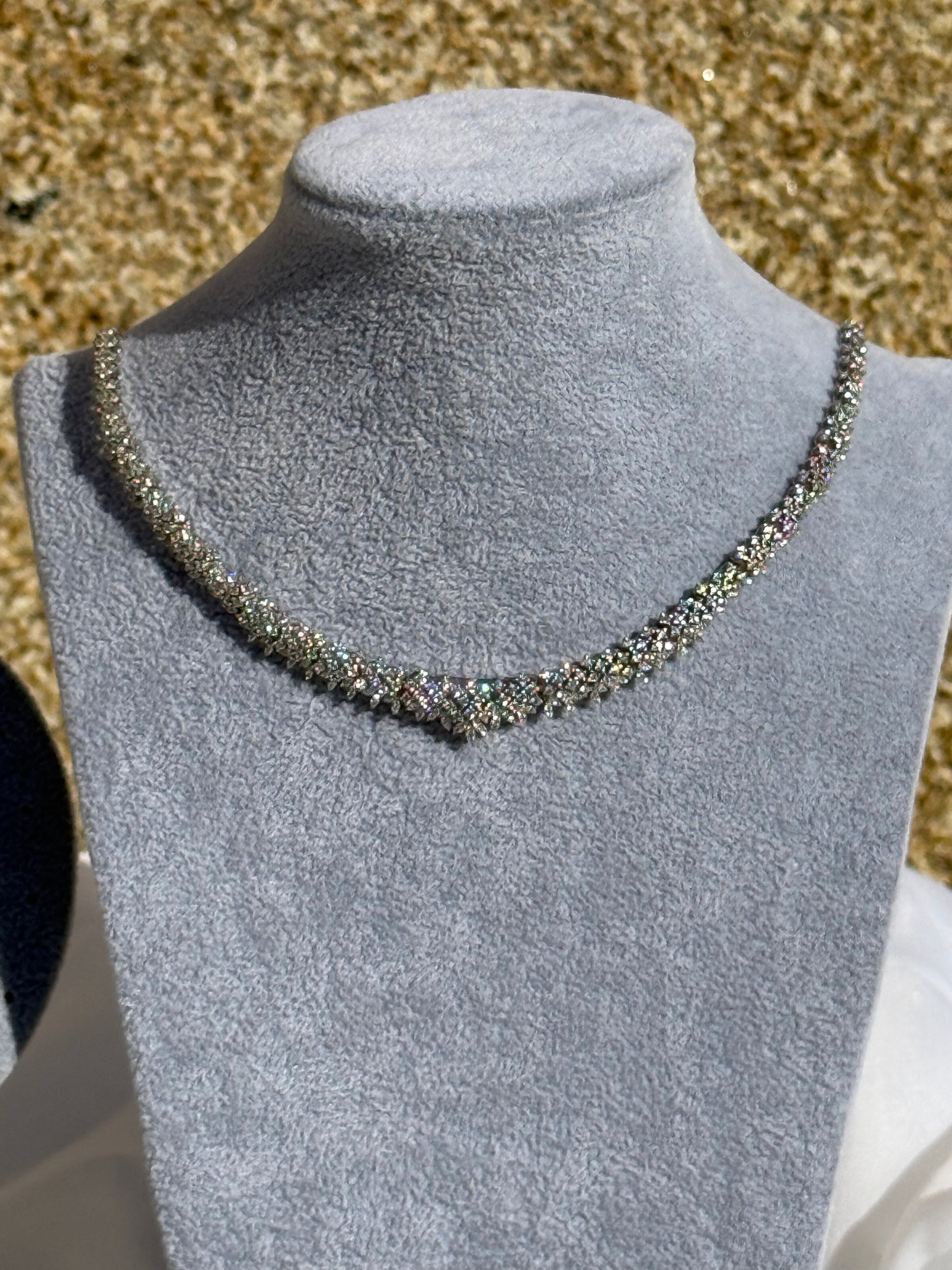 O Colar Noira distribui as zircónias com um padrão dinâmico e envolvente, como um sopro de luz que contorna o pescoço. Uma peça marcante, pensada para quem valoriza o detalhe e quer um brilho que acompanha cada gesto.