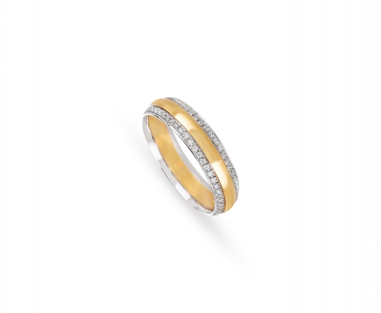 A eternidade em forma de ouro Aliança disponível em ouro 19,2kt (+-5,5gr), ouro 9kt ou prata, com 5mm de largura e 1,6mm de altura. O aro bicolor é realçado por 104 zircónias brancas redondas de 0,90mm, cravadas em duas fileiras que intensificam o brilho e a sofisticação da peça. Uma joia imponente, símbolo de um amor radiante e eterno.