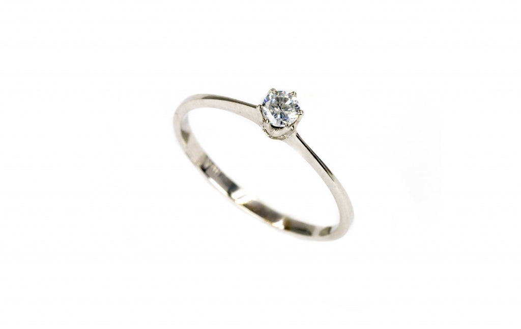 Anel solitário em ouro branco 19,2kt (+-1,5gr) ou 9,2kt, com aro delicado e pedra central de 3,25mm em cravação de garras. Uma joia discreta e elegante, perfeita para simbolizar promessas eternas e celebrar a pureza dos sentimentos.