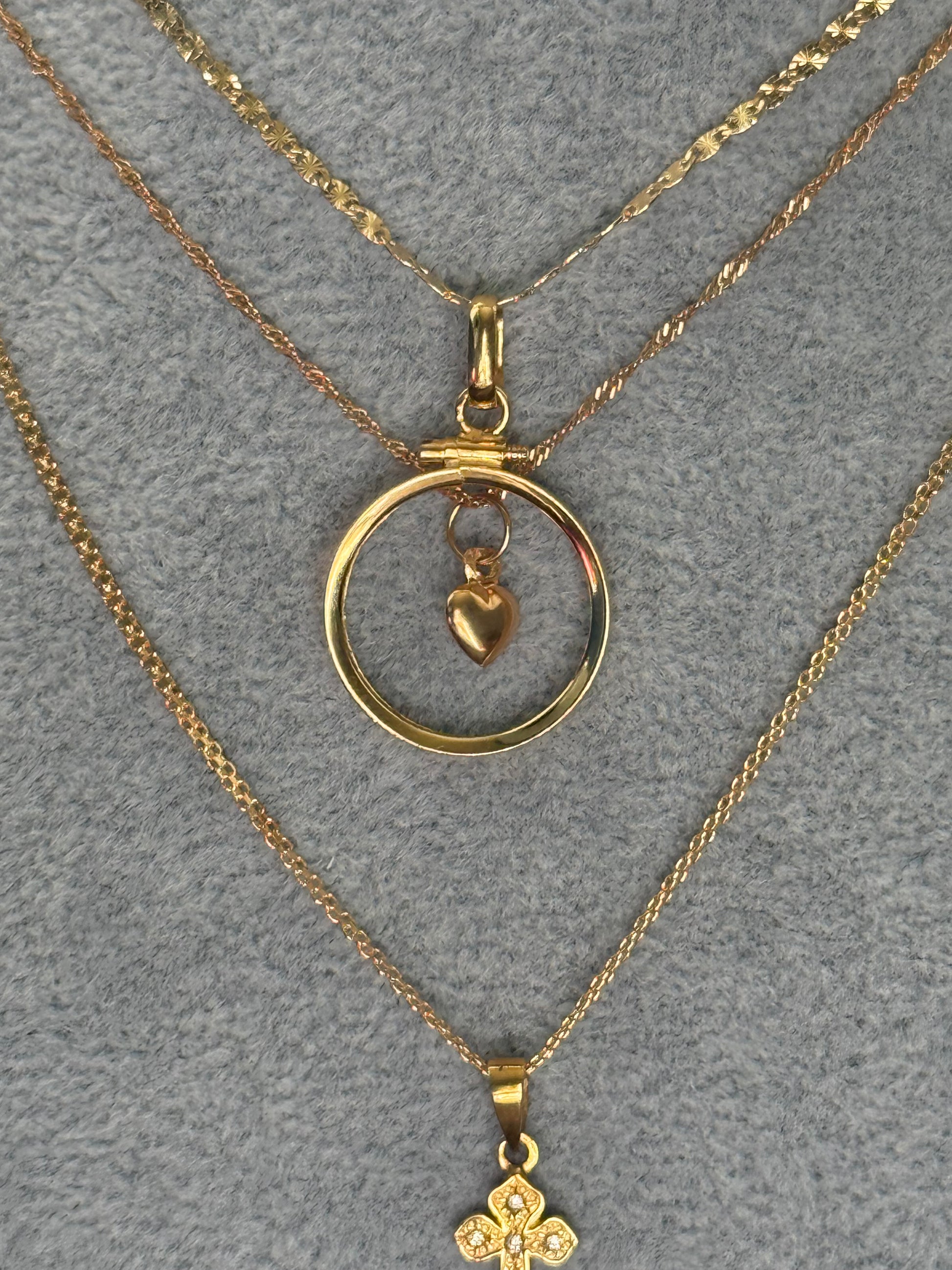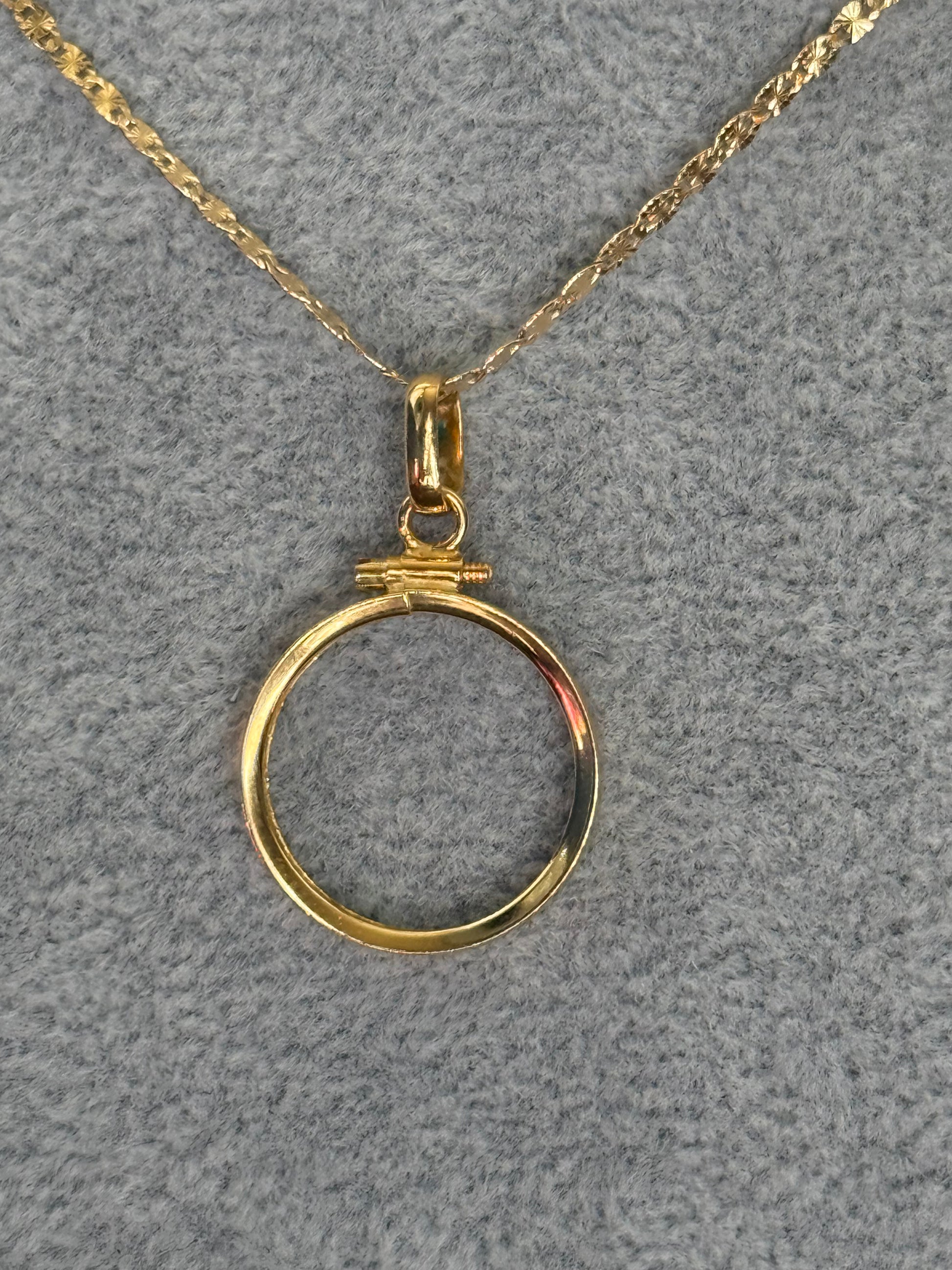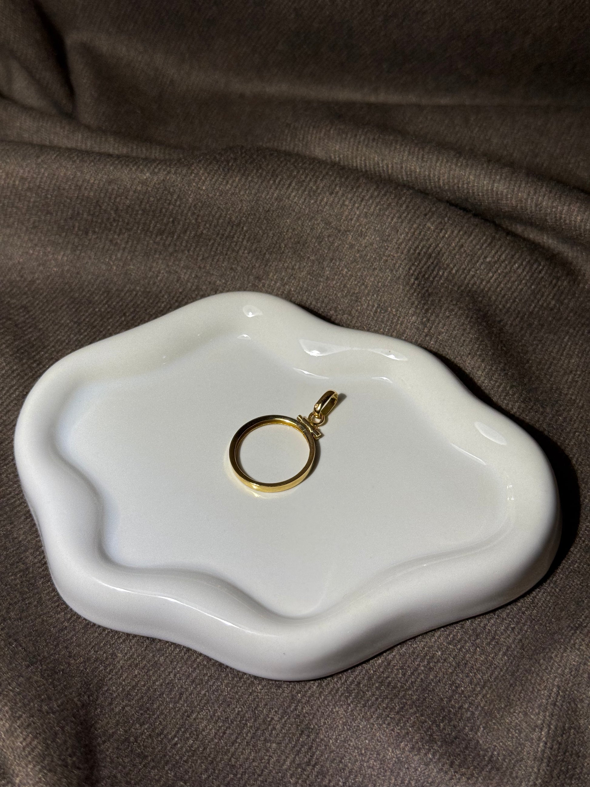 Este pendente em ouro foi pensado para acolher libras, medalhas ou pequenos talismãs, mas pode também brilhar por si só. Minimalista, sólido e cheio de significado, é a moldura perfeita para o que quiser eternizar.