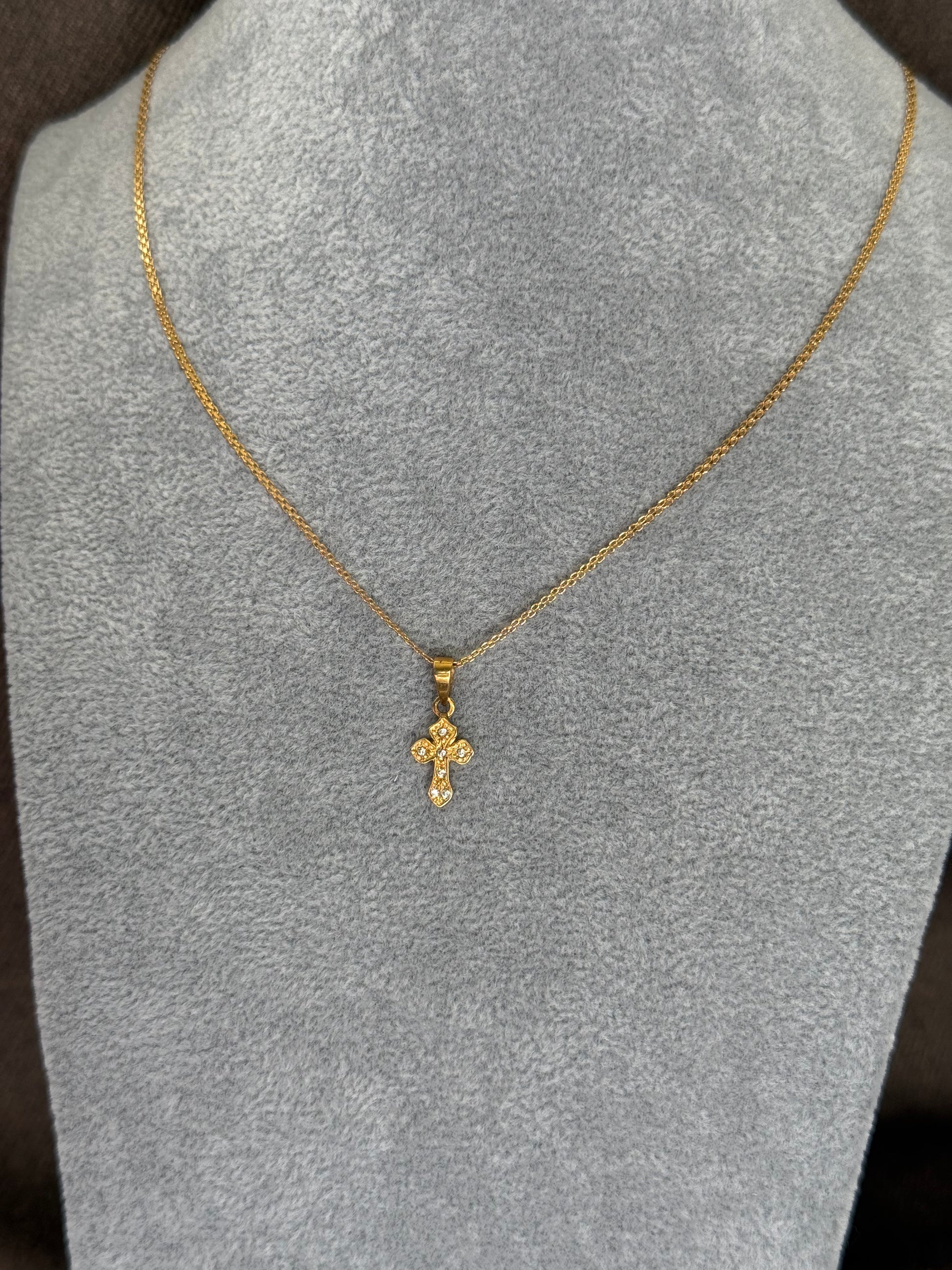 Pendente em ouro em forma de cruz com zircónias cravadas, desenhando subtilmente a figura de Cristo. Uma peça de fé discreta, que conjuga brilho e devoção num traço sereno e intemporal.