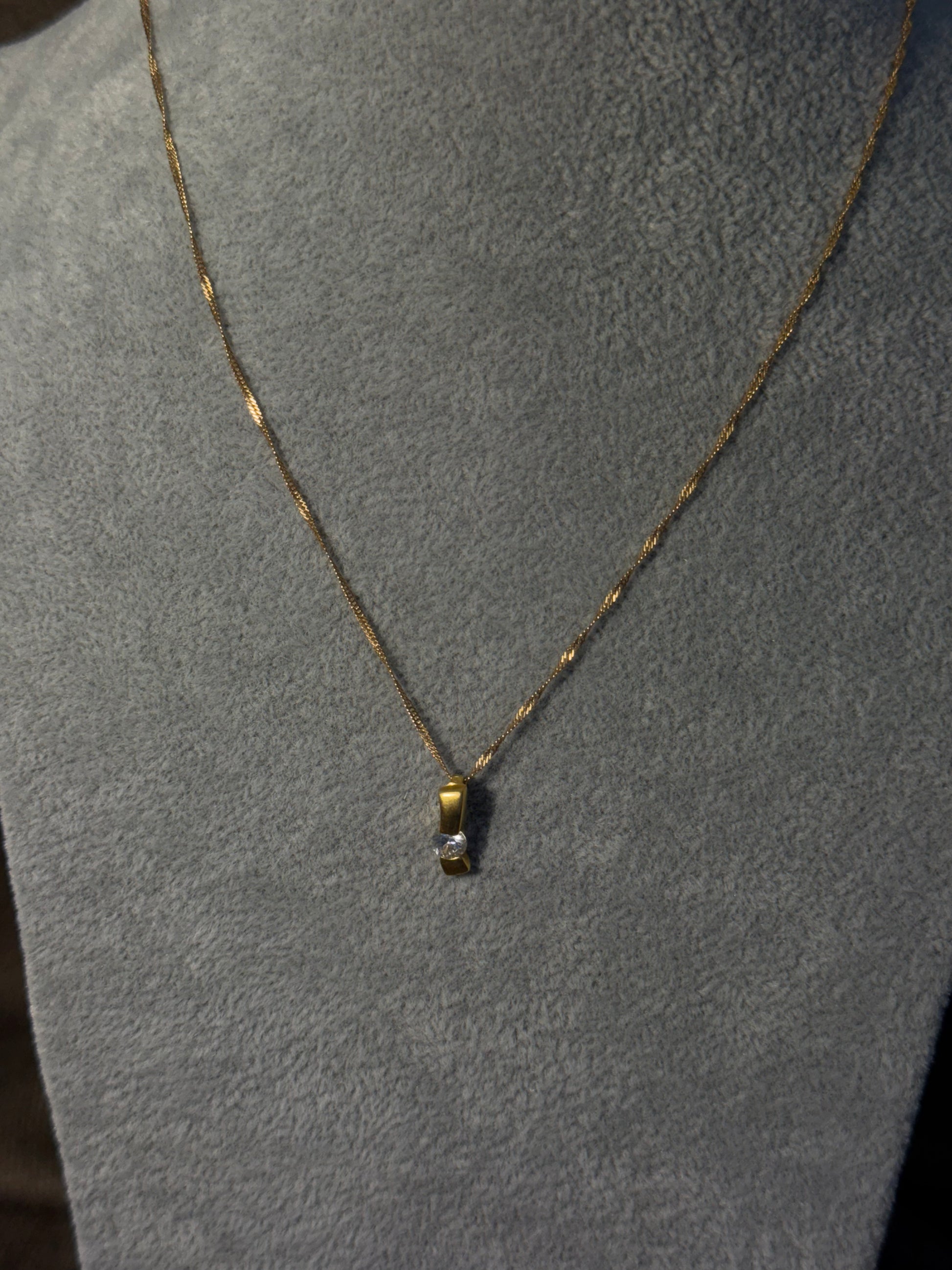 Pequeno e brilhante, este pendente em ouro com uma zircónia central lembra uma estrela solitária no céu escuro. Minimal e luminoso, é um detalhe que capta o olhar com elegância cósmica.