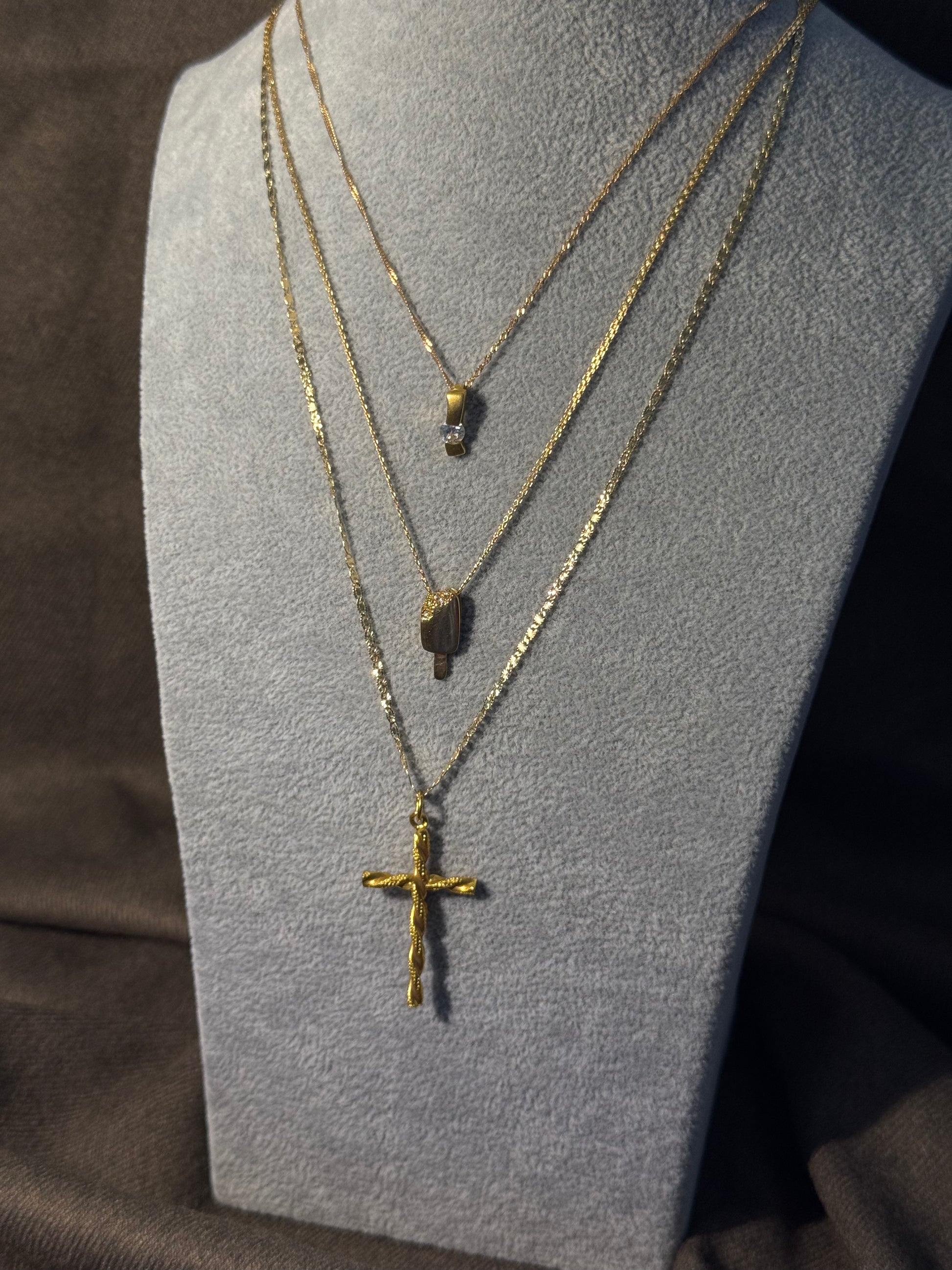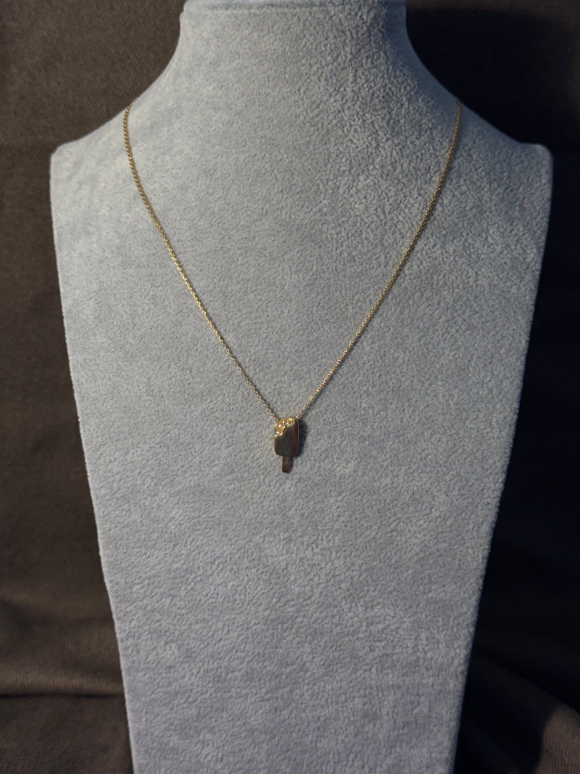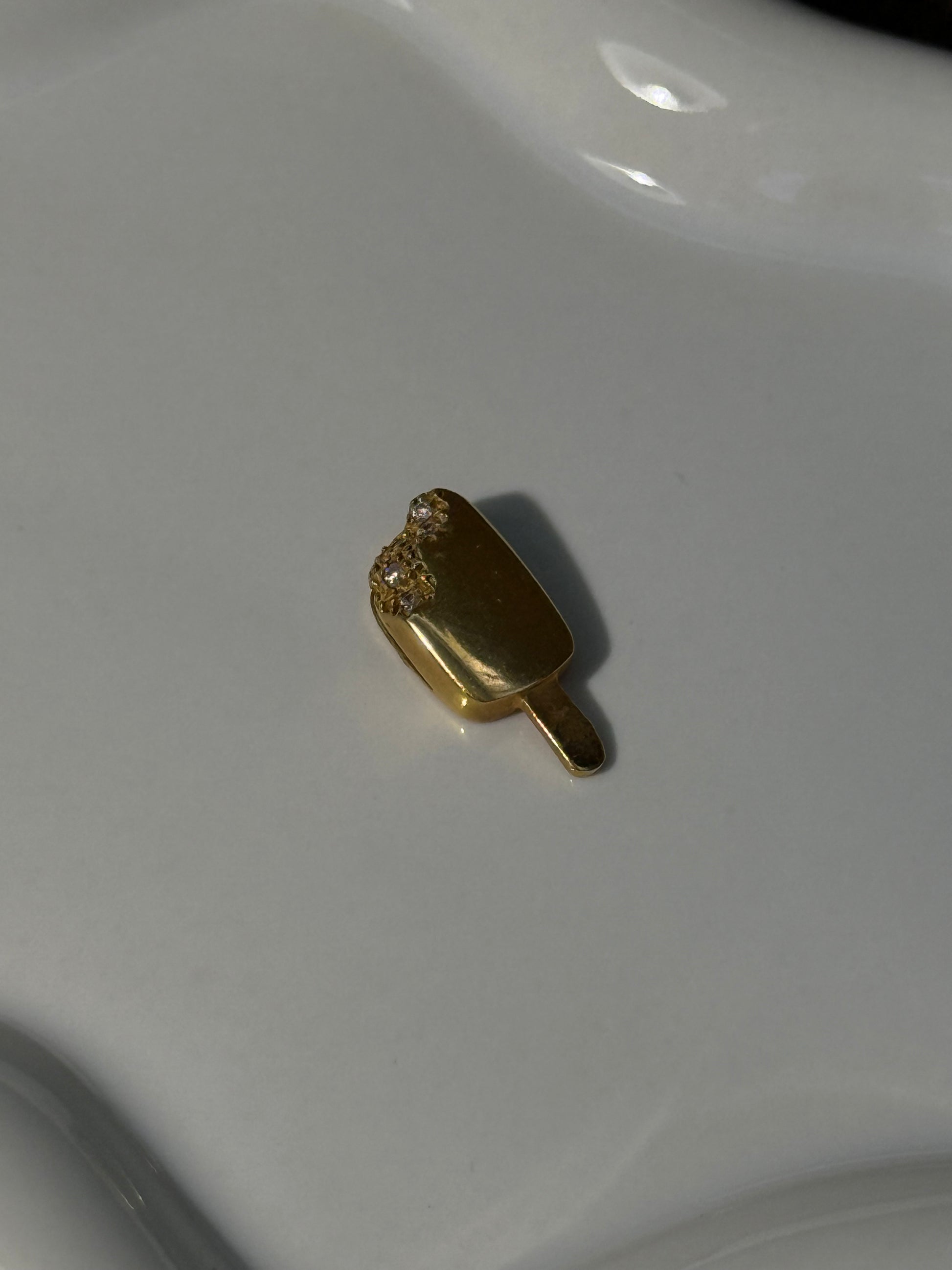 Pendente em ouro com a forma de um gelado mordido, cravejado de zircónias no topo. Uma peça inesperada e lúdica, que mistura humor com brilho, para quem leva a irreverência a sério.