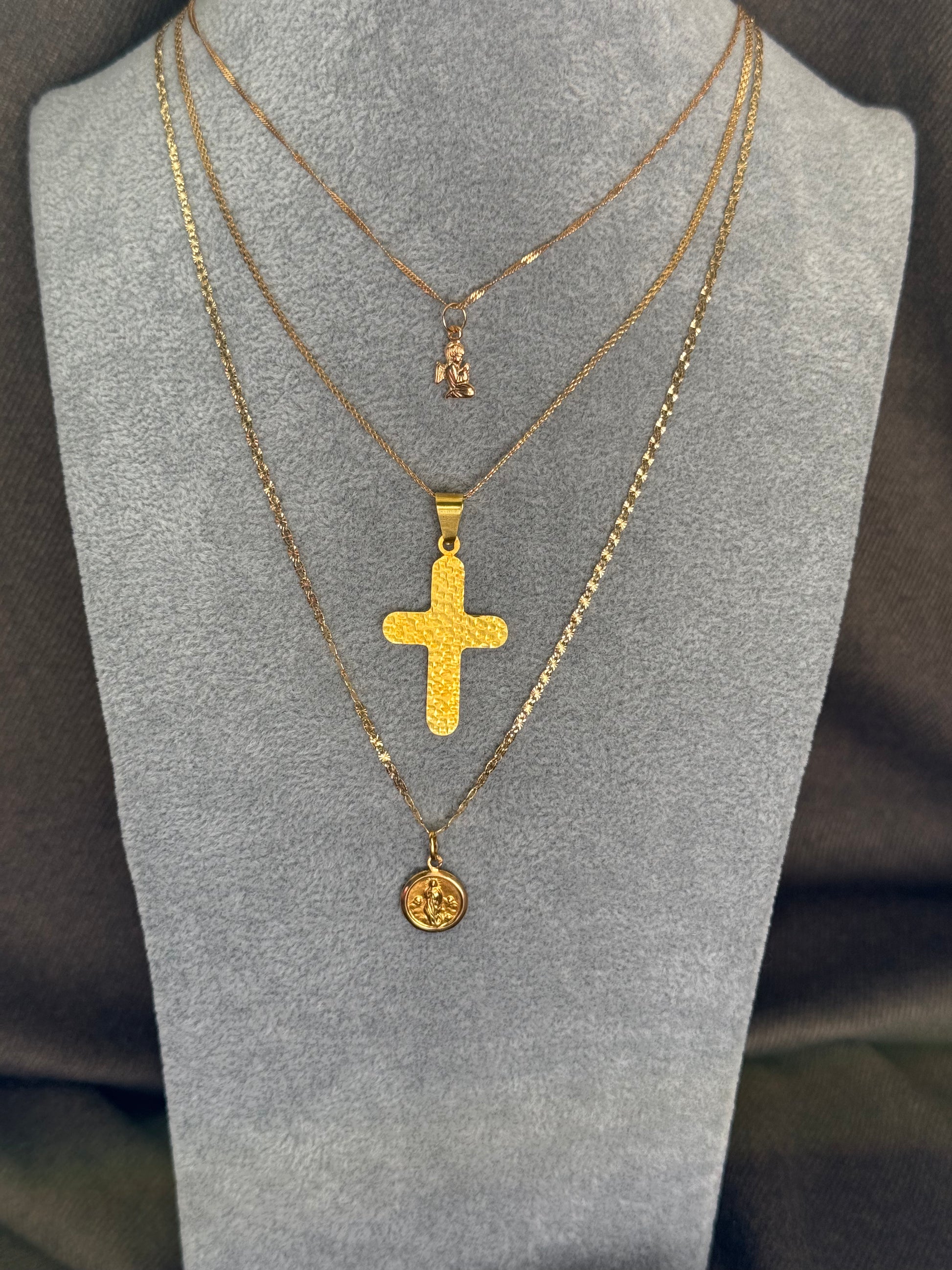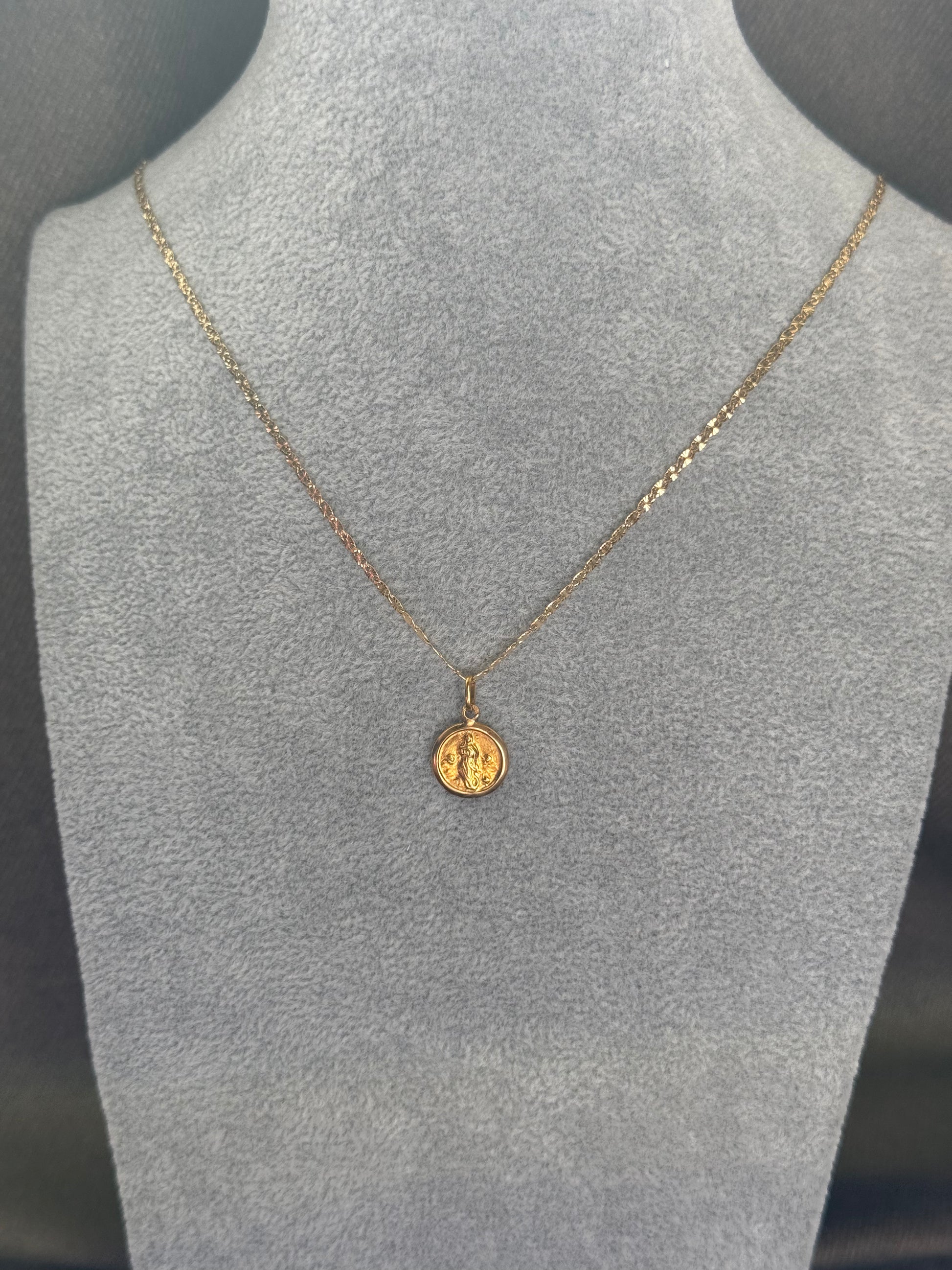 Pendente em ouro com relevo de Nossa Senhora da Imaculada Conceição entre anjos celestes. Uma peça sagrada e simbólica, feita para guardar fé e devoção junto ao peito — com beleza, significado e intemporalidade.