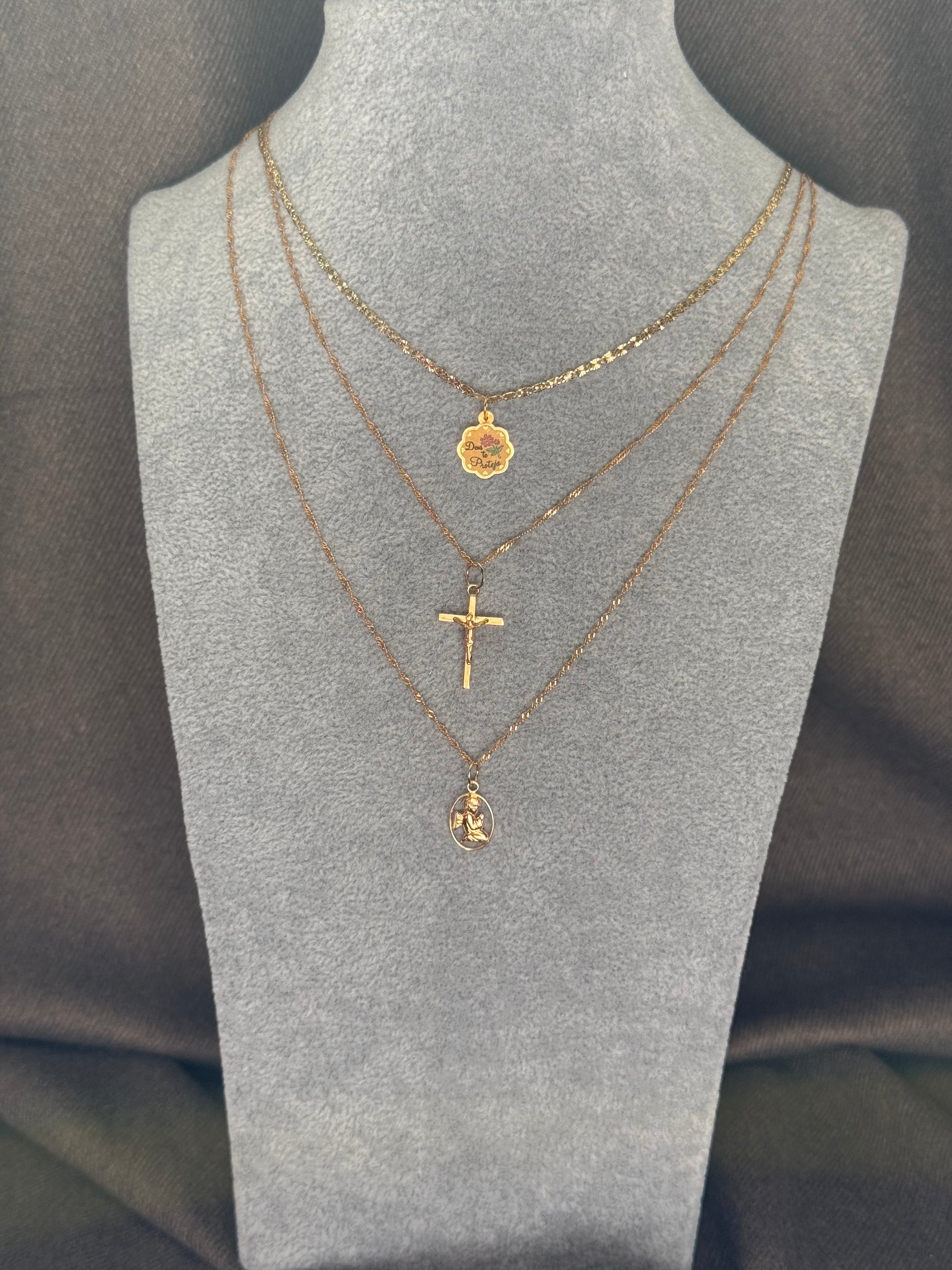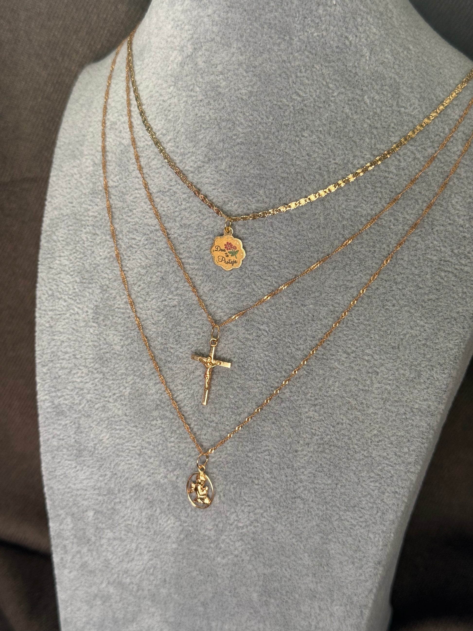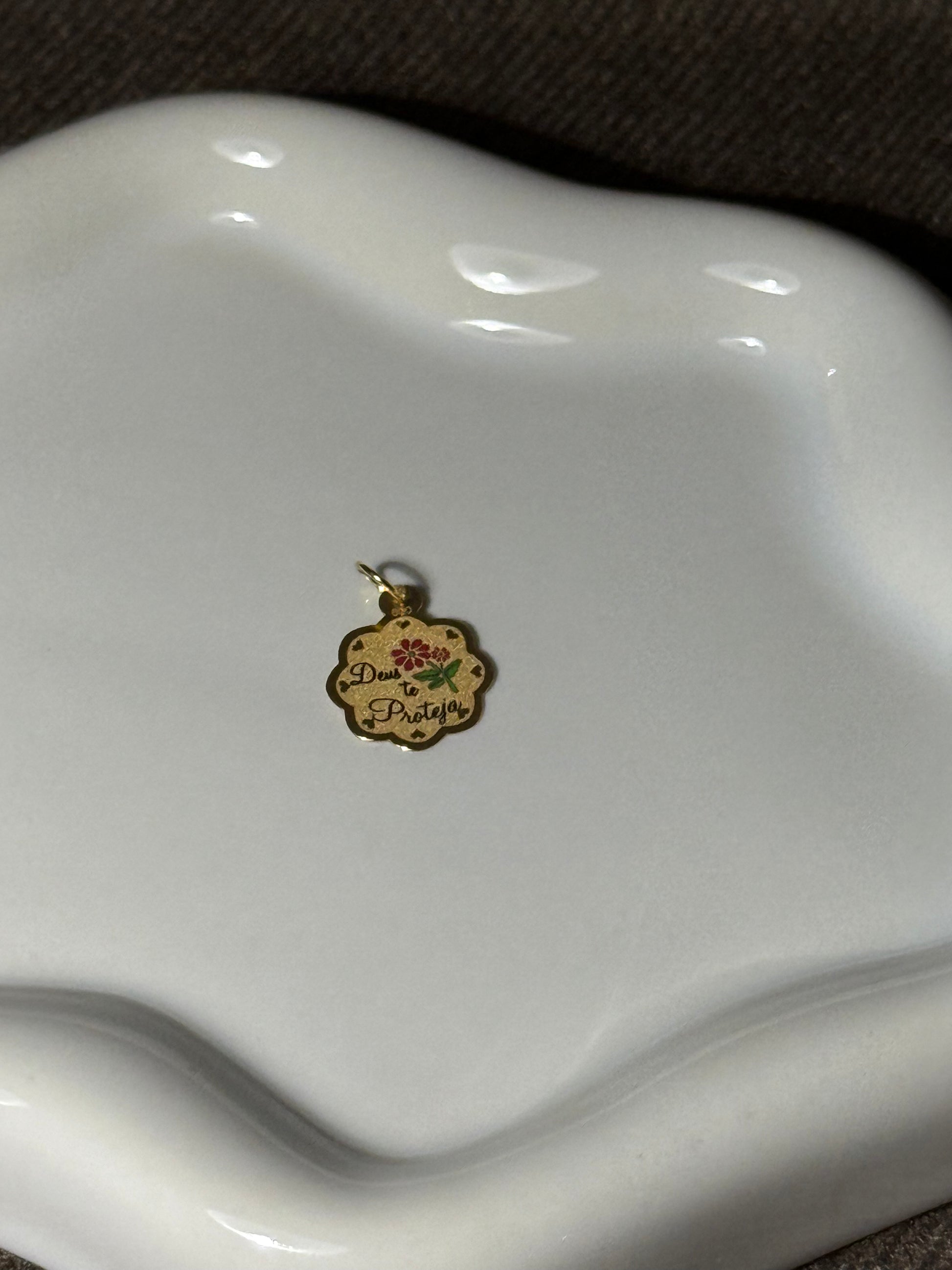 Pendente em ouro com inscrição “Deus te proteja” e detalhe floral esmaltado, pensado como uma promessa de luz e proteção constante. Um gesto íntimo e simbólico, para oferecer ou guardar junto ao peito.