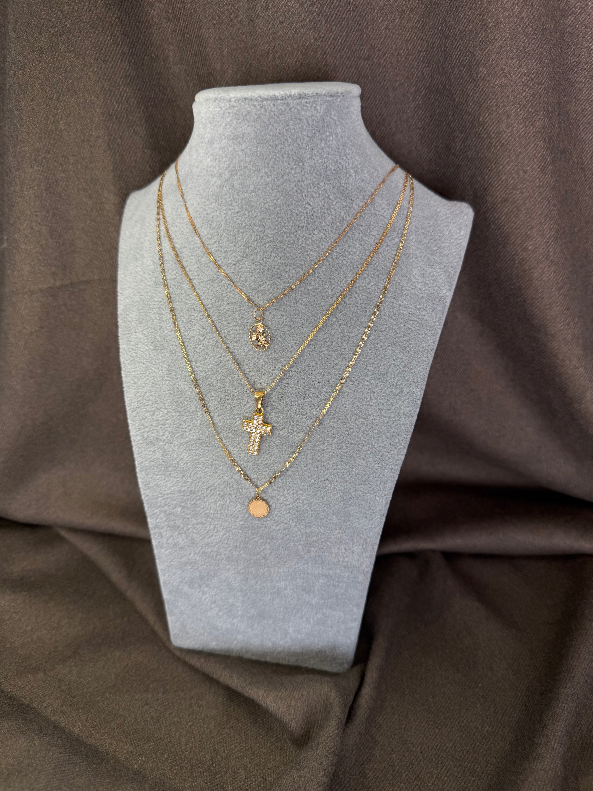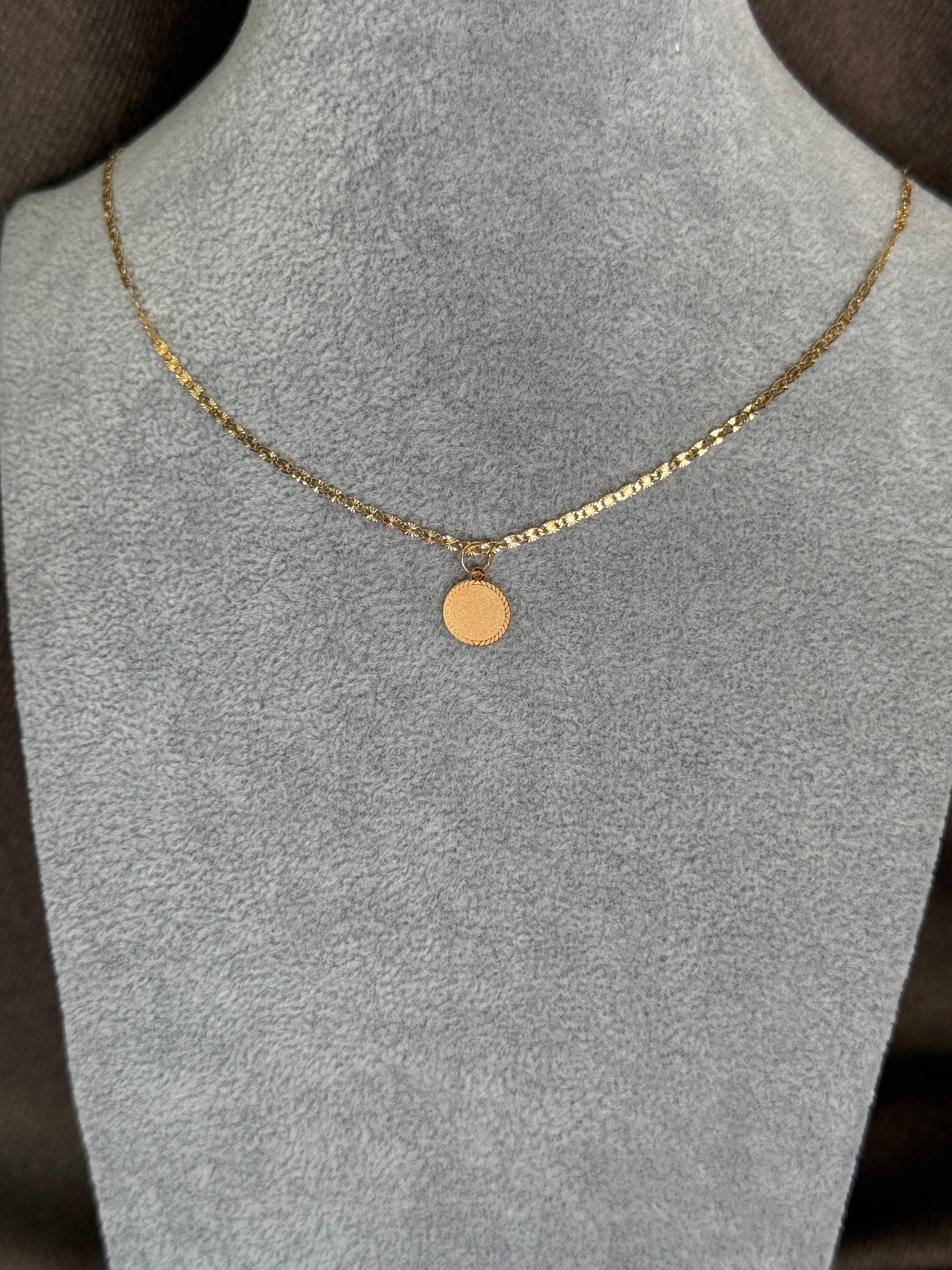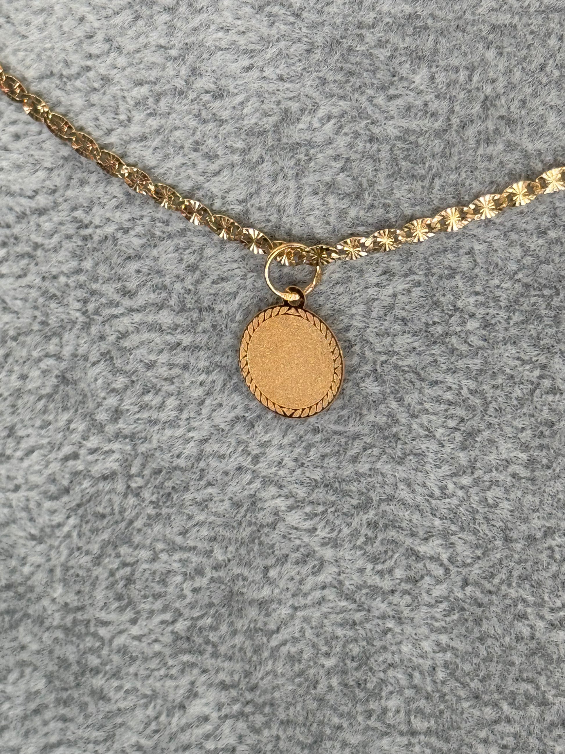 Pendente em ouro de forma circular com rebordo decorado, ideal para ser usado tal como é ou gravado com uma mensagem pessoal. Uma peça silenciosa e cheia de possibilidades, como uma folha guardada junto ao peito.