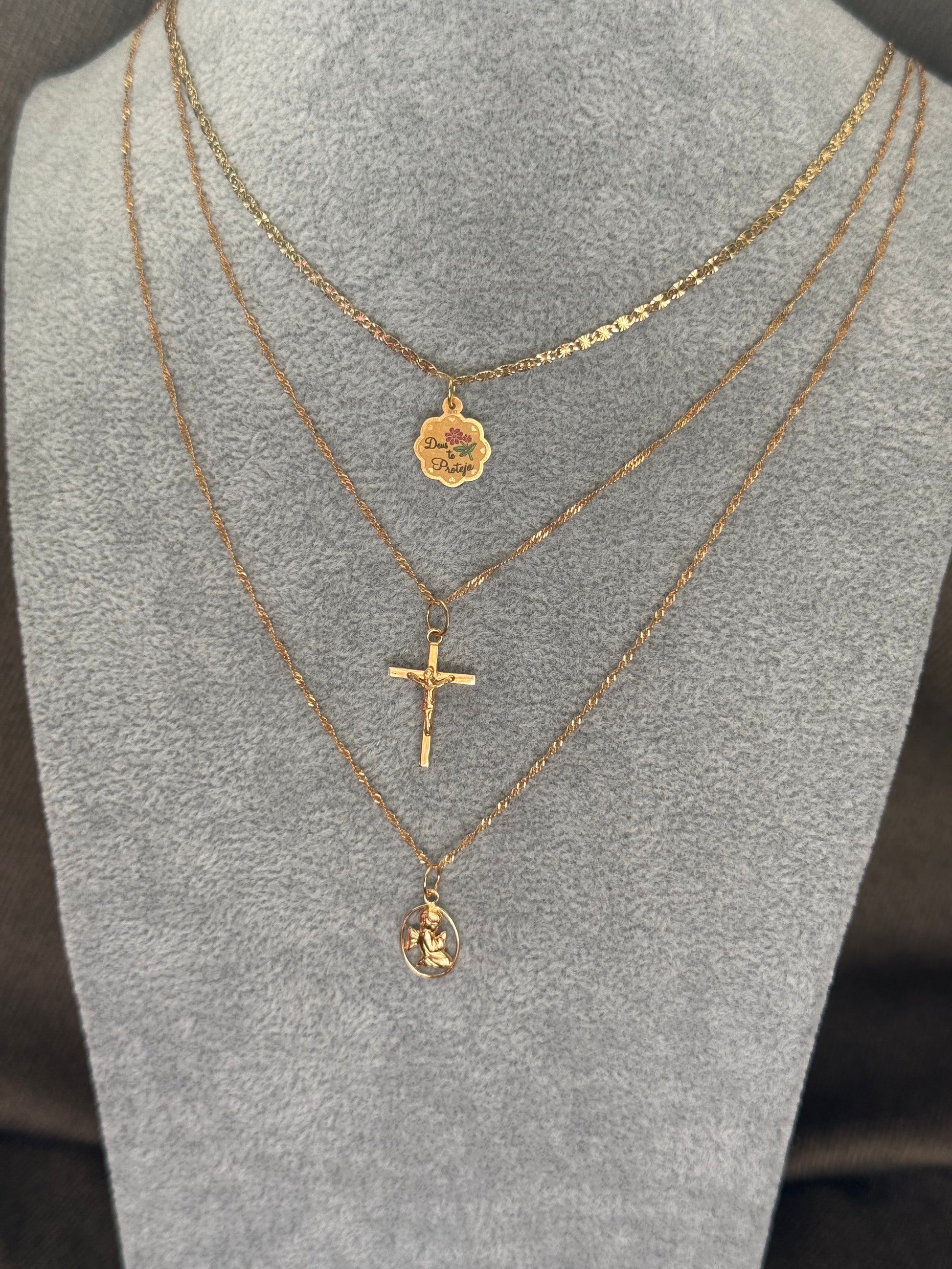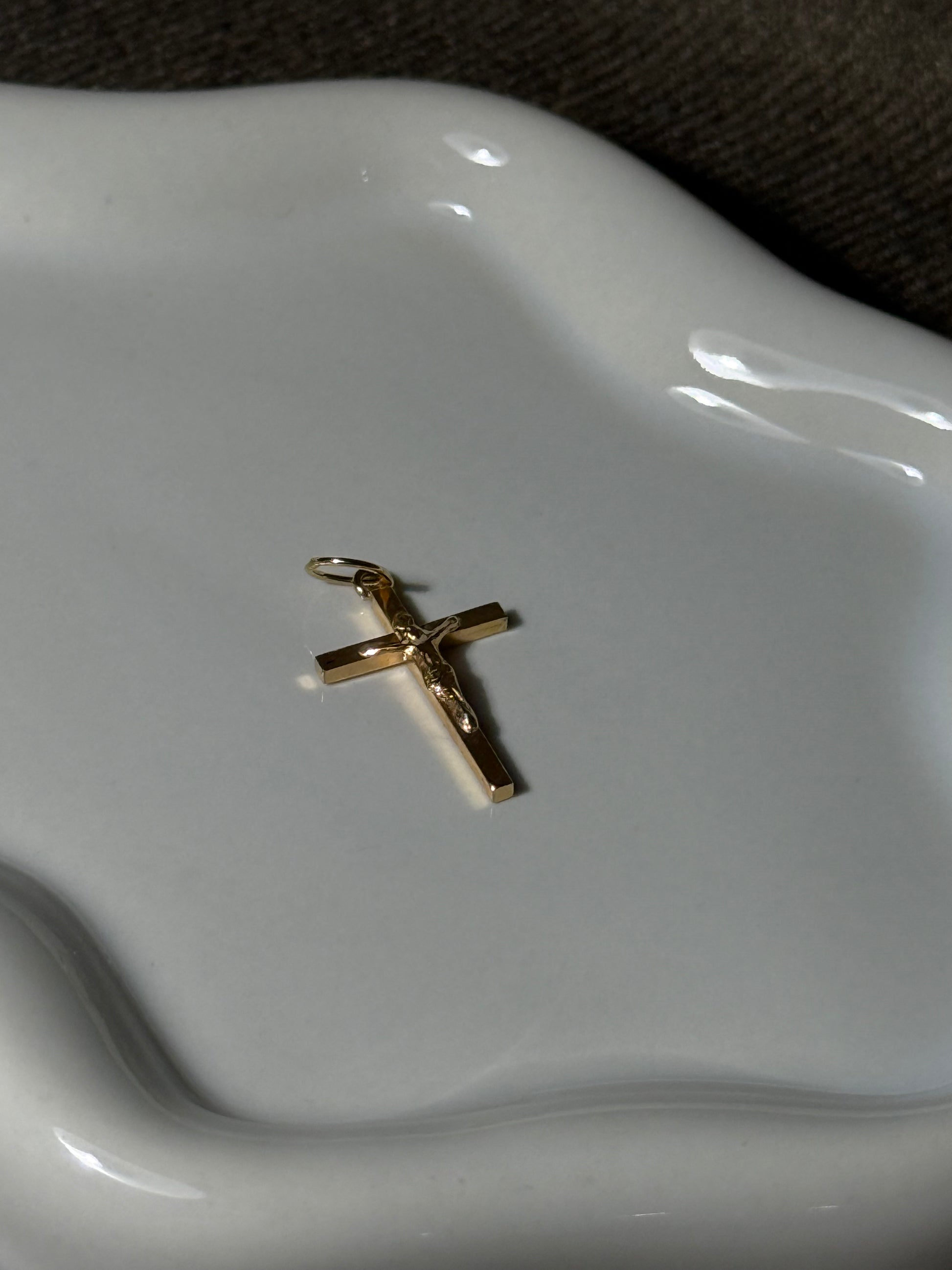 Pendente em ouro com a figura de Cristo crucificado, numa cruz de linhas sólidas e depuradas, retangulares. Uma peça de devoção intemporal, pensada para quem carrega a fé com simplicidade, presença e reverência.