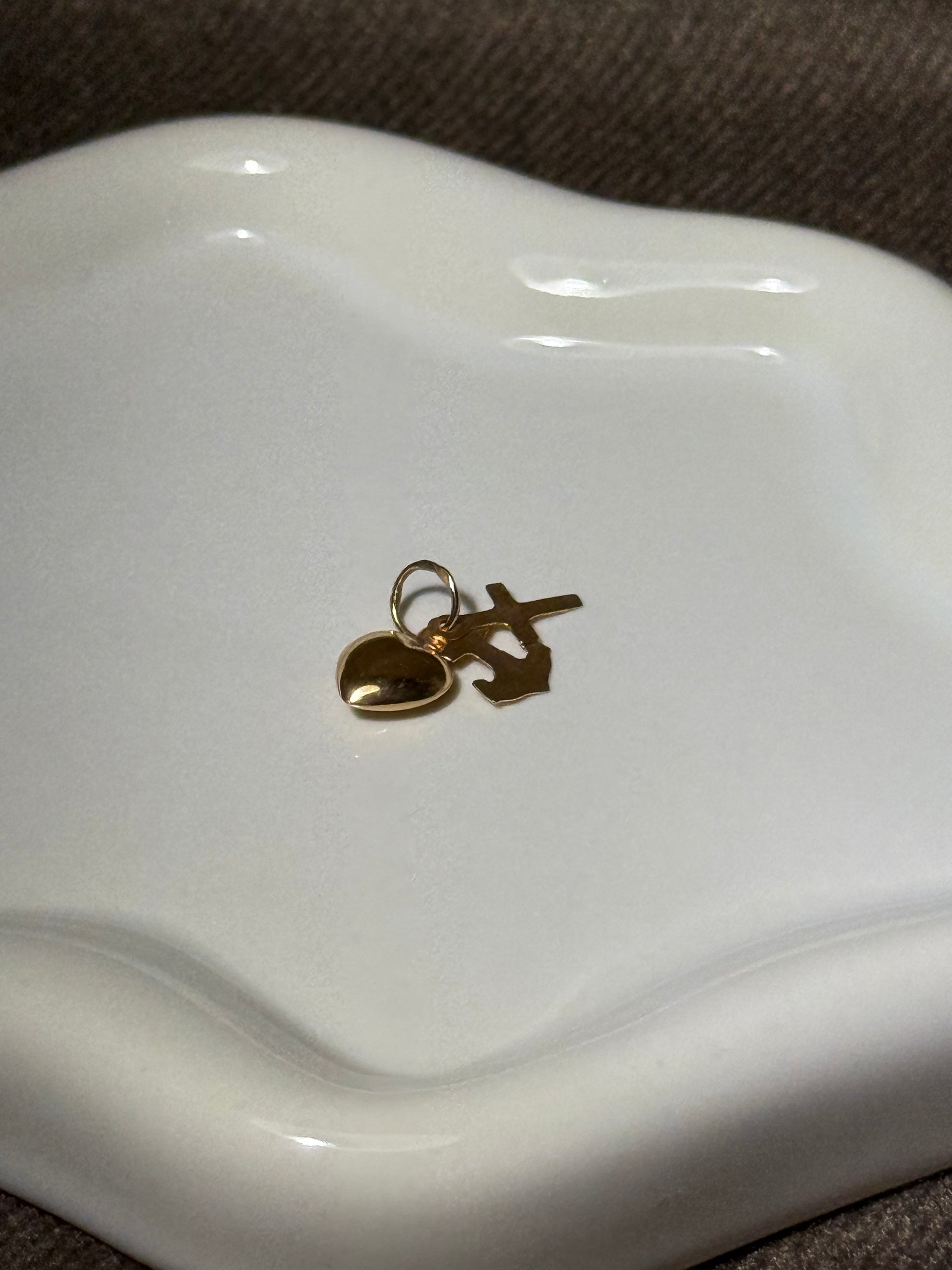 Pendente em ouro com uma cruz, uma âncora e um coração. uma fusão de fé, esperança e amor. Ícones intemporais reunidos numa composição leve, feita para acompanhar o dia a dia com significado e intenção.