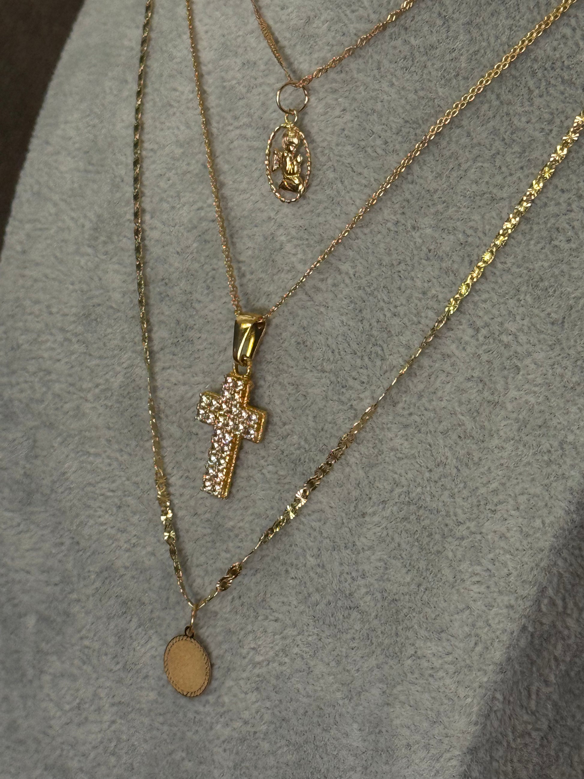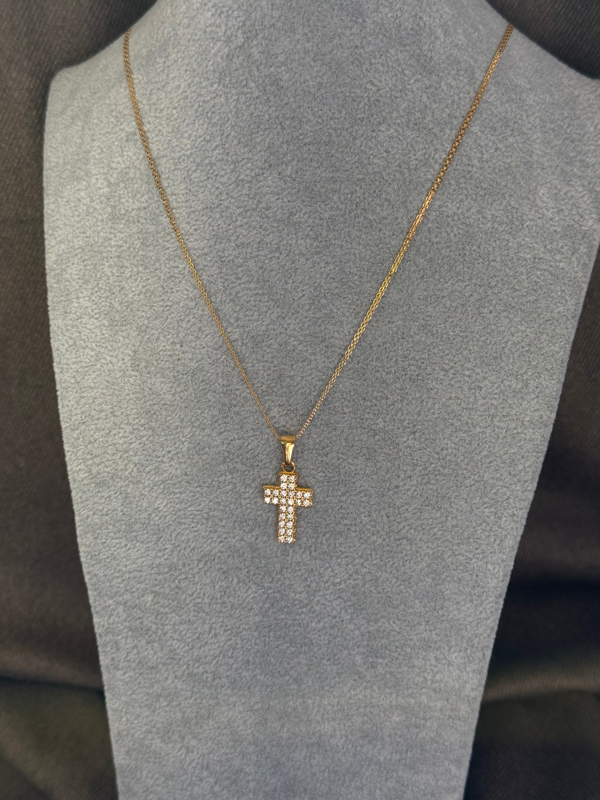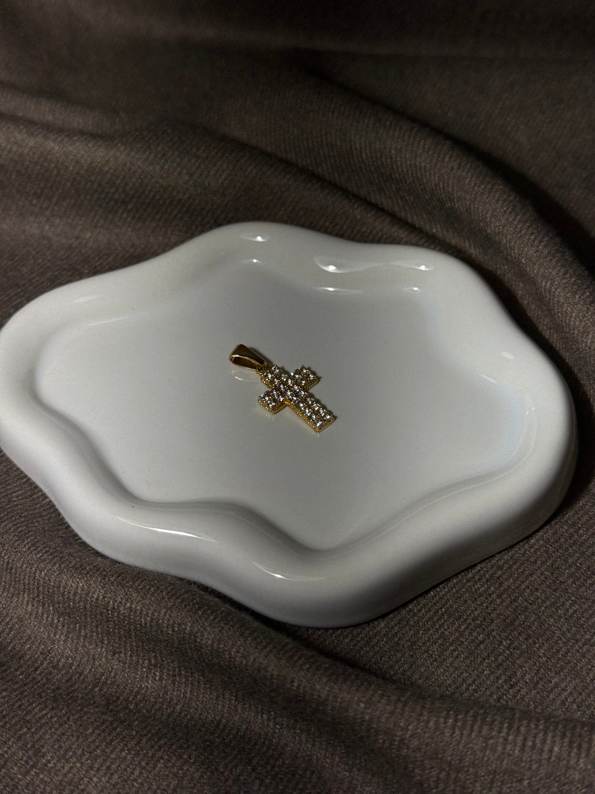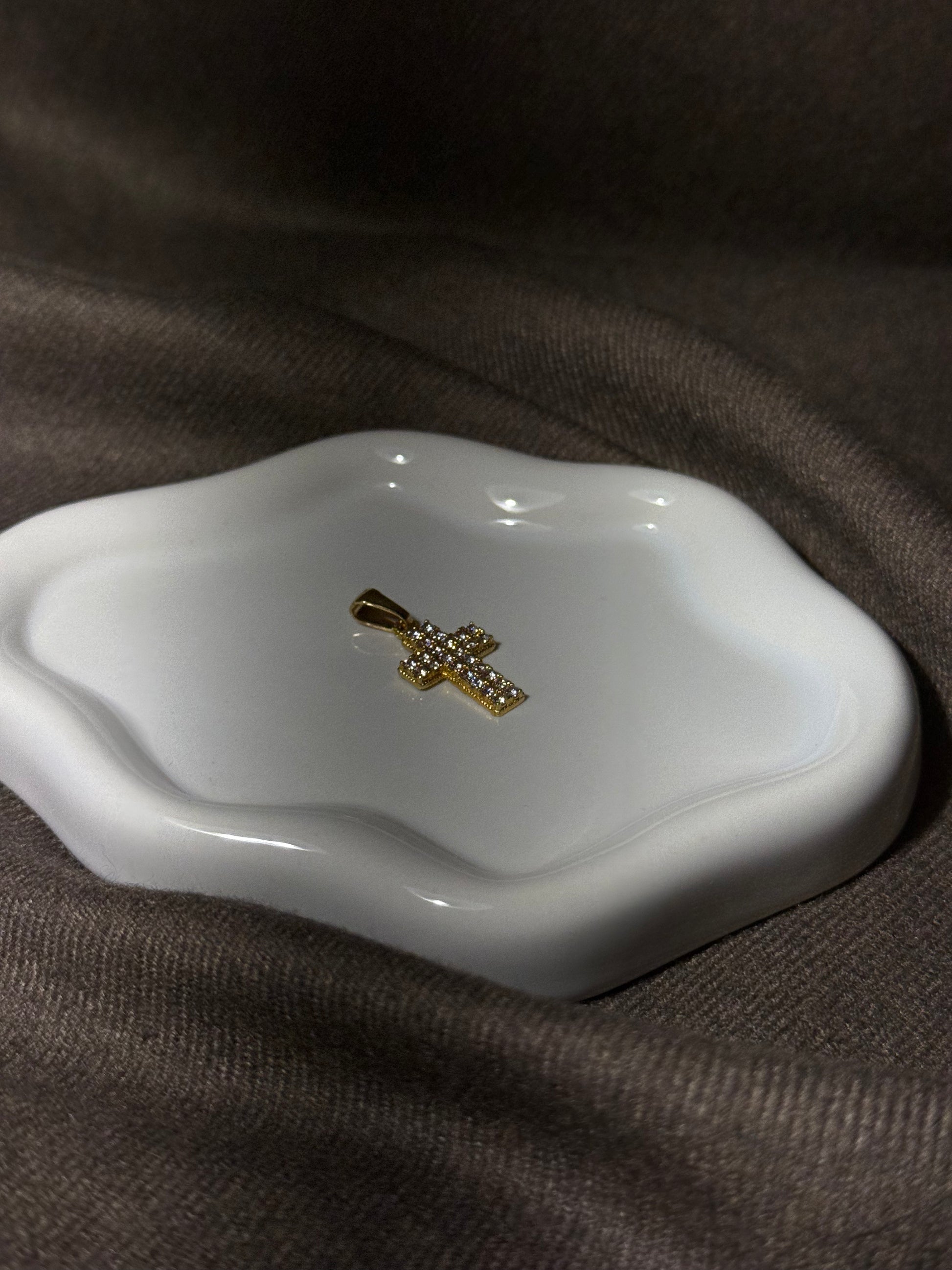 Uma cruz em ouro coberta por zircónias minuciosas, que refletem a luz em várias direções. Apesar do tamanho, a peça destaca-se pela intensidade luminosa e pelo desenho limpo e direto.