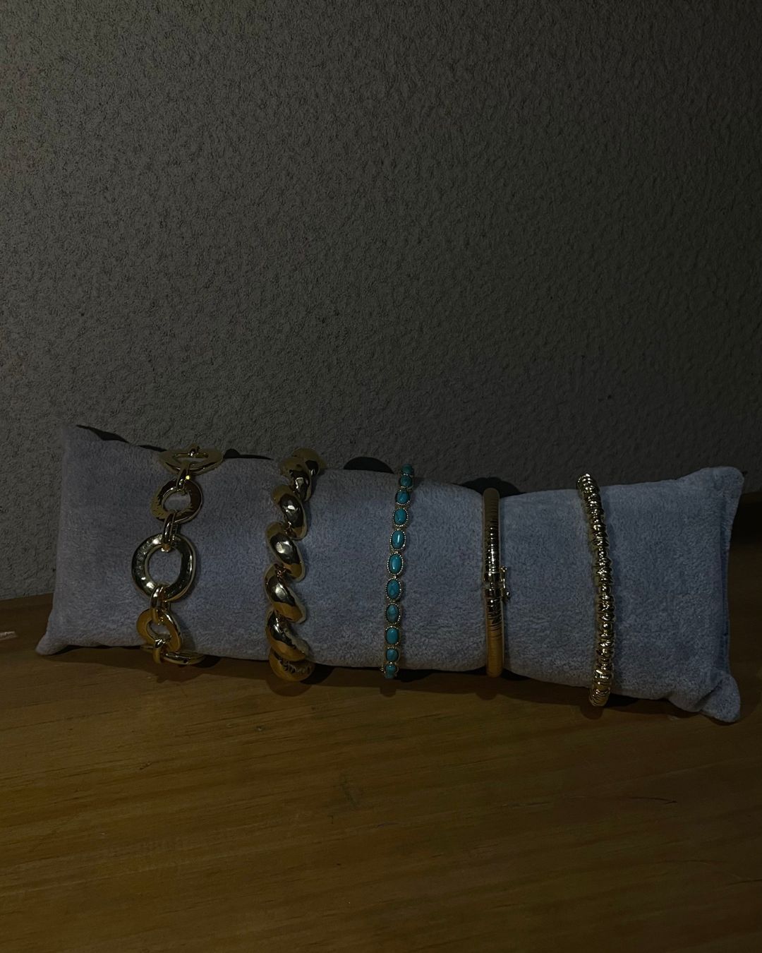 Composta por pedras azuis engastadas em bronze banhado a ouro, esta pulseira celebra a harmonia entre a natureza e a história. A intensidade do azul contrasta com o brilho dourado, criando uma peça que transmite serenidade e força em simultâneo.
