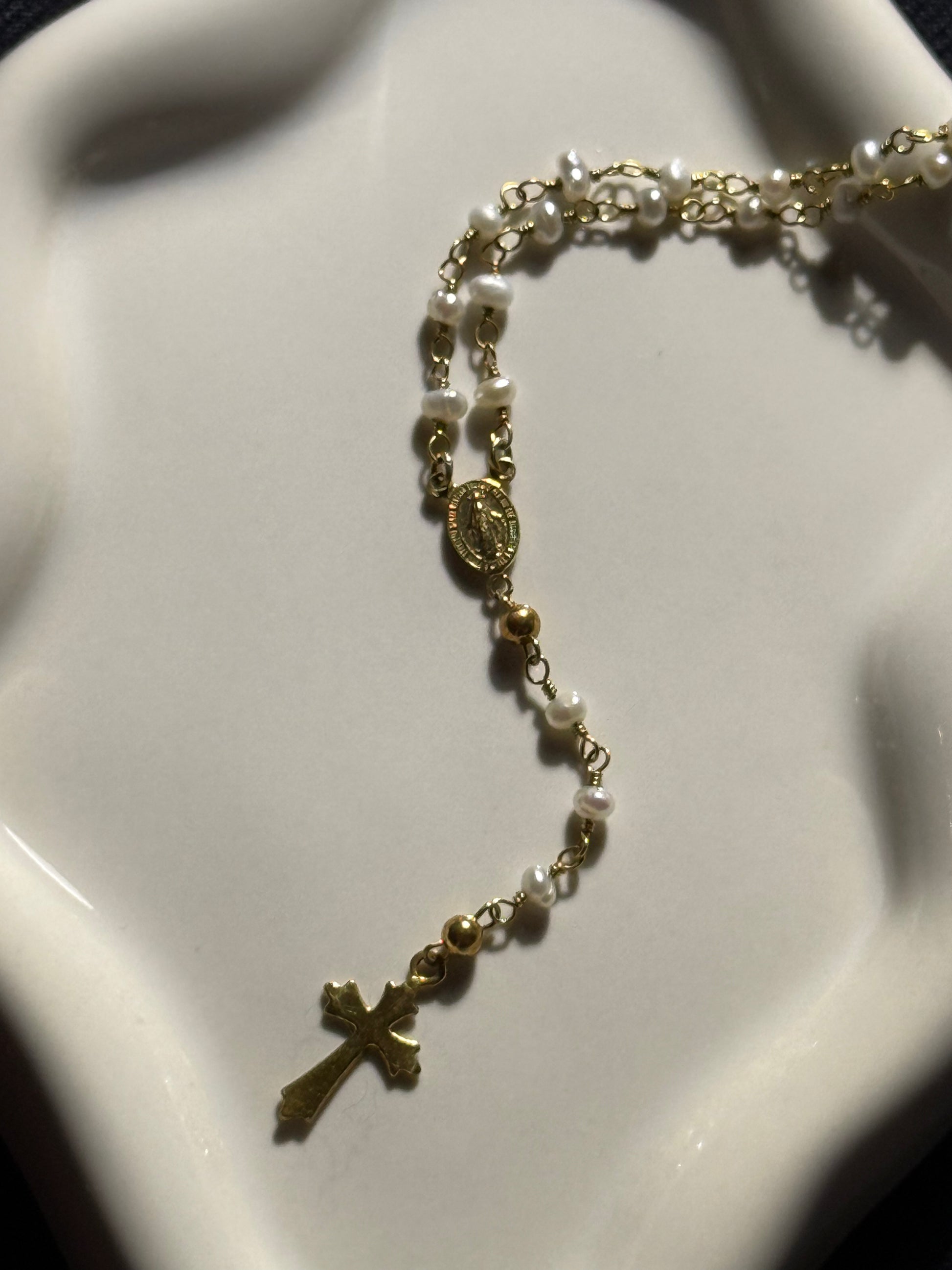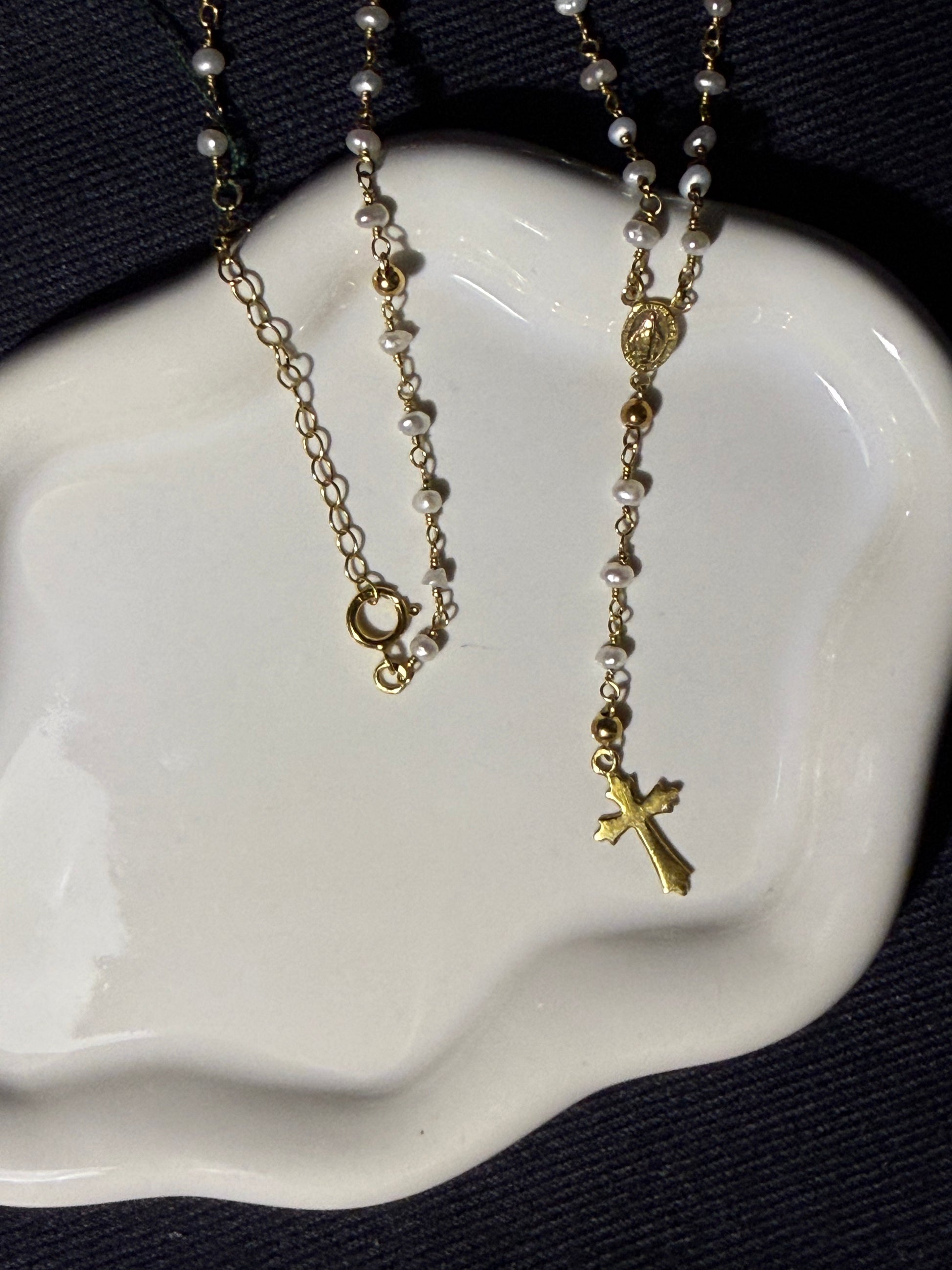 O colar Rosário celebra a tradição com uma delicadeza contemporânea. Com pequenas pérolas interligadas por prata e um crucifixo trabalhado com detalhe e leveza, esta peça é ideal para quem deseja carregar consigo um amuleto de proteção com um toque de luxo subtil.